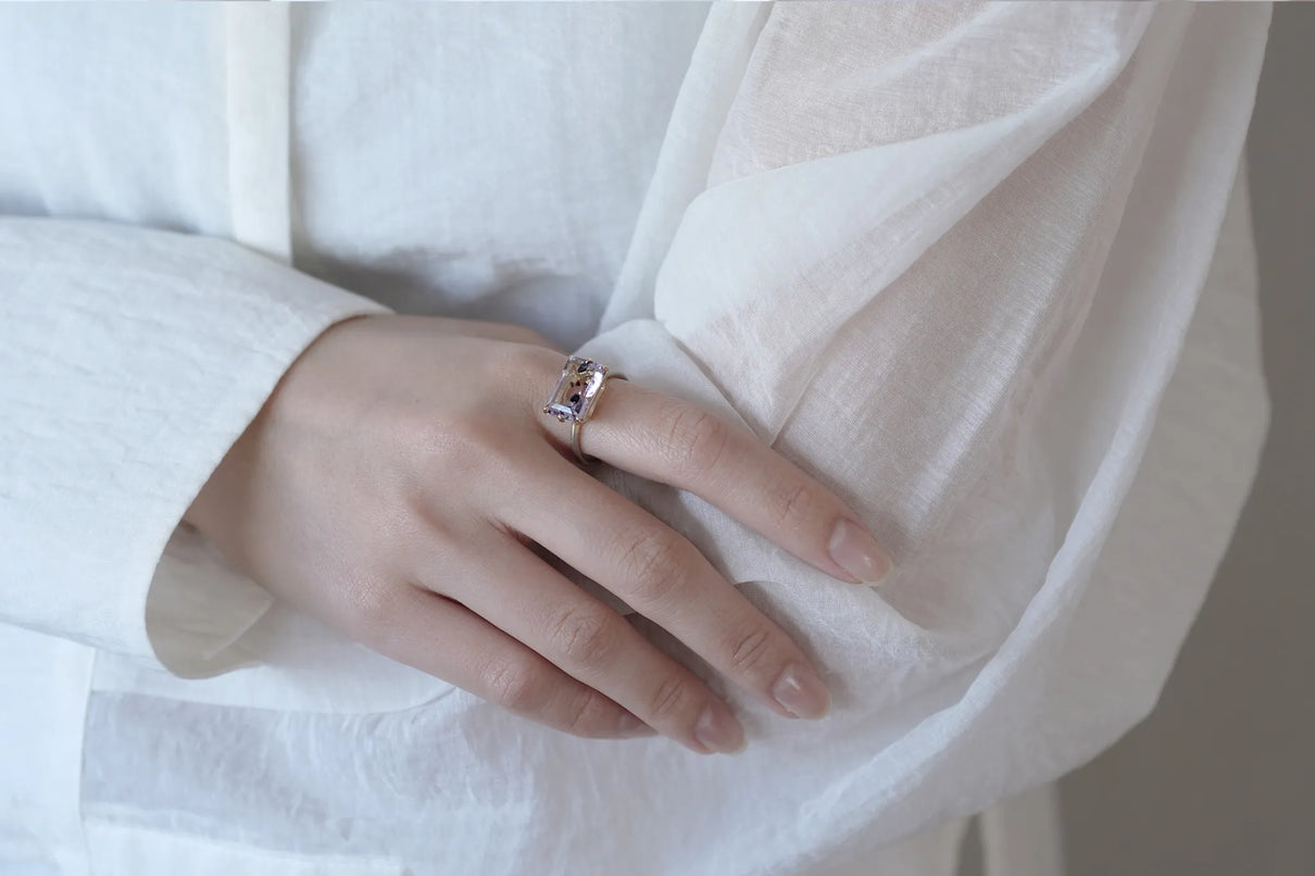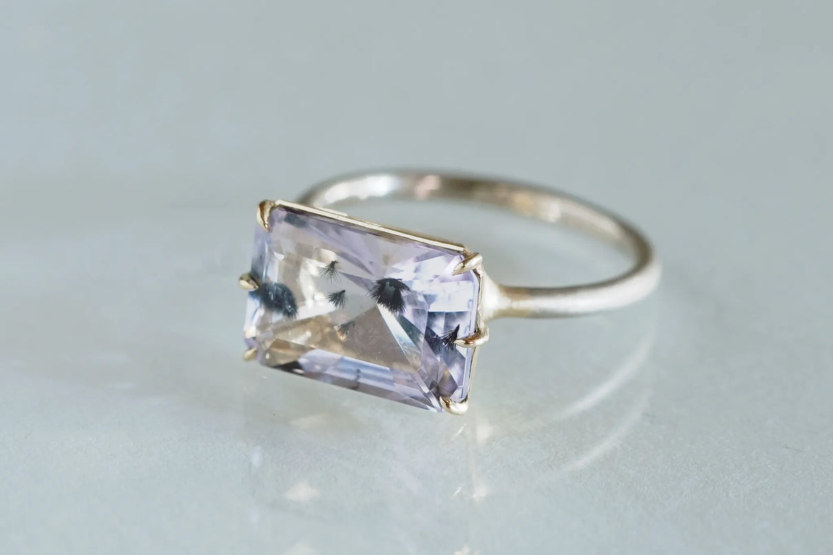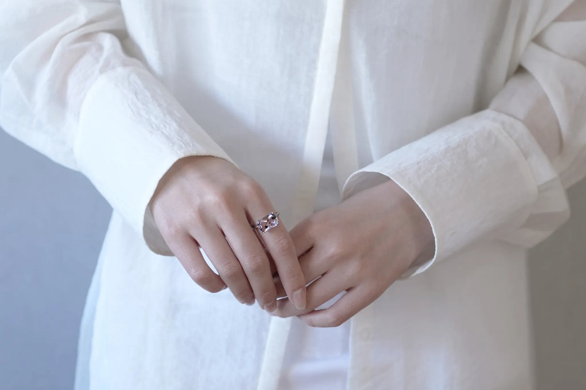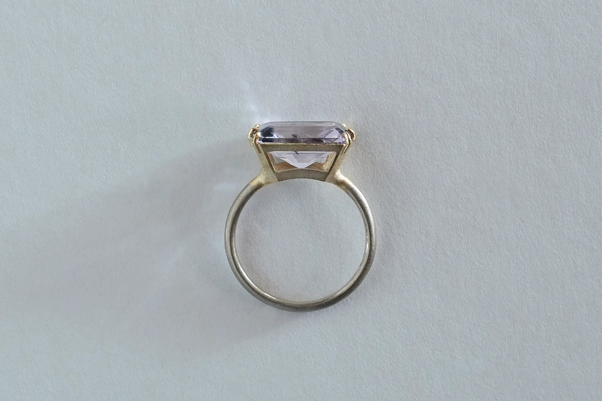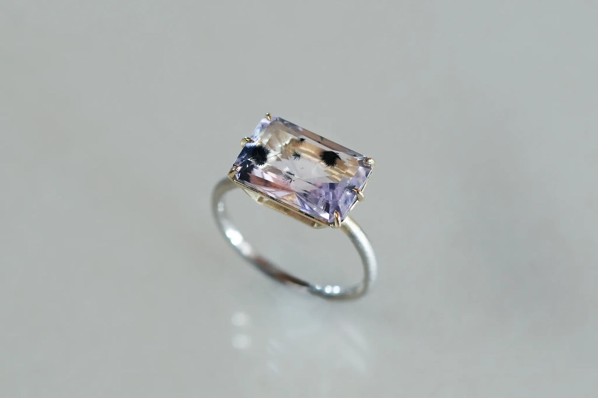 高品質で希少性の高いロマネサイトインアメジストで仕立てた一点もののリング。ロマネサイトは、"ロマネシュ鉱"と呼ばれる黒い金属光沢を持つ鉱物で、水晶などに共生することは非常に稀です。こちらのピースは、インクルージョンの姿を隅々まで観察できる淡く上品な色合いと高い透明度を有する、大変稀有な一点。大きさの異なるロマネサイトが絶妙な距離感で漂い、よく見ると層を違えて行儀良く整列した小さな三つの結晶がひと匙の愛らしさを纏わせ、二つとない個性を引き立てています。この希少なアメジストを支えるK18イエローゴールドの石座から続くリングアームが、なだらかな境界を描きながらK18ホワイトゴールドへと姿を変える、一目では気づきにくいそのこだわりの仕立てにもぜひご注目ください。2月の誕生石としても親しまれているアメジスト。2月生まれの方の特別なお守りとしてもお勧めです。
