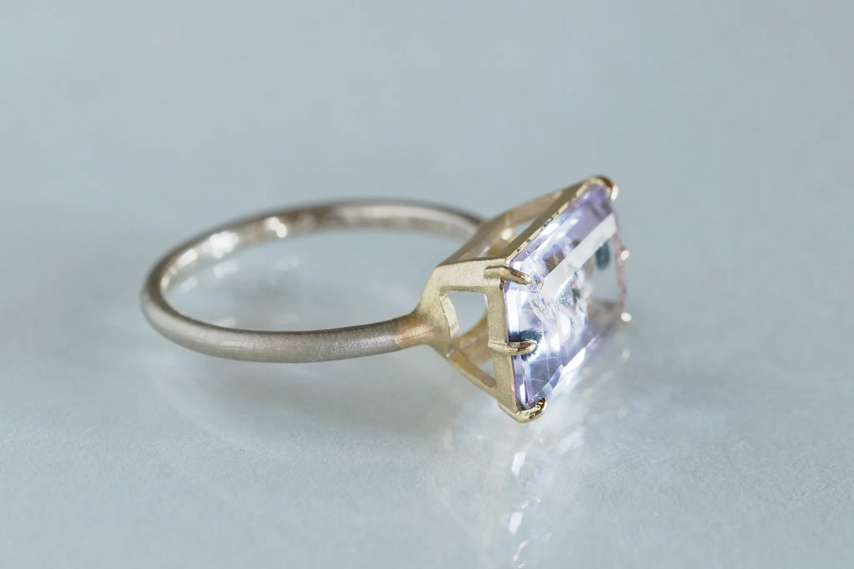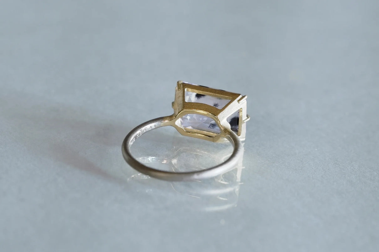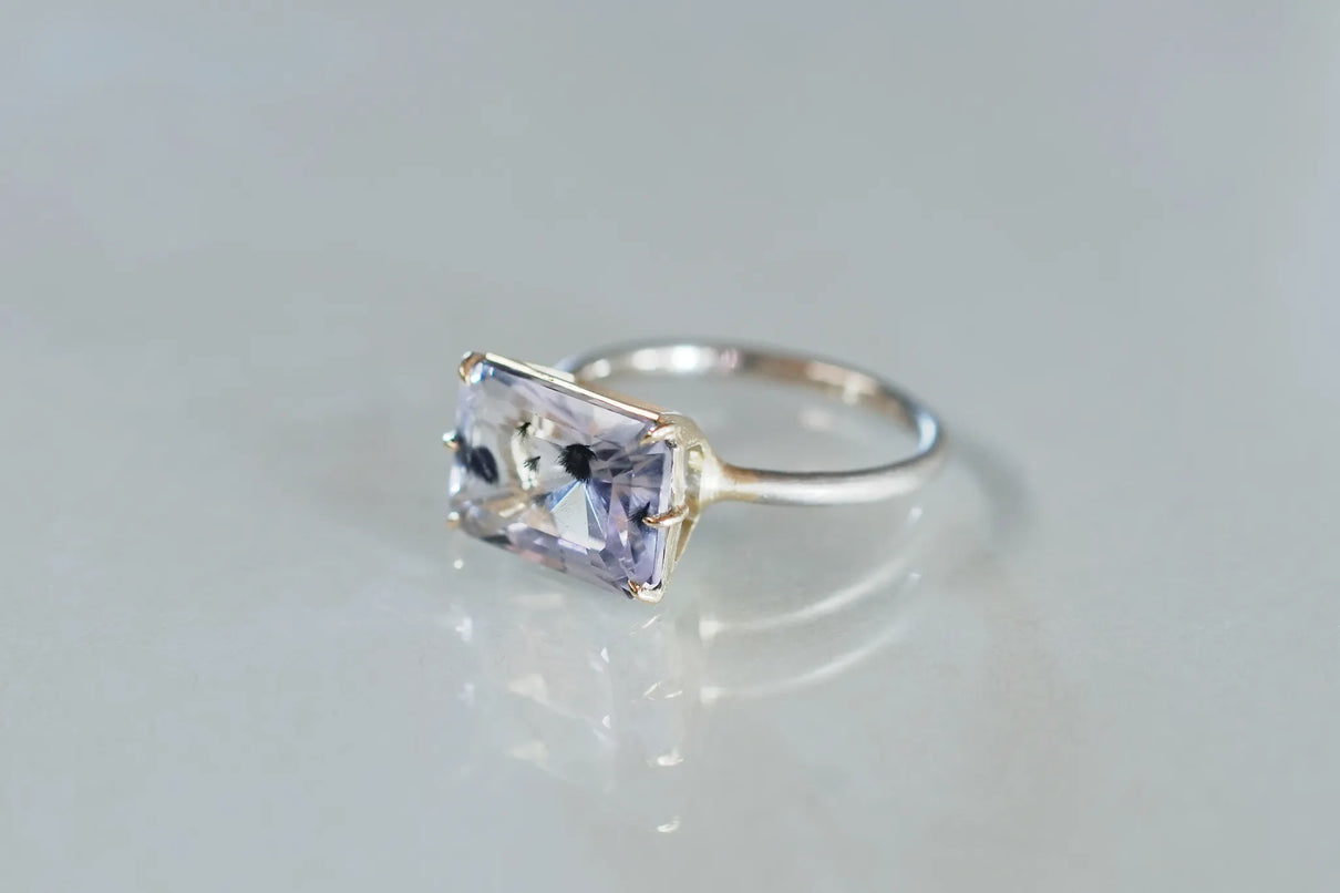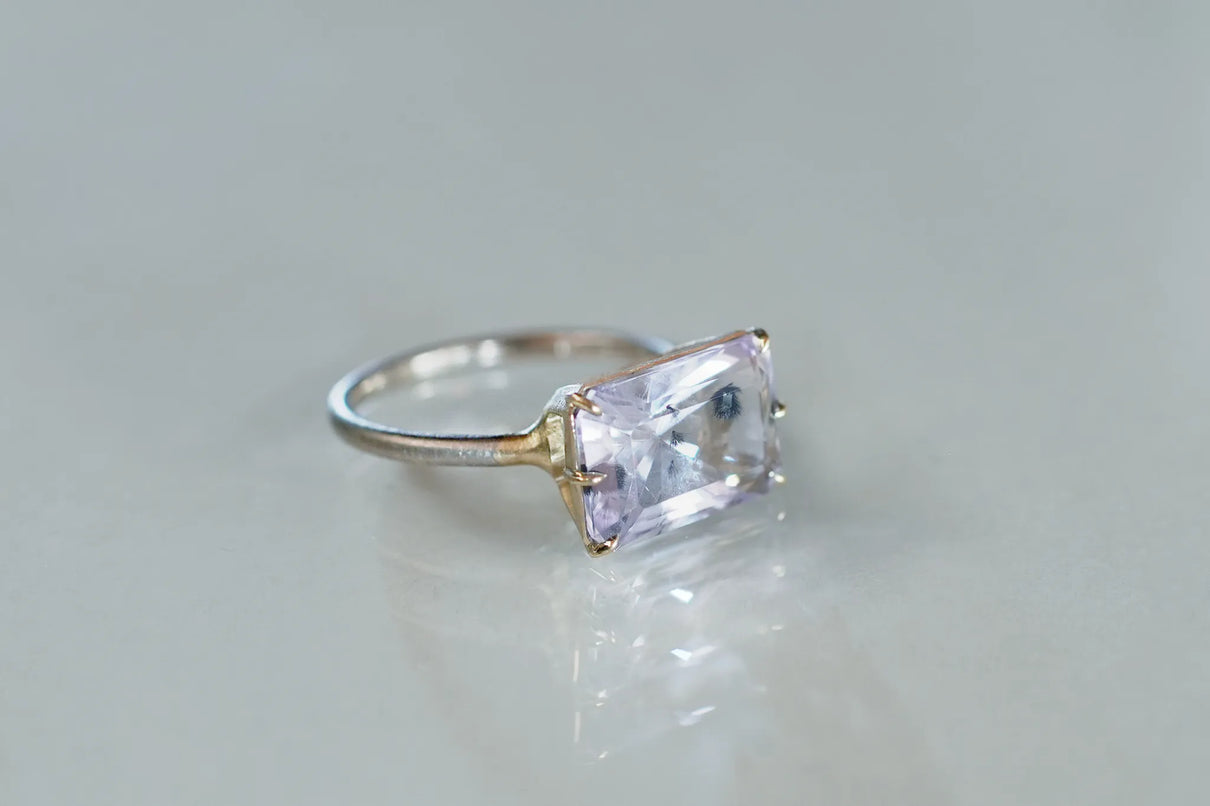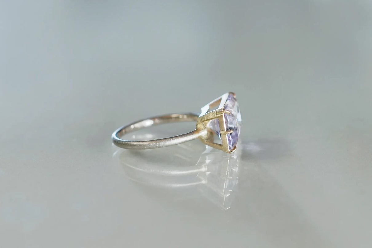 高品質で希少性の高いロマネサイトインアメジストで仕立てた一点もののリング。ロマネサイトは、"ロマネシュ鉱"と呼ばれる黒い金属光沢を持つ鉱物で、水晶などに共生することは非常に稀です。こちらのピースは、インクルージョンの姿を隅々まで観察できる淡く上品な色合いと高い透明度を有する、大変稀有な一点。大きさの異なるロマネサイトが絶妙な距離感で漂い、よく見ると層を違えて行儀良く整列した小さな三つの結晶がひと匙の愛らしさを纏わせ、二つとない個性を引き立てています。この希少なアメジストを支えるK18イエローゴールドの石座から続くリングアームが、なだらかな境界を描きながらK18ホワイトゴールドへと姿を変える、一目では気づきにくいそのこだわりの仕立てにもぜひご注目ください。2月の誕生石としても親しまれているアメジスト。2月生まれの方の特別なお守りとしてもお勧めです。