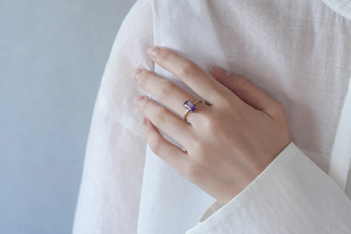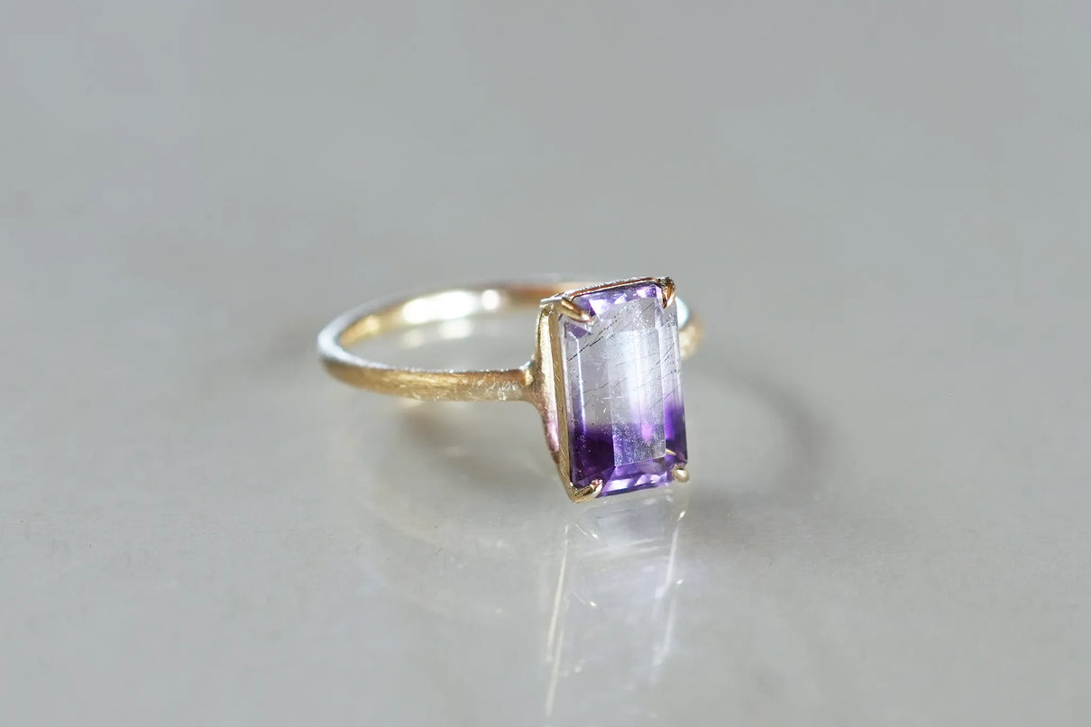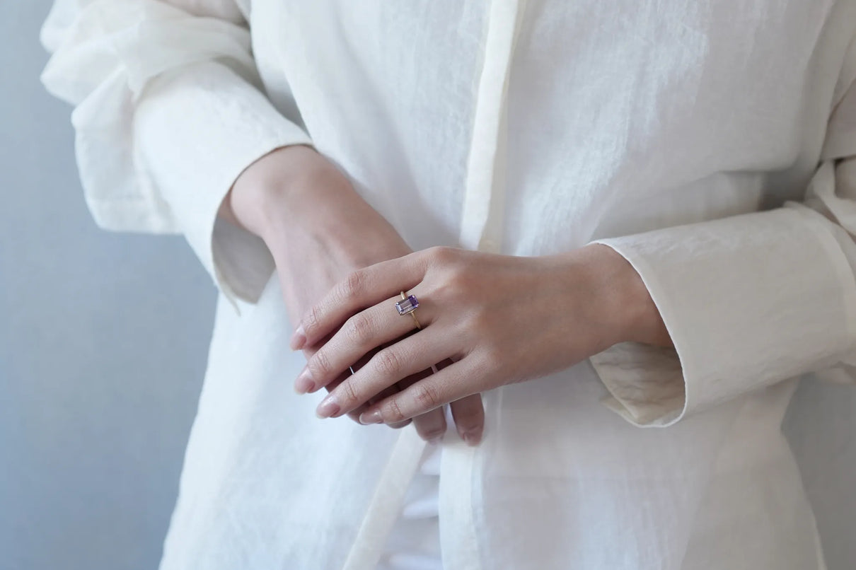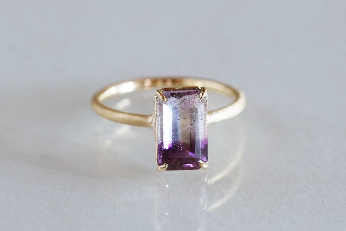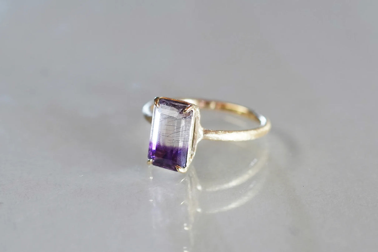 無数に走る有機的な針状のインクルージョンを内包したゲーサイトインアメジストで仕立てた一点もののリングです。無色透明と高貴な印象の紫色が織りなすバイカラーの結晶の中で、斜めに漂う繊細な黒色のゲーサイト。透明な水の中でインクがゆっくりと滲んでゆく瞬間を閉じ込めたような色彩が指元を印象的に彩ります。透明度の高いアメジストを包む石座の隙間からは光をたっぷりと取り込み、一層の輝きを引き立てています。2月生まれの誕生石として親しまれているアメジスト。2月生まれの方の特別なお守りとして、贈り物にも最適な一点です。