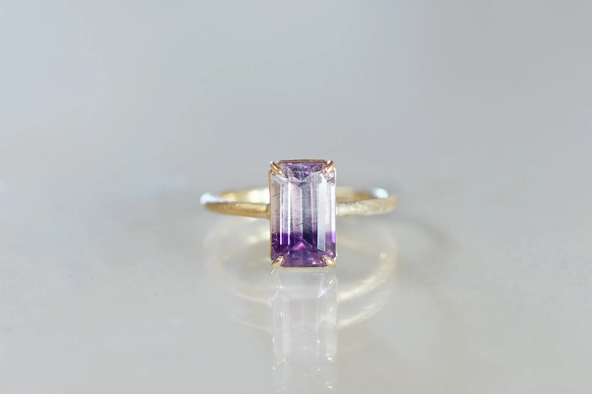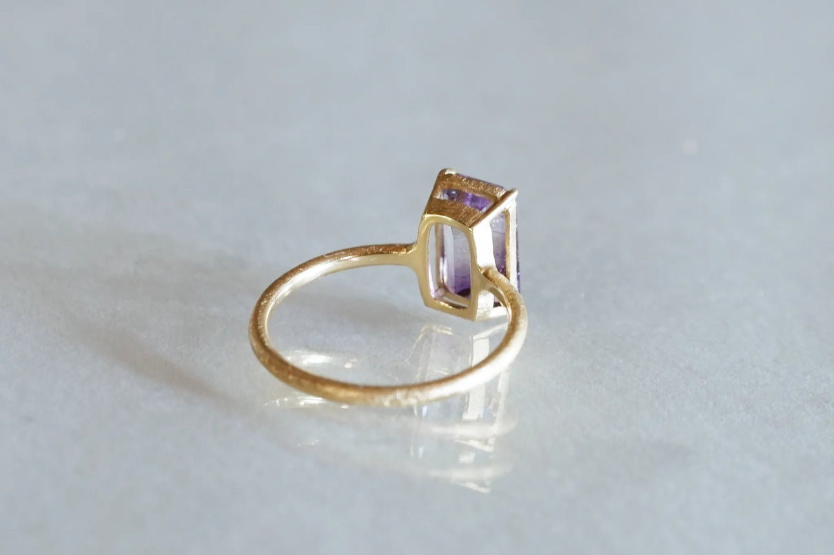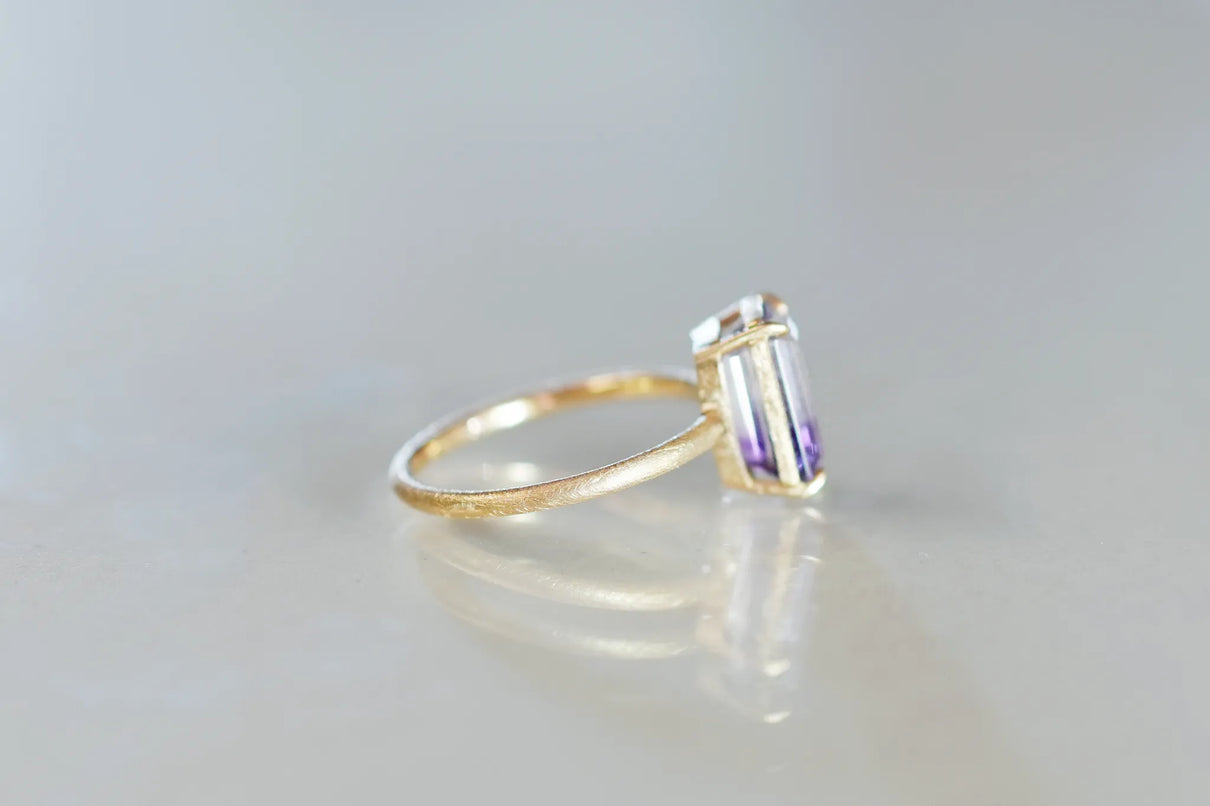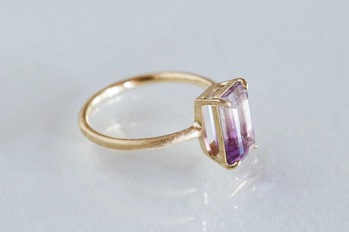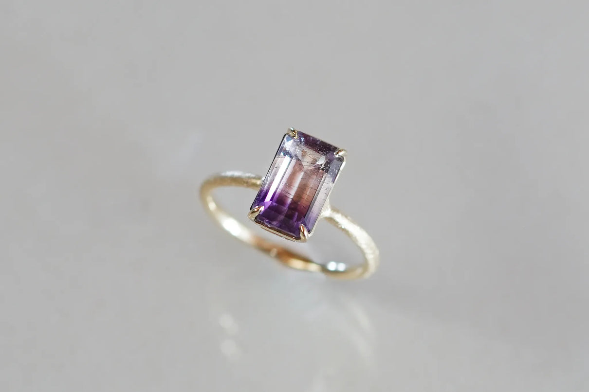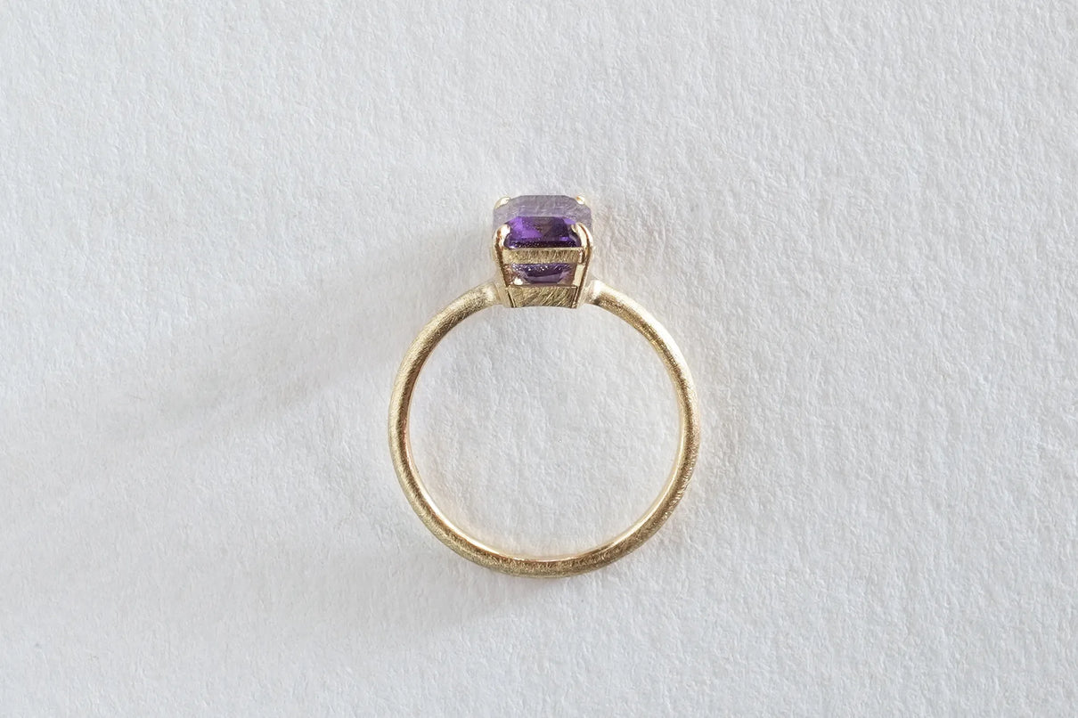 無数に走る有機的な針状のインクルージョンを内包したゲーサイトインアメジストで仕立てた一点もののリングです。無色透明と高貴な印象の紫色が織りなすバイカラーの結晶の中で、斜めに漂う繊細な黒色のゲーサイト。透明な水の中でインクがゆっくりと滲んでゆく瞬間を閉じ込めたような色彩が指元を印象的に彩ります。透明度の高いアメジストを包む石座の隙間からは光をたっぷりと取り込み、一層の輝きを引き立てています。2月生まれの誕生石として親しまれているアメジスト。2月生まれの方の特別なお守りとして、贈り物にも最適な一点です。