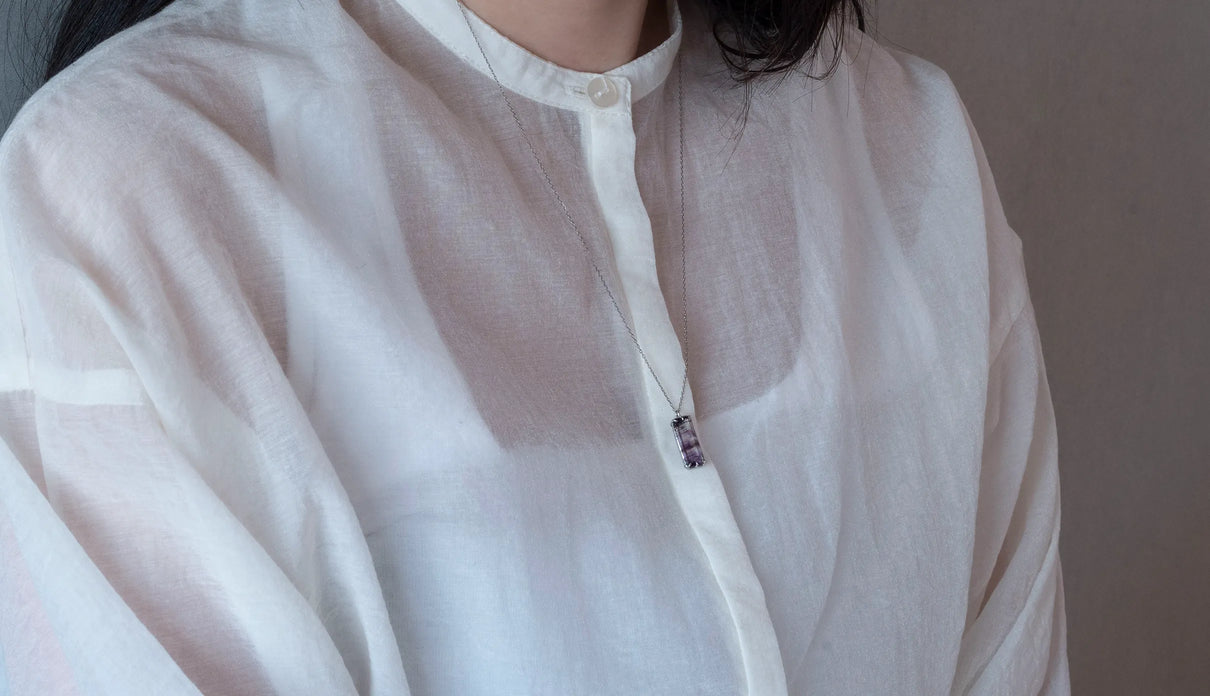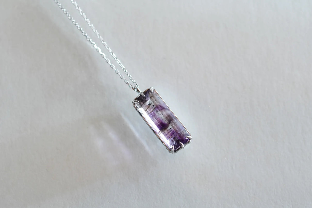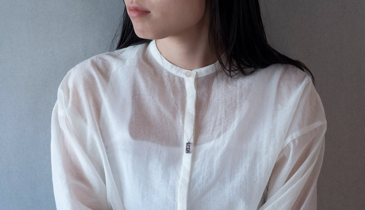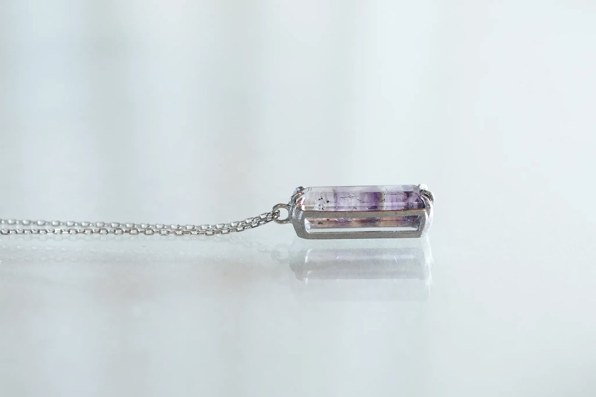 すっきりとした縦長のスクエア型フォルムの中に、針状や粒状のゲーサイトがバランスよく秘められたアメジストの一点もののネックレス。透明度の高い無色の結晶の中に、淡く色づく紫色の色彩が程よい彩りとして胸元を飾ります。甘さを抑えた縦長型のアメジストを引き立てるプラチナの石座とチェーンが、落ち着きのある印象へと導くデザイン。2月生まれの誕生石として親しまれているアメジスト。2月生まれの方の特別なお守りとして、贈り物にも最適な一点です。