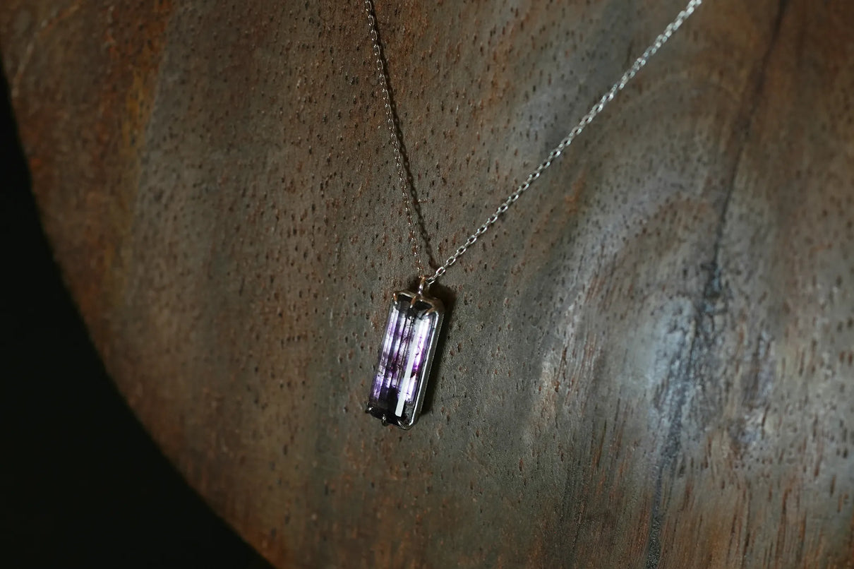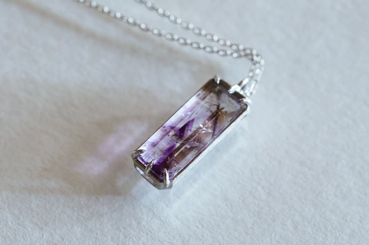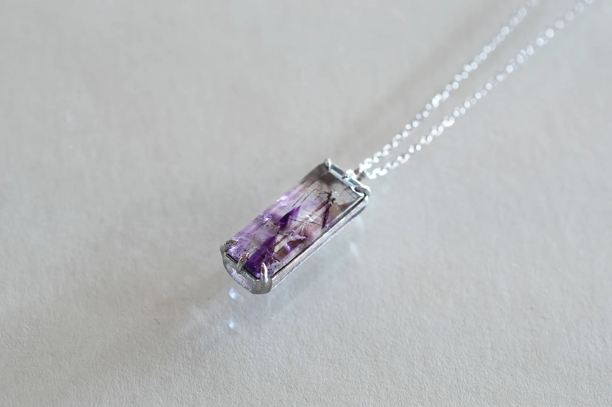 すっきりとした縦長のスクエア型フォルムの中に、針状や粒状のゲーサイトがバランスよく秘められたアメジストの一点もののネックレス。透明度の高い無色の結晶の中に、淡く色づく紫色の色彩が程よい彩りとして胸元を飾ります。甘さを抑えた縦長型のアメジストを引き立てるプラチナの石座とチェーンが、落ち着きのある印象へと導くデザイン。2月生まれの誕生石として親しまれているアメジスト。2月生まれの方の特別なお守りとして、贈り物にも最適な一点です。