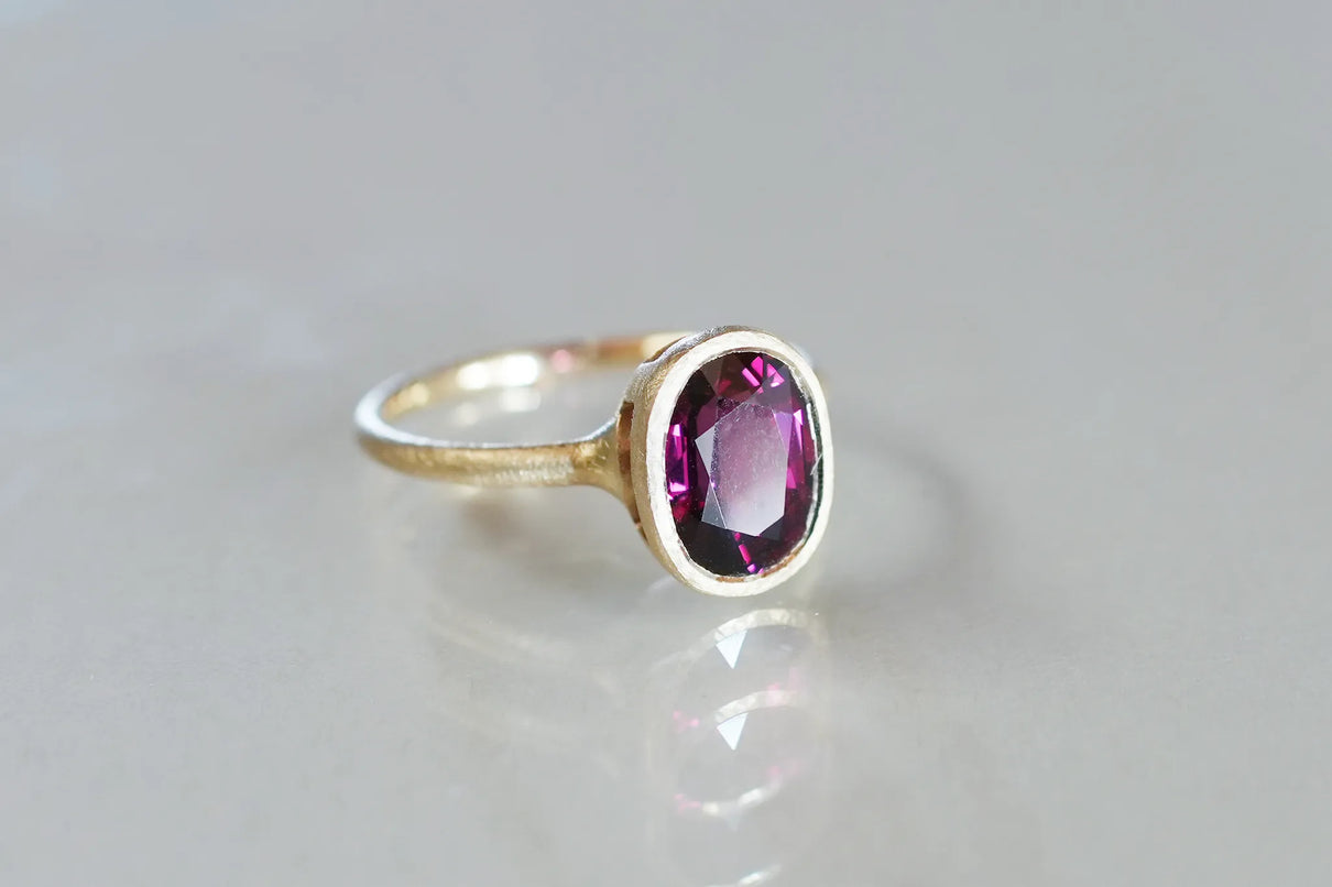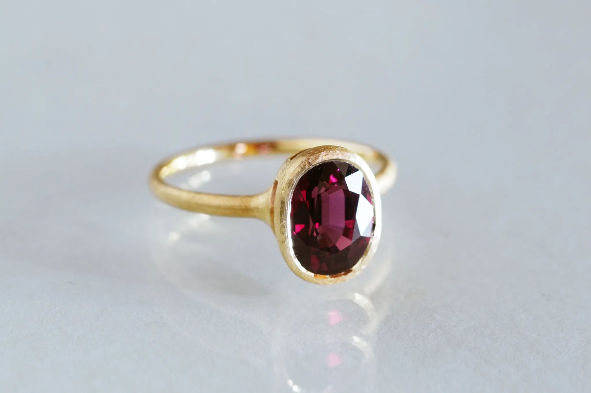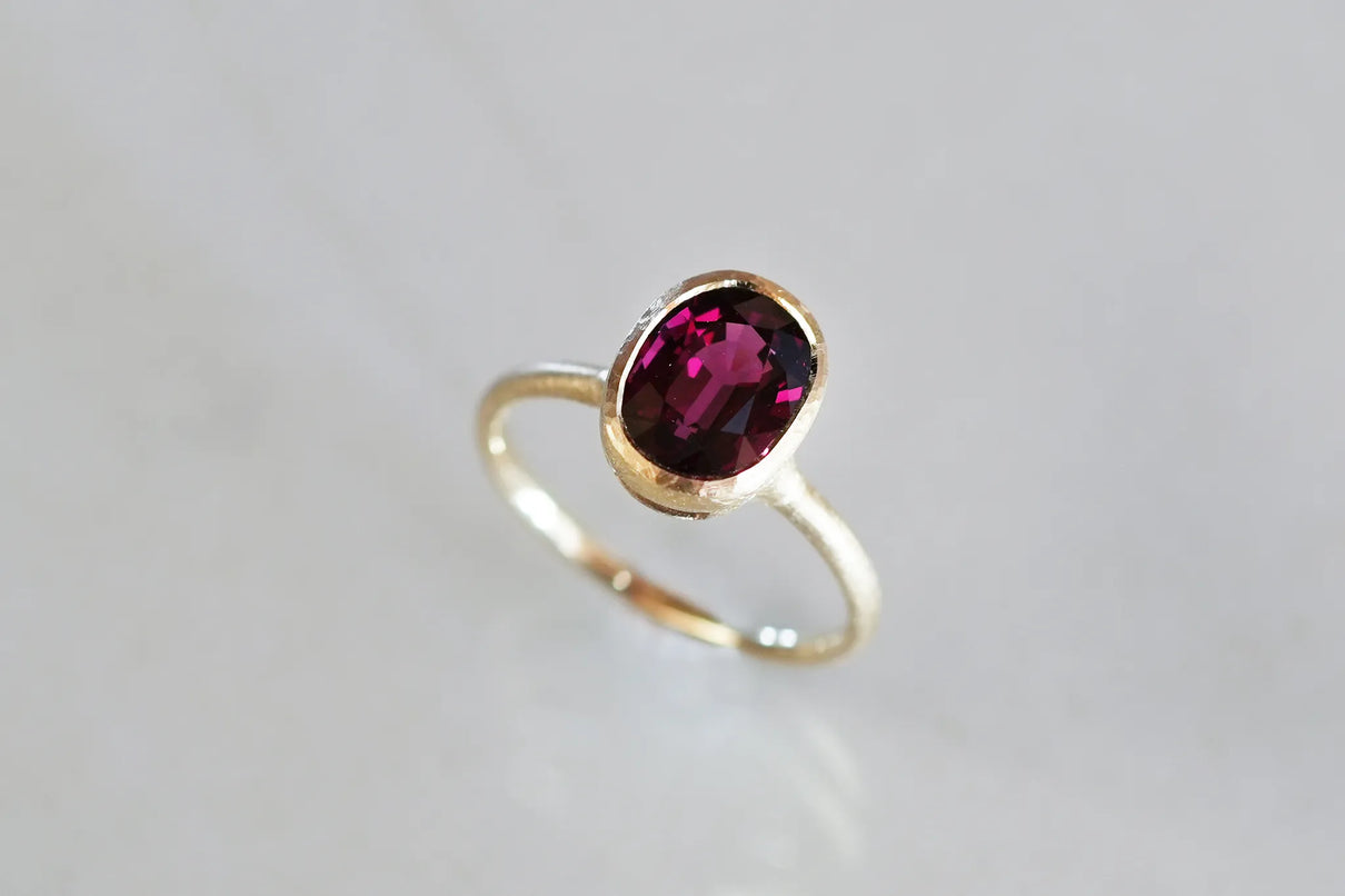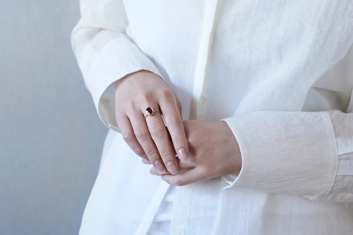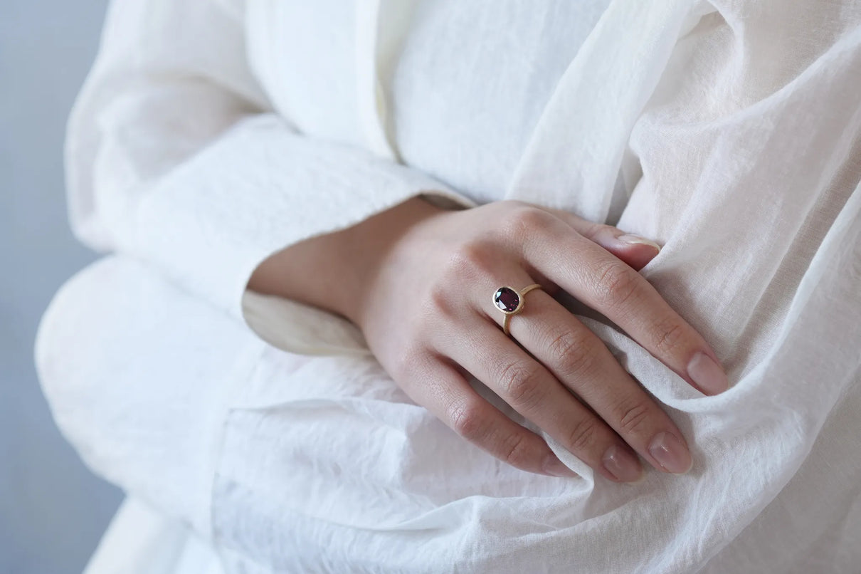 赤と紫が混じり合った美しい色合いが魅力的なロードライトガーネットで仕立てた一点もののリング。瑞々しい葡萄のような深く鮮やかな色彩を放つピースが印象的に指元を彩ります。マットに仕立てたK18イエローゴールドの石座がしっかりとガーネットを包み、落ち着きのある印象をもたらします。1月生まれの誕生石として親しまれているガーネット。1月生まれの方の特別なお守りとして、贈り物にも最適な一点です。