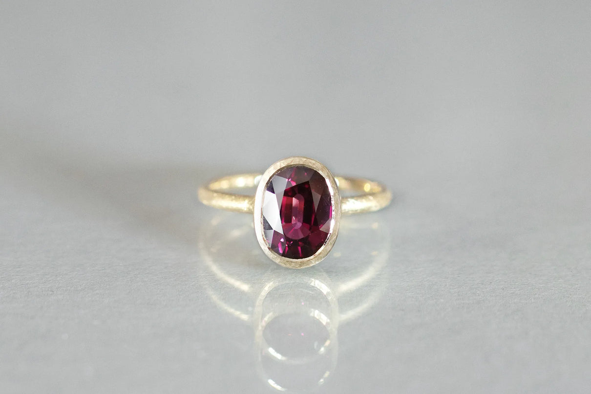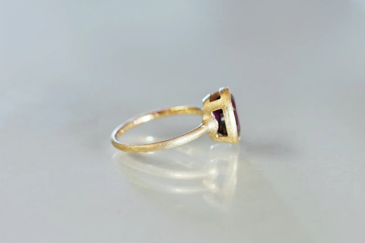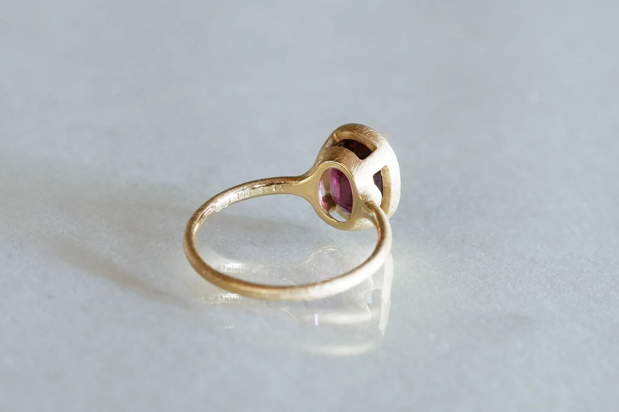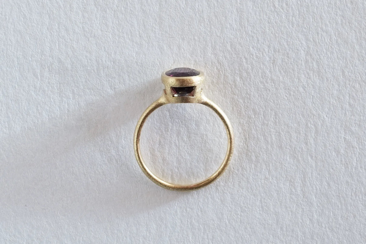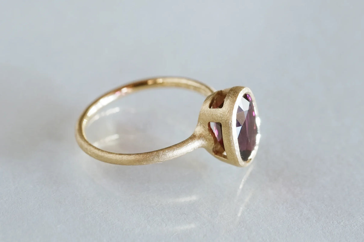 赤と紫が混じり合った美しい色合いが魅力的なロードライトガーネットで仕立てた一点もののリング。瑞々しい葡萄のような深く鮮やかな色彩を放つピースが印象的に指元を彩ります。マットに仕立てたK18イエローゴールドの石座がしっかりとガーネットを包み、落ち着きのある印象をもたらします。1月生まれの誕生石として親しまれているガーネット。1月生まれの方の特別なお守りとして、贈り物にも最適な一点です。