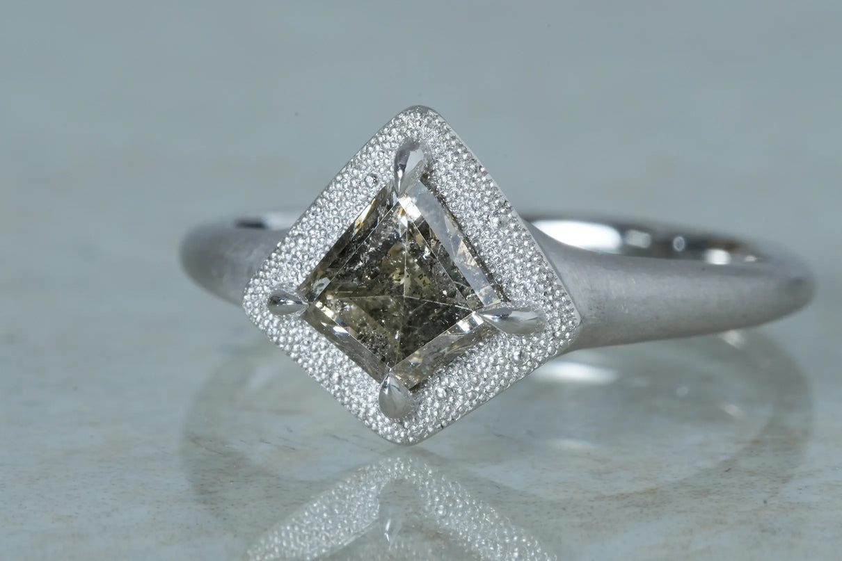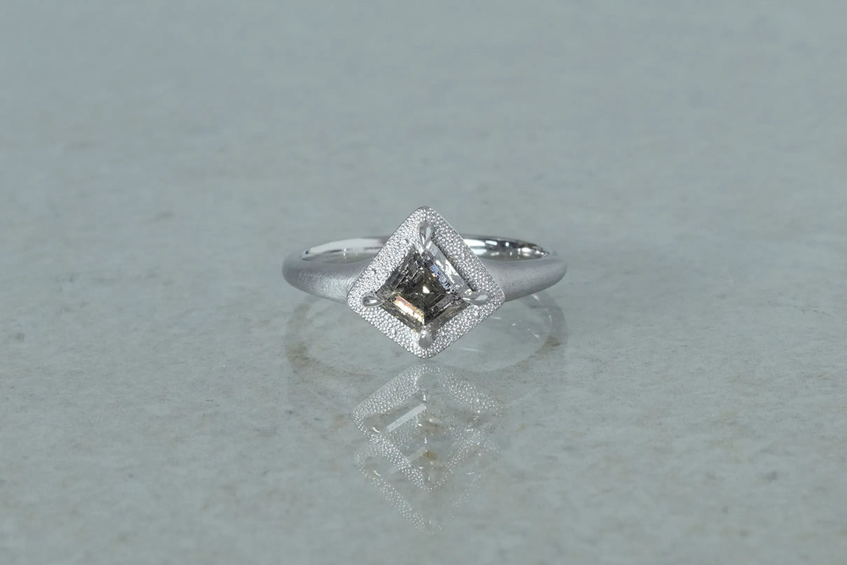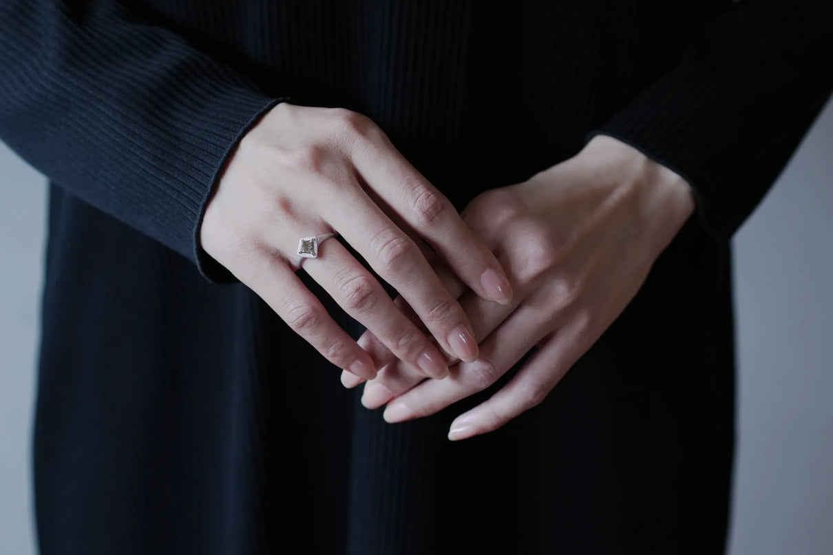 吸い込まれるような高い透明度を誇るライトブラウンカラーの、カイトカットダイヤモンドで仕立てた一点もののリング。ダイヤモンド内を舞う黒いカーボン結晶と、ラメのように繊細に煌めく薄雲のような内包物が複雑な表情を魅せる魅力多いルースです。ダイヤモンドを取り巻くプラチナの石座には無数の極小のミル打ちをあしらい、その粒の大きさもランダムに所々大きさを変える工夫を凝らすことで、抑揚のある煌めきを放っています。精密な技巧を凝らした仕立てながらも、落ち着きのある存在感を秘めたリング。装いの主役として手元に静かな華を添えてくれるでしょう。