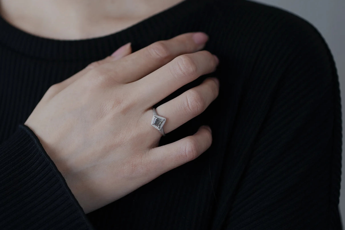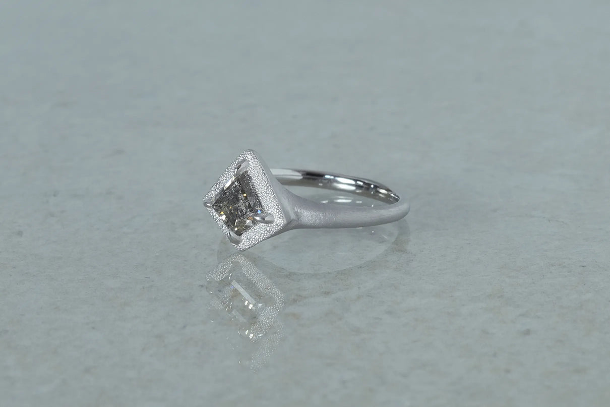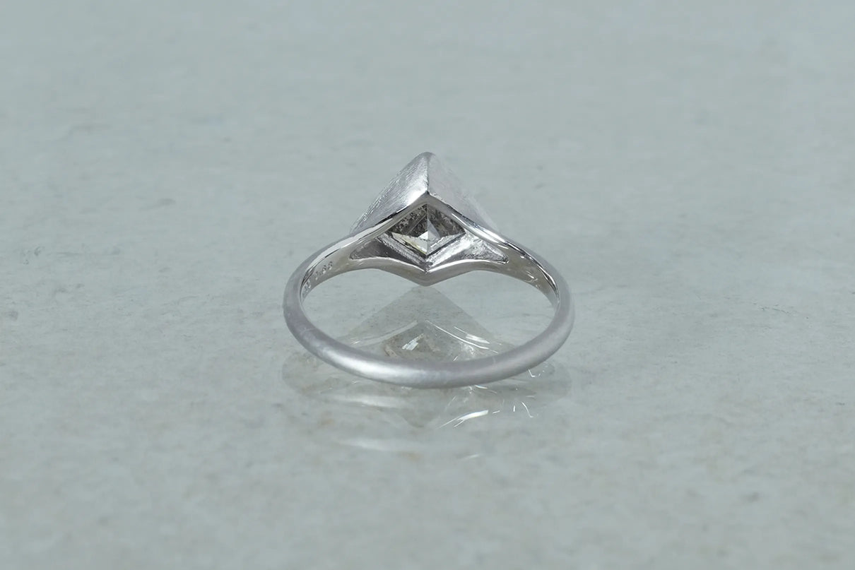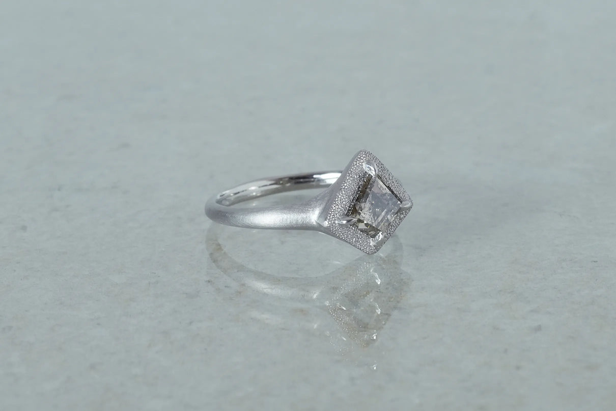吸い込まれるような高い透明度を誇るライトブラウンカラーの、カイトカットダイヤモンドで仕立てた一点もののリング。ダイヤモンド内を舞う黒いカーボン結晶と、ラメのように繊細に煌めく薄雲のような内包物が複雑な表情を魅せる魅力多いルースです。ダイヤモンドを取り巻くプラチナの石座には無数の極小のミル打ちをあしらい、その粒の大きさもランダムに所々大きさを変える工夫を凝らすことで、抑揚のある煌めきを放っています。精密な技巧を凝らした仕立てながらも、落ち着きのある存在感を秘めたリング。装いの主役として手元に静かな華を添えてくれるでしょう。