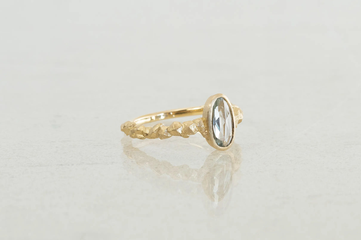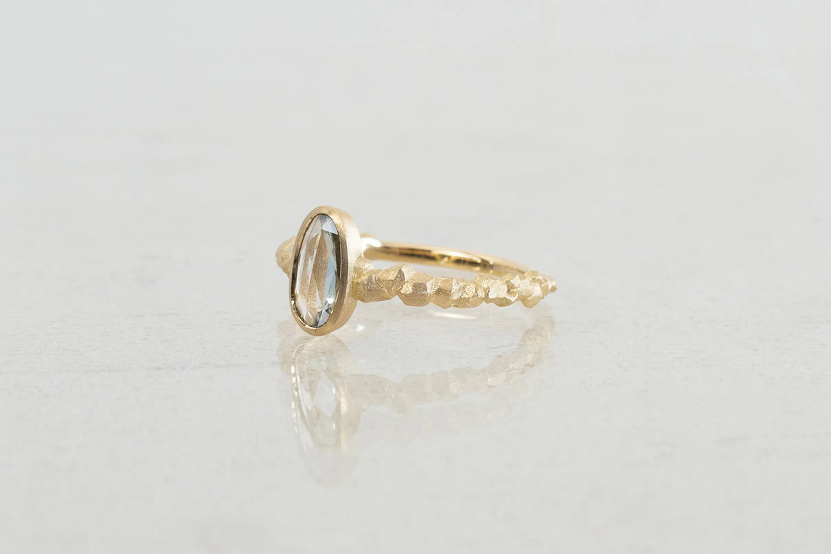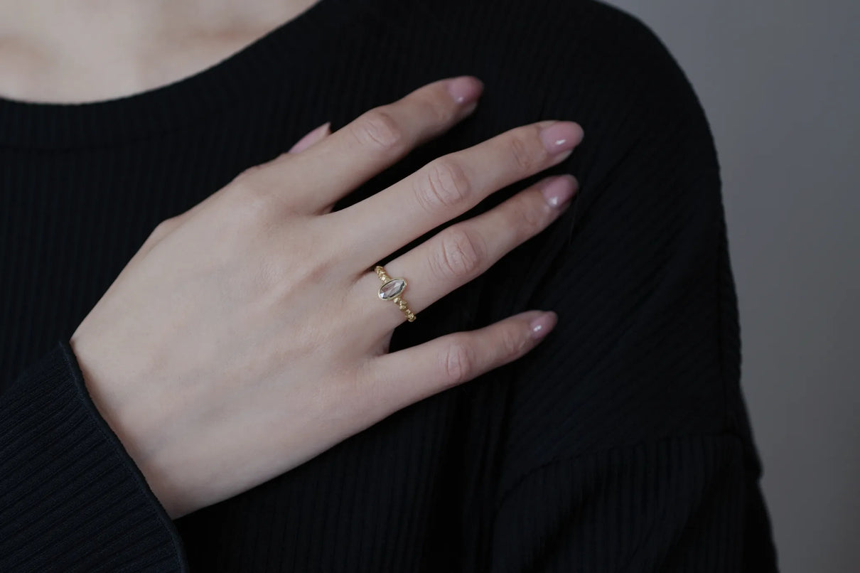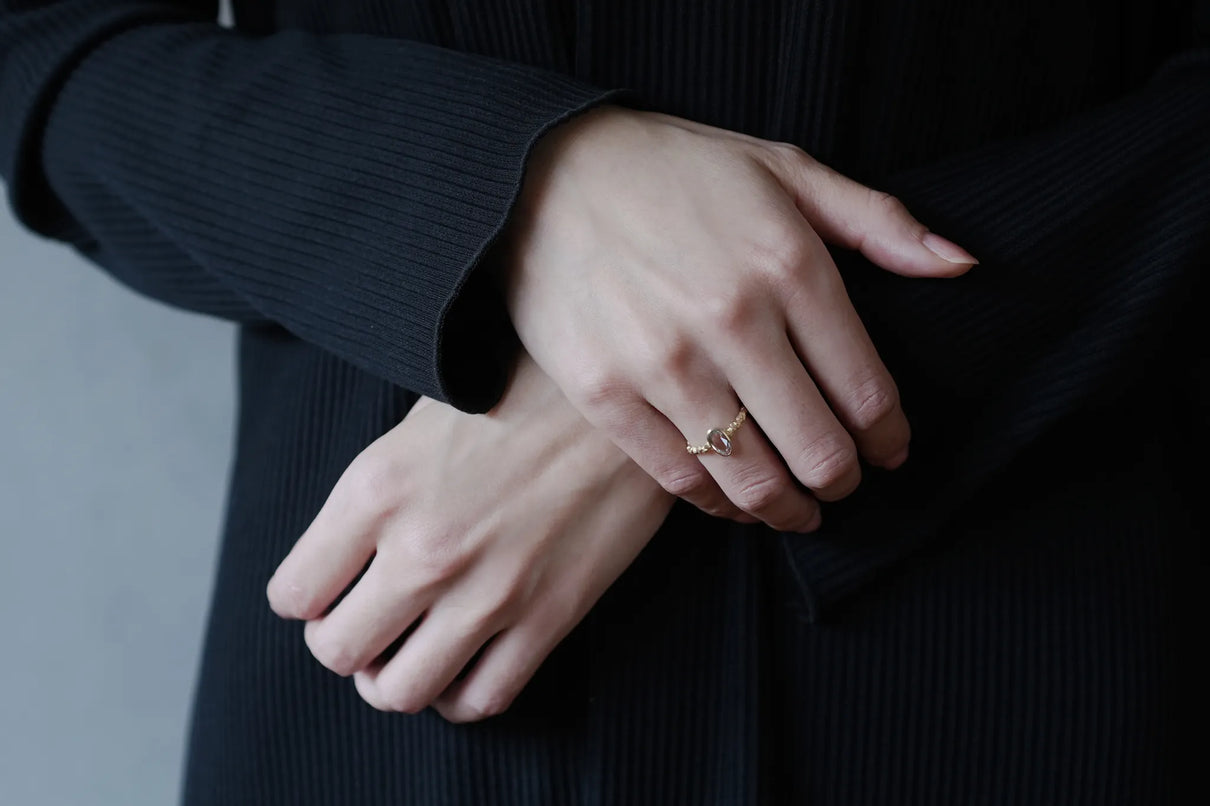 森の奥にひそむ、小さきもの達の静かなる営みをモチーフにした "Whisperシリーズ" 。有機的な連なりをもつK18イエローゴールドのアームに、瑞々しい色彩を放つキャンディーカラーのサファイアを留めた一点もののリングです。優しいペールトーンの彩りが華やかに煌めくグリーンカラーのキャンディーサファイアと、有機的なWhisperのリングアームのコントラストが互いを引き立て、指元に繊細で印象的な存在感を放ちます。日常的に身に着けていただくのはもちろん、9月の誕生石としても親しまれているサファイアは、9月生まれの方の特別なお守りとして贈りものにも最適です。