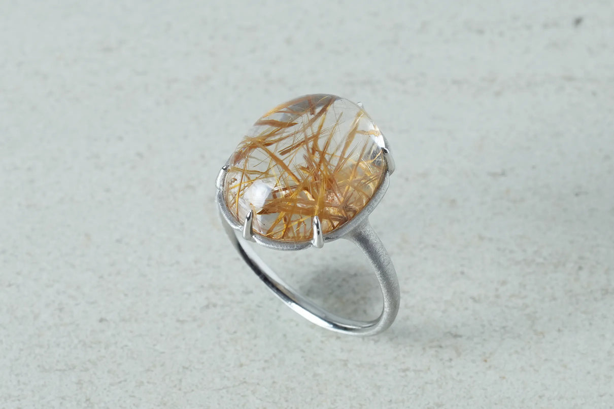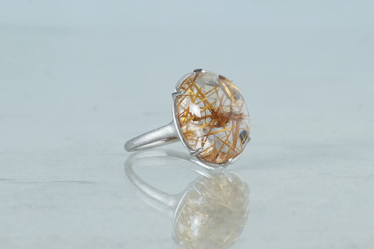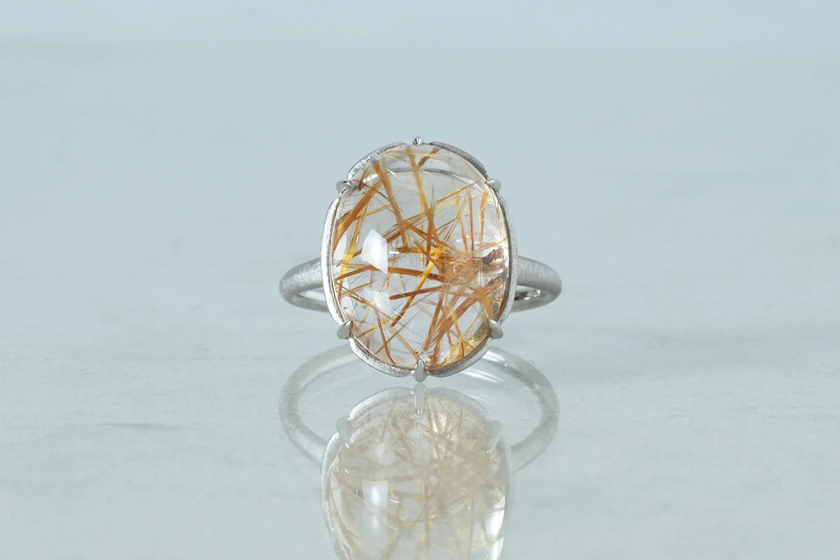 クォーツの中に閉じ込められた、わずかに赤みを帯びた黄金色の無数の針のような内包物が個性溢れる、ゴールドルチルクォーツで仕立てた1点もののリング。束を作りながら透明度の高いクォーツ内を縦横無尽に走るゴールドルチルが、様々な角度から立体方向に重なり合う様子はまるで織物のよう。ルチルの個性を引き立てるように寄り添うプラチナの石座には、6本の爪部分にわずかなくびれを与え、花を模したような輪郭を描きました。装いを選ばずお使いいただける、日常使いから特別なシーンまで幅広く華を添えるリングです。