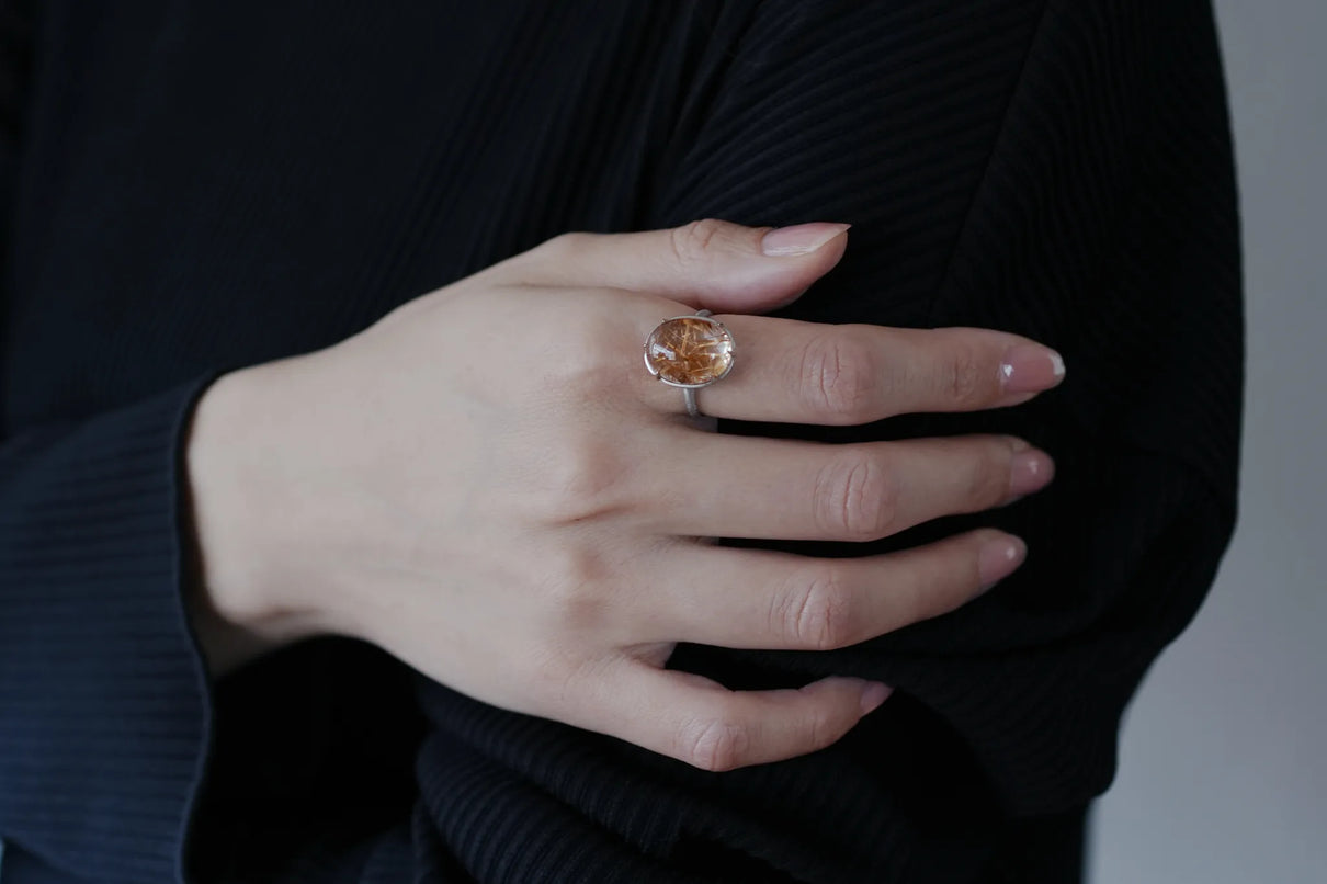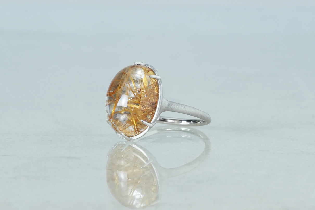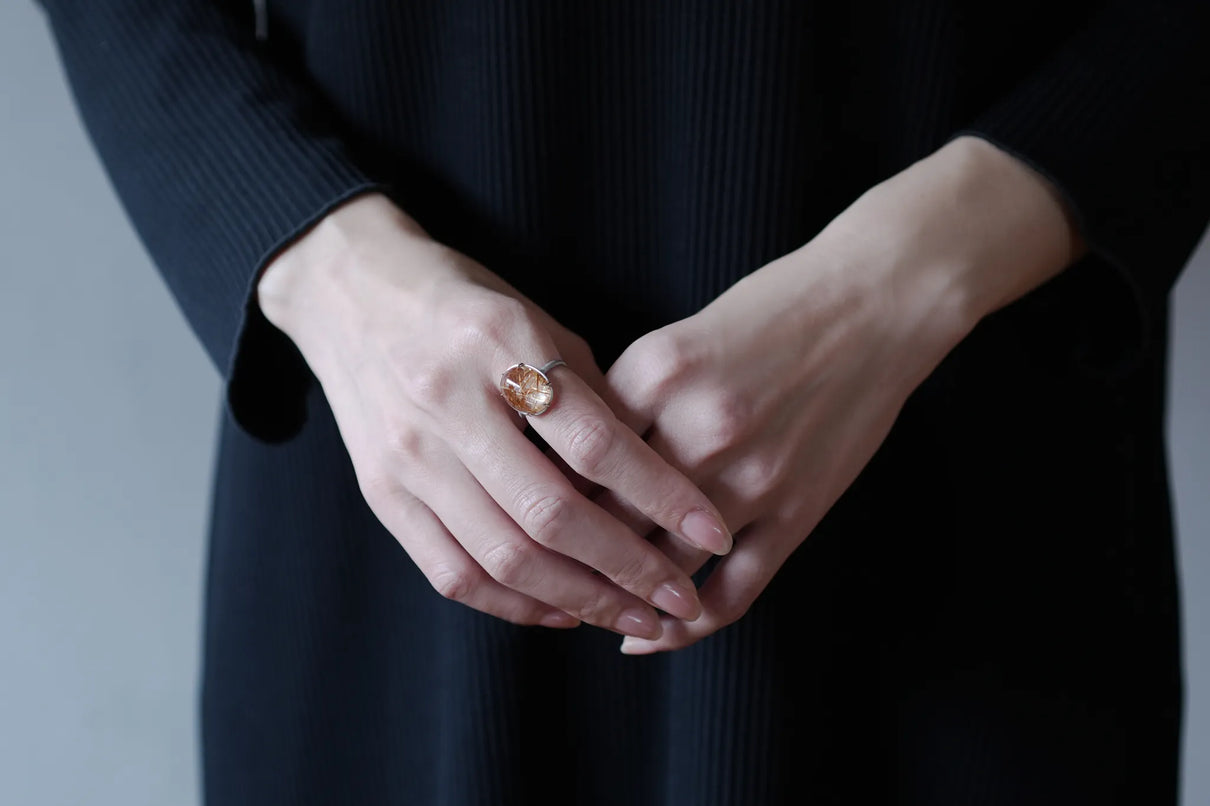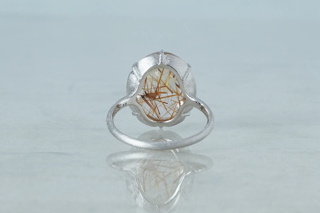 クォーツの中に閉じ込められた、わずかに赤みを帯びた黄金色の無数の針のような内包物が個性溢れる、ゴールドルチルクォーツで仕立てた1点もののリング。束を作りながら透明度の高いクォーツ内を縦横無尽に走るゴールドルチルが、様々な角度から立体方向に重なり合う様子はまるで織物のよう。ルチルの個性を引き立てるように寄り添うプラチナの石座には、6本の爪部分にわずかなくびれを与え、花を模したような輪郭を描きました。装いを選ばずお使いいただける、日常使いから特別なシーンまで幅広く華を添えるリングです。