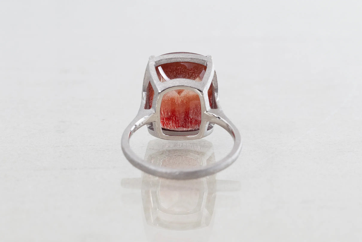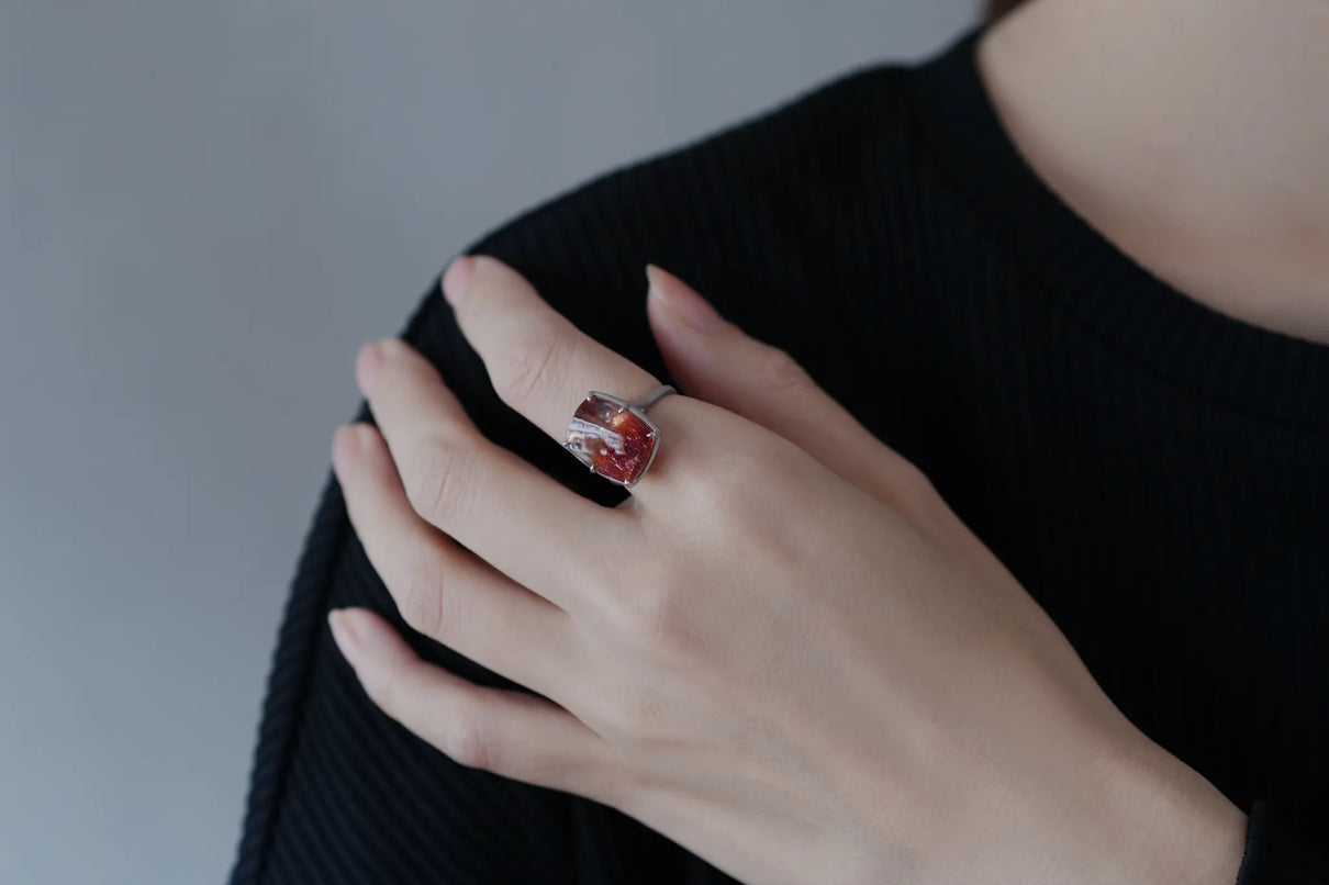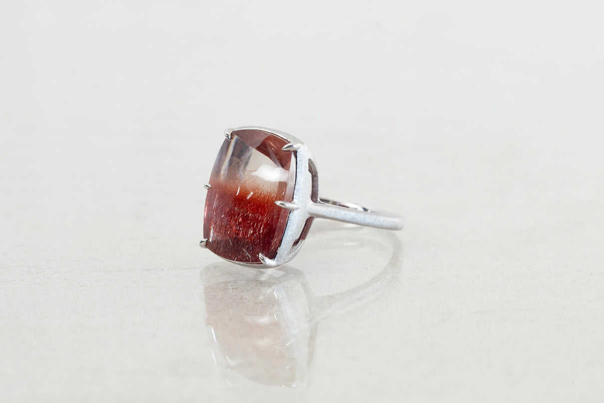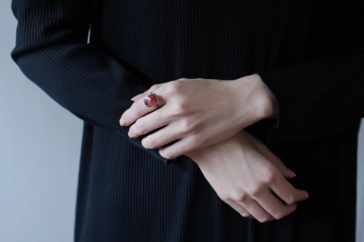 無数に走る有機的な針状の内包物を秘めた、ゲーサイトインクォーツで仕立てた1点もののリング。透明度の高いクォーツの中に大変密度高く内包された真紅のインクルージョンが、光を受けて放つ閃光の眩い煌めきと色彩は唯一無二。ゲーサイトインクォーツとしてはこれ以上ないと言っても過言ではないほどの、透明度の高さと彩度の高い赤の両者を有する、クオリティの高い格別なルースで仕立てました。そしてそれを引き立てるのは、マットに仕立てた石座と華奢なリングアーム。高さのあるクォーツを全方位からお愉しみいただけるよう、石座の前後左右に大きく空間を配しました。華々しい色彩ながらもシックで品の良い雰囲気を添えるリング。装いに華を添えるジュエリーとして、特別な日にはもちろんのこと、日常にも取り入れていただきたいアイテムです。