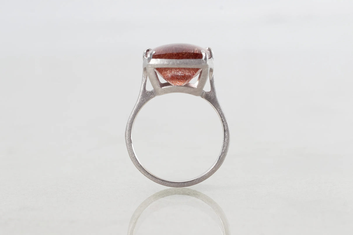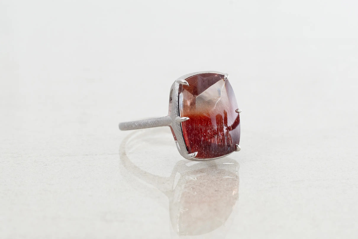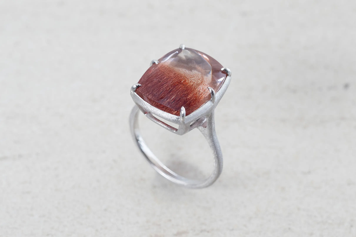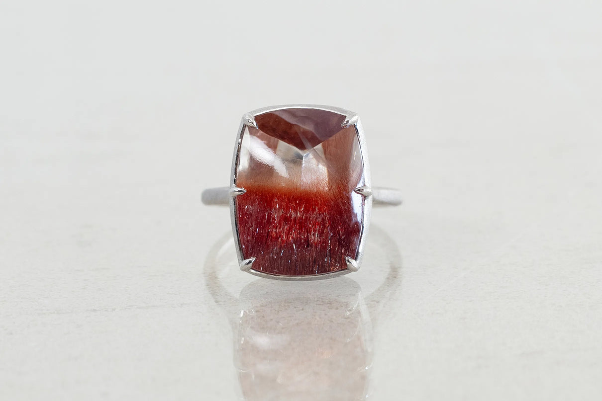 無数に走る有機的な針状の内包物を秘めた、ゲーサイトインクォーツで仕立てた1点もののリング。透明度の高いクォーツの中に大変密度高く内包された真紅のインクルージョンが、光を受けて放つ閃光の眩い煌めきと色彩は唯一無二。ゲーサイトインクォーツとしてはこれ以上ないと言っても過言ではないほどの、透明度の高さと彩度の高い赤の両者を有する、クオリティの高い格別なルースで仕立てました。そしてそれを引き立てるのは、マットに仕立てた石座と華奢なリングアーム。高さのあるクォーツを全方位からお愉しみいただけるよう、石座の前後左右に大きく空間を配しました。華々しい色彩ながらもシックで品の良い雰囲気を添えるリング。装いに華を添えるジュエリーとして、特別な日にはもちろんのこと、日常にも取り入れていただきたいアイテムです。