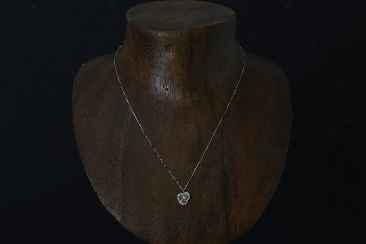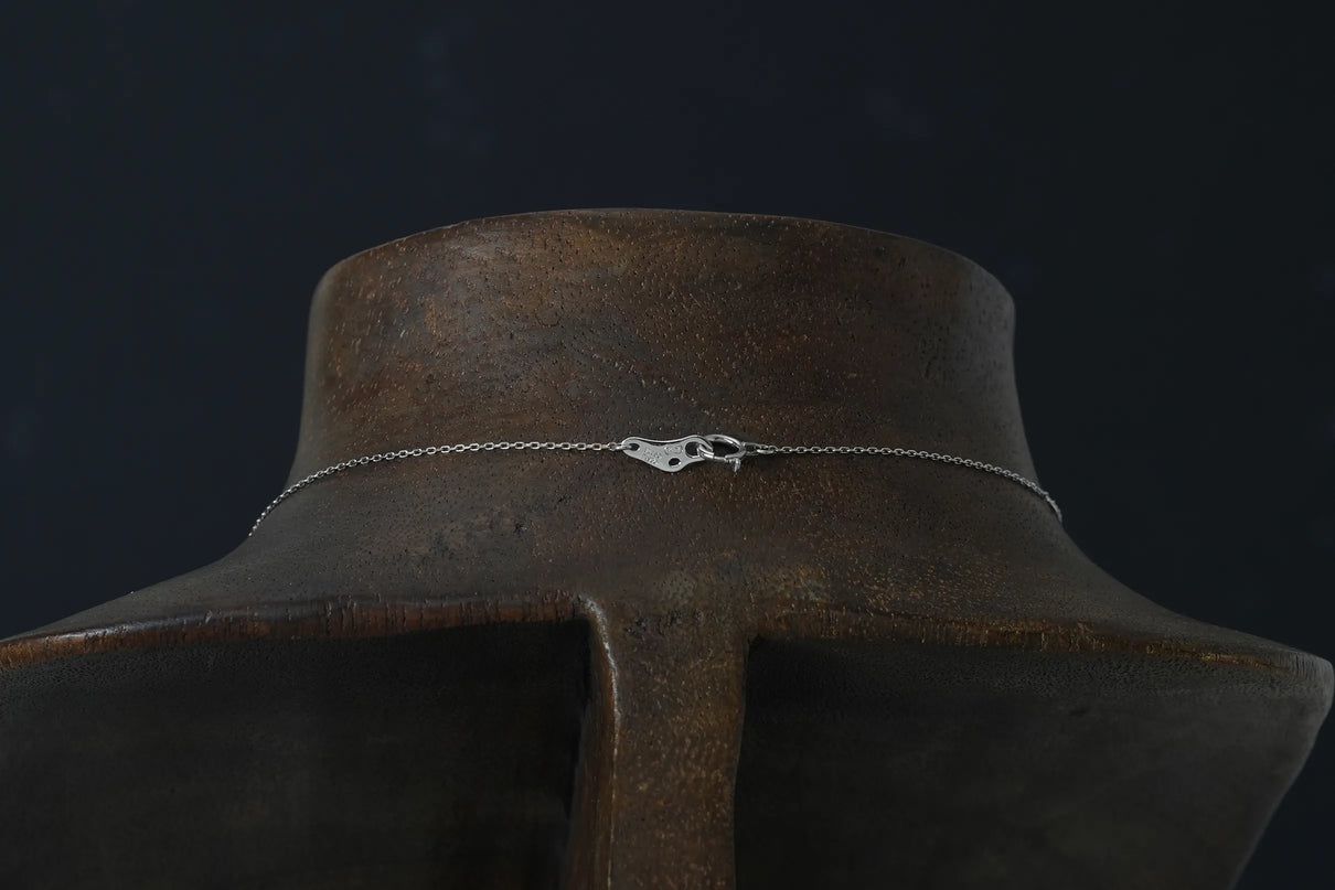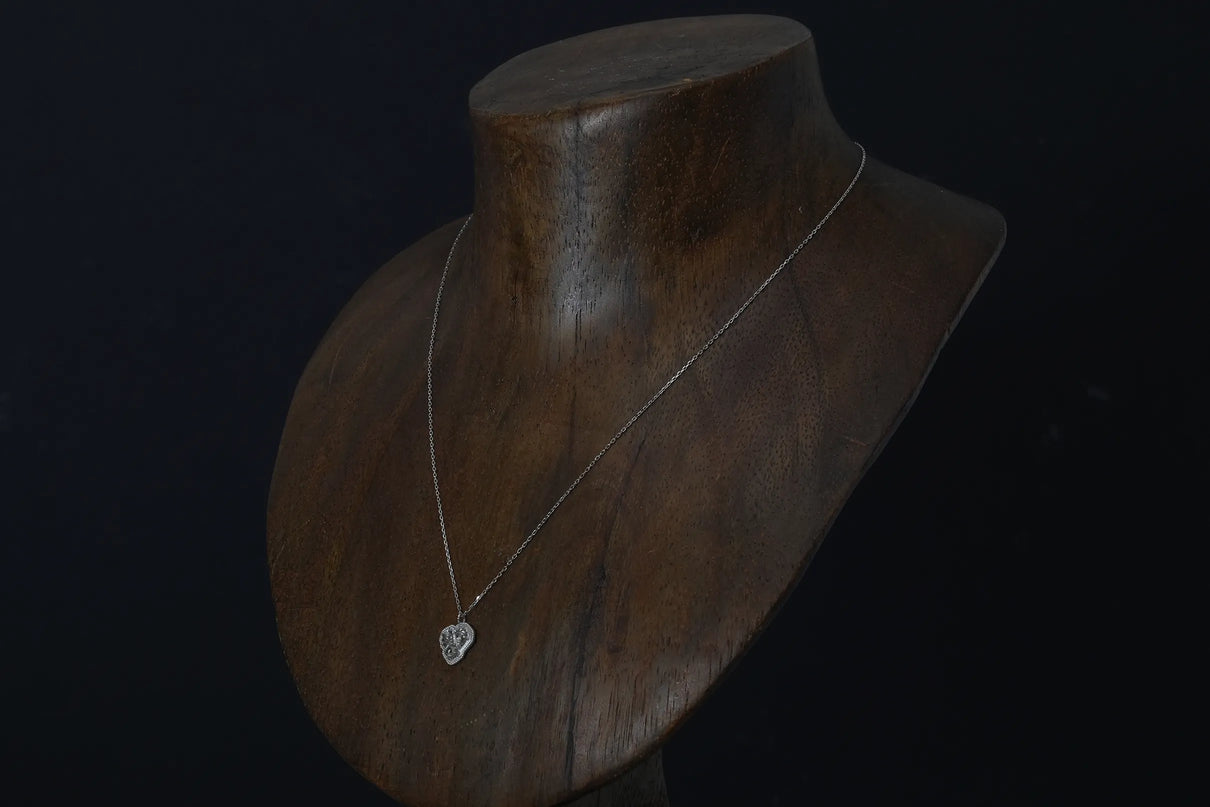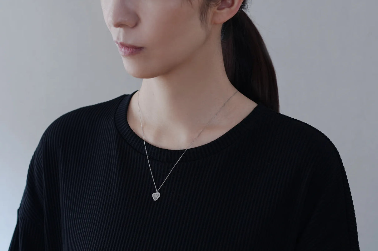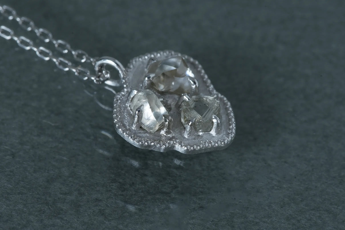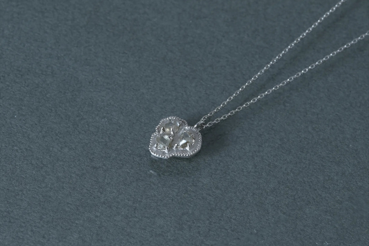 研磨されていない自然な姿を愉しめるラフダイヤモンドで仕立てた一点もののネックレス。自然が育んだありのままのダイヤモンドのフォルムを生かしデザインしたプラチナのフレームは落ち着きのあるマット仕上げで、それを縁取るように刻んだミルグレインの小さな粒の装飾が、有機的な3石を引き立てます。人の手が介入しないロマンを感じる潤みを帯びたラフダイヤモンドの煌めきが、胸元で優しく華やぎます。