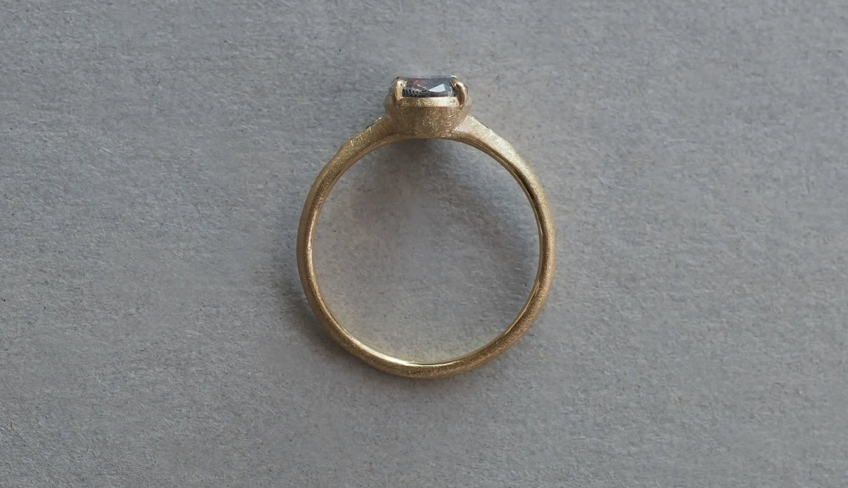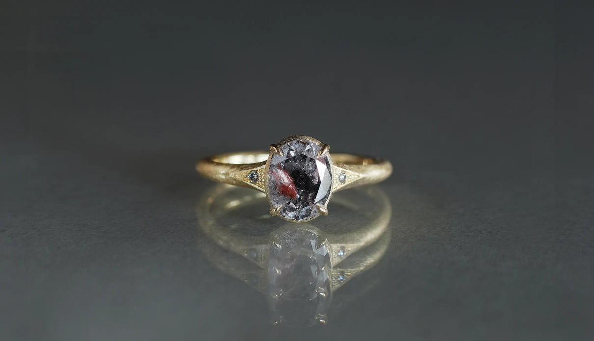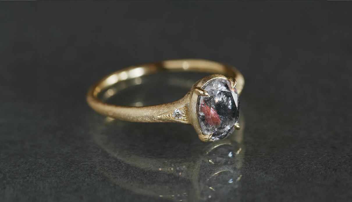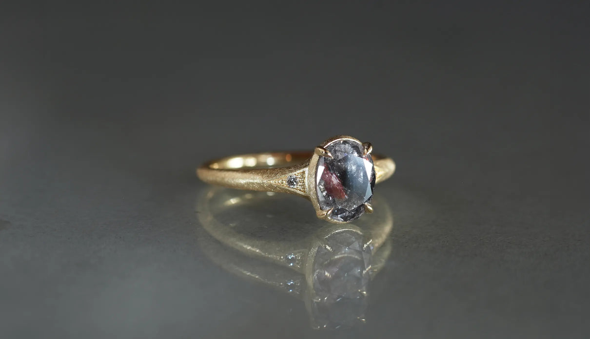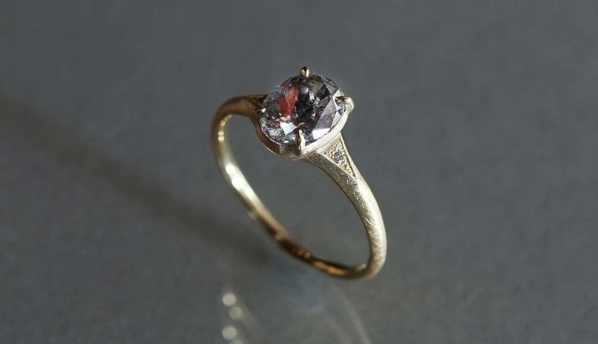 "ライモナイトインダイヤモンド" と呼ばれる大変珍しく希少なダイヤモンドで仕立てた、一点もののゴールドリング。眩く透き通る無色透明のダイヤモンドの奥底に宿る、燃え立つような褐色のライモナイト。ライモナイトを内包するダイヤモンドは殊に珍しく、情熱を秘めたその赤は、角度を変えてもなお力強く視線を惹きつけます。さらに、全体に内包された黒いカーボン結晶がまるで計算されたかのような調和を生み出し、 唯一無二の表情を放ちます。1.322ctと大きく豊かな煌めきを放つこのダイヤモンドは、他にない個性とともに圧倒的な迫力と存在感をお愉しみいただけるでしょう。 リング部分は柔らかなマットゴールド仕立て。石座の両脇に寄り添うアームの一部を三角形に切り出し、細やかなミルグレインとクリアカラーのメレダイヤモンドを一石ずつ配することで、中央のダイヤモンドを湛えながらも静かに華を添えました。唯一無二の存在感を放つリングは、日常だけでなく特別なシーンの装いも一層心高鳴るものへと昇華させます。