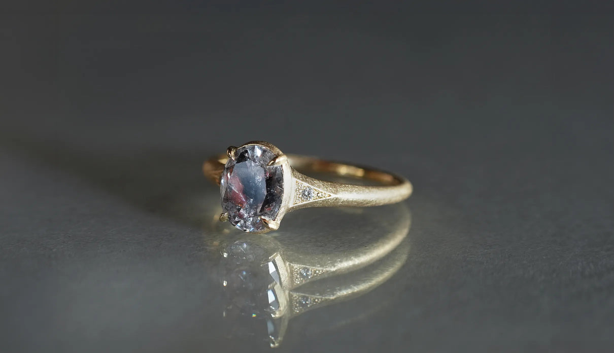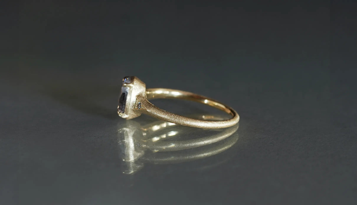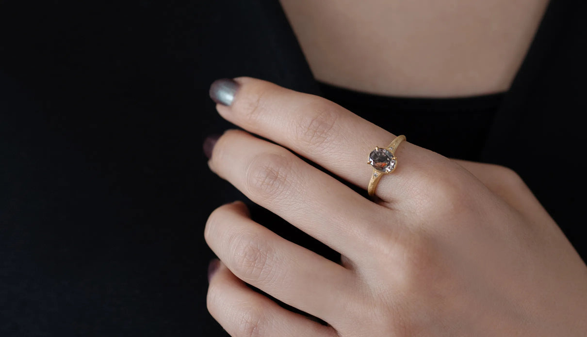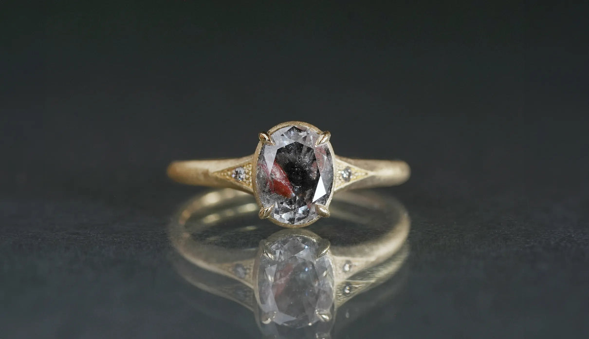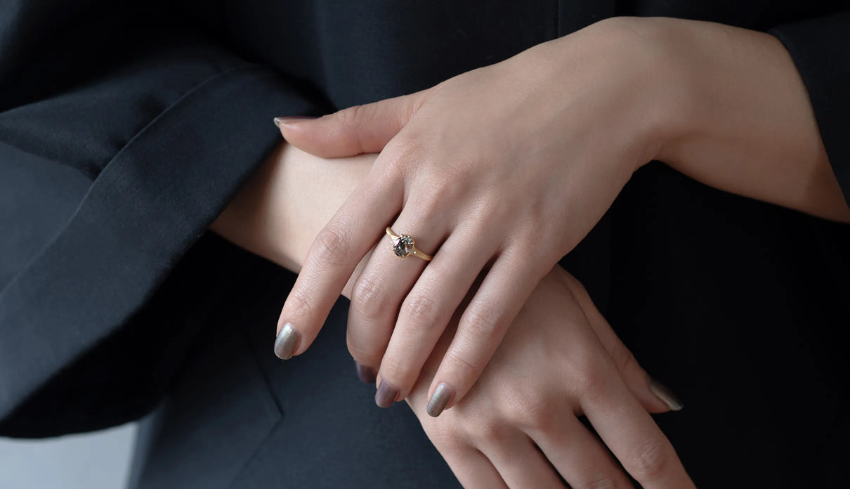 "ライモナイトインダイヤモンド" と呼ばれる大変珍しく希少なダイヤモンドで仕立てた、一点もののゴールドリング。眩く透き通る無色透明のダイヤモンドの奥底に宿る、燃え立つような褐色のライモナイト。ライモナイトを内包するダイヤモンドは殊に珍しく、情熱を秘めたその赤は、角度を変えてもなお力強く視線を惹きつけます。さらに、全体に内包された黒いカーボン結晶がまるで計算されたかのような調和を生み出し、 唯一無二の表情を放ちます。1.322ctと大きく豊かな煌めきを放つこのダイヤモンドは、他にない個性とともに圧倒的な迫力と存在感をお愉しみいただけるでしょう。 リング部分は柔らかなマットゴールド仕立て。石座の両脇に寄り添うアームの一部を三角形に切り出し、細やかなミルグレインとクリアカラーのメレダイヤモンドを一石ずつ配することで、中央のダイヤモンドを湛えながらも静かに華を添えました。唯一無二の存在感を放つリングは、日常だけでなく特別なシーンの装いも一層心高鳴るものへと昇華させます。