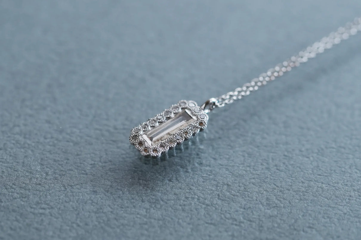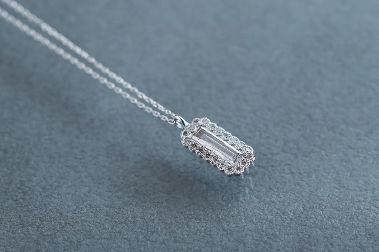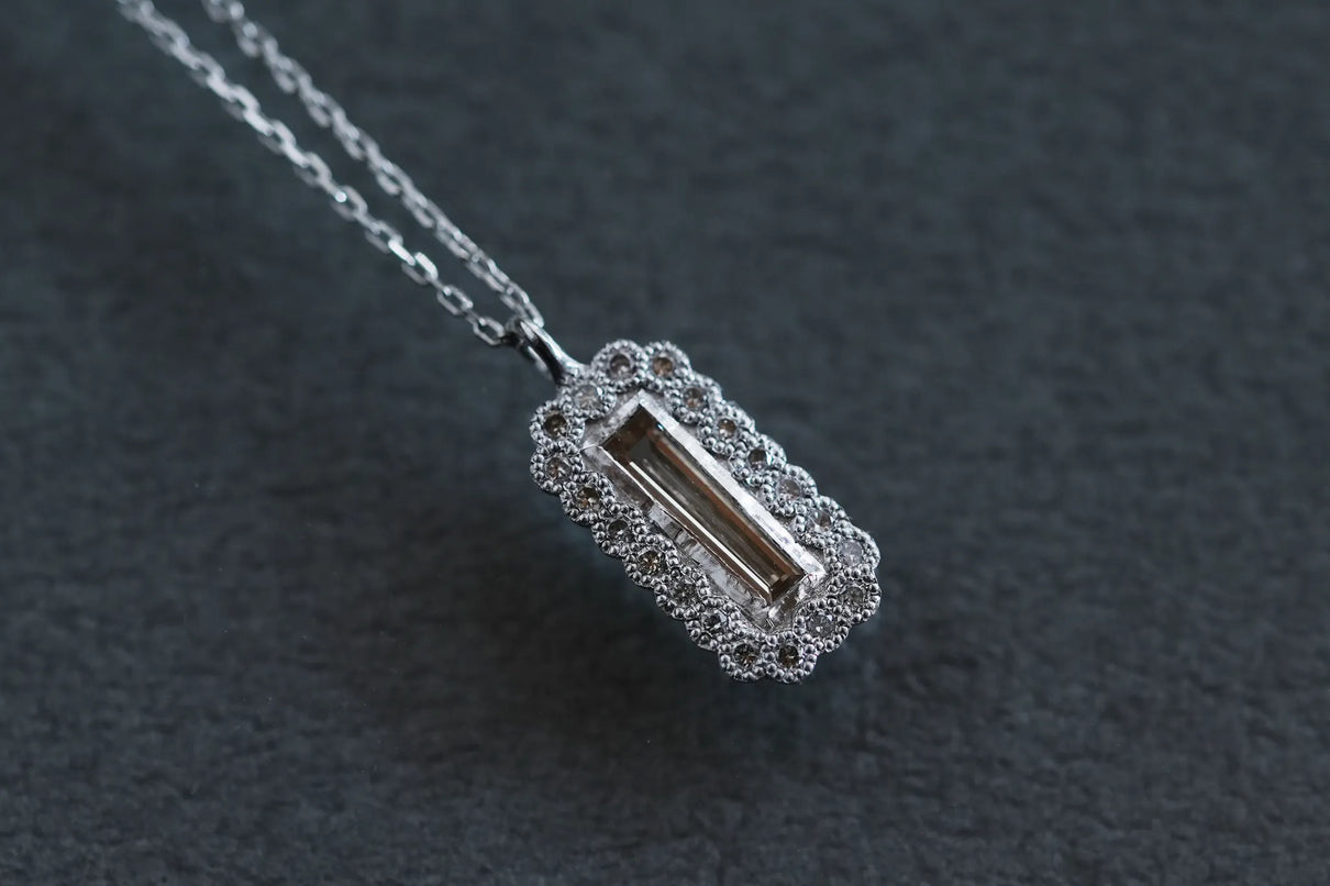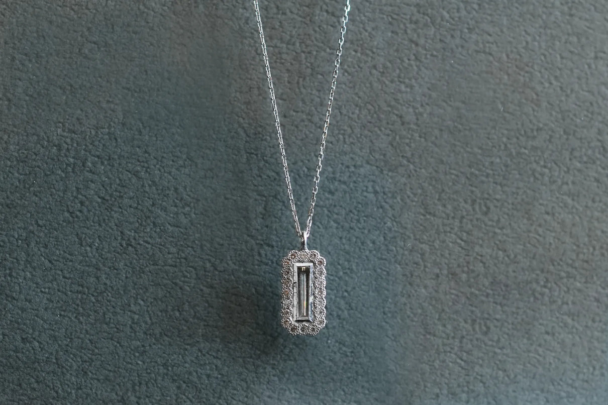 繊細なバゲットカットのダイヤモンドを中央に留めた、一点もののネックレス。ラインのように華奢なカットが施されたクリアカラーダイヤモンドを、緻密なミルグレイン留めがなされた16ピースのメレダイヤモンドで額縁のように取り巻きました。愛らしいシルエットと中央のシャープなバゲットカットの輝きの対比が、甘くなりすぎずに心地よいバランスを保ち、軽やかで品のある印象を胸元に添えます。日常使いはもちろん、特別な贈り物にもおすすめです。