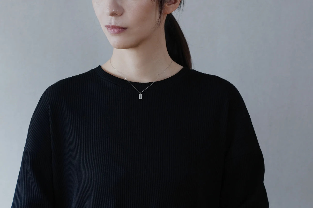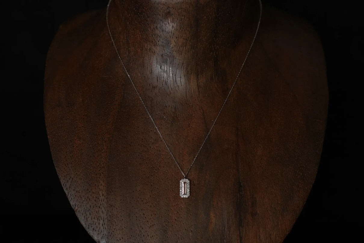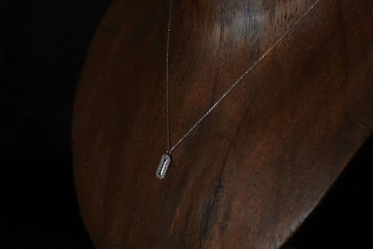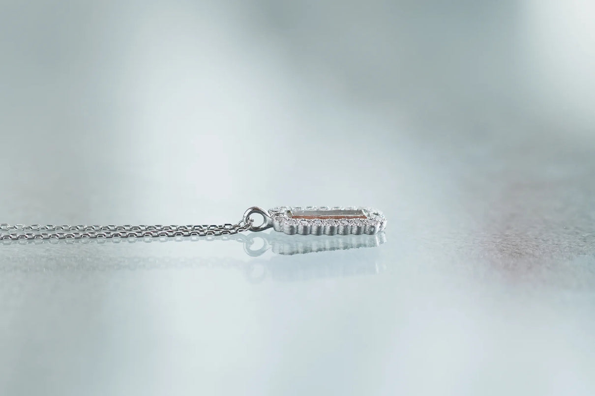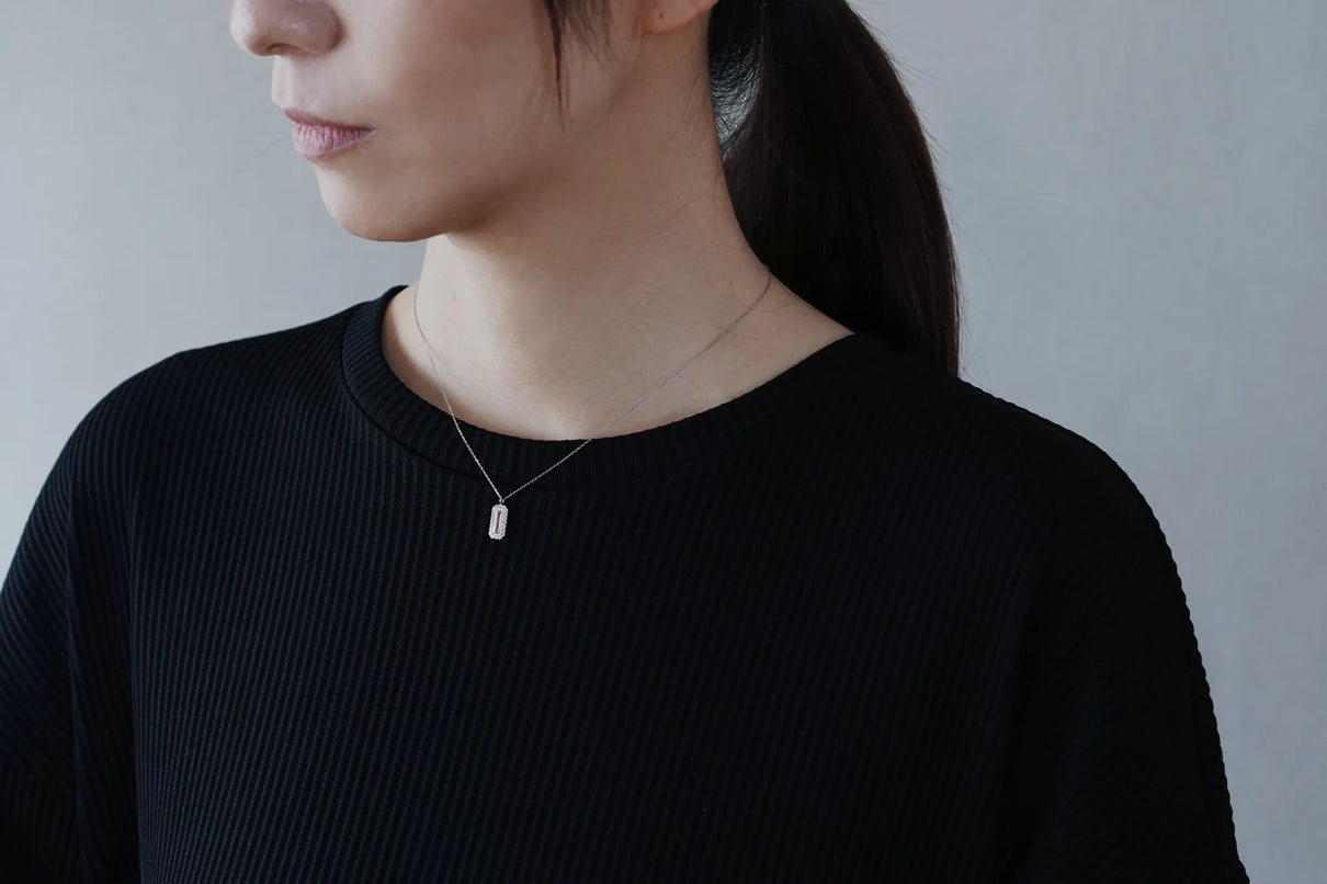 繊細なバゲットカットのダイヤモンドを中央に留めた、一点もののネックレス。ラインのように華奢なカットが施されたクリアカラーダイヤモンドを、緻密なミルグレイン留めがなされた16ピースのメレダイヤモンドで額縁のように取り巻きました。愛らしいシルエットと中央のシャープなバゲットカットの輝きの対比が、甘くなりすぎずに心地よいバランスを保ち、軽やかで品のある印象を胸元に添えます。日常使いはもちろん、特別な贈り物にもおすすめです。