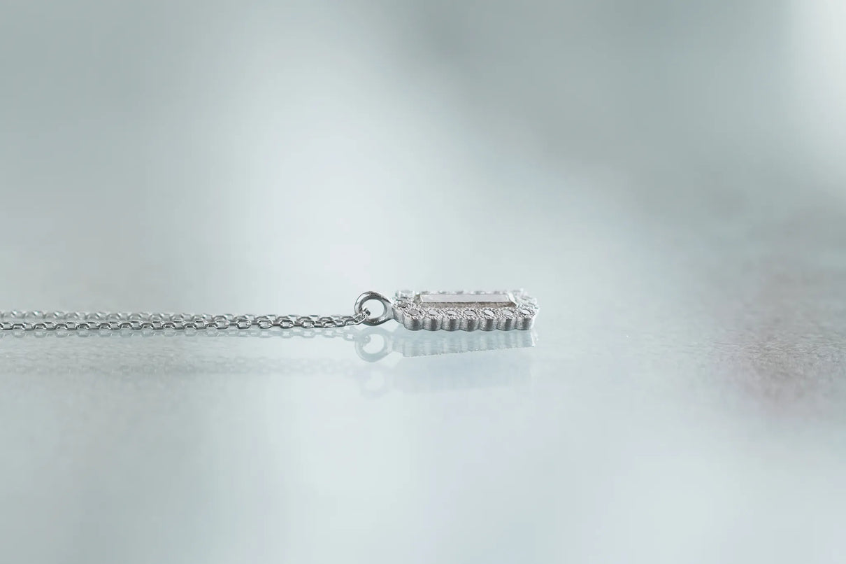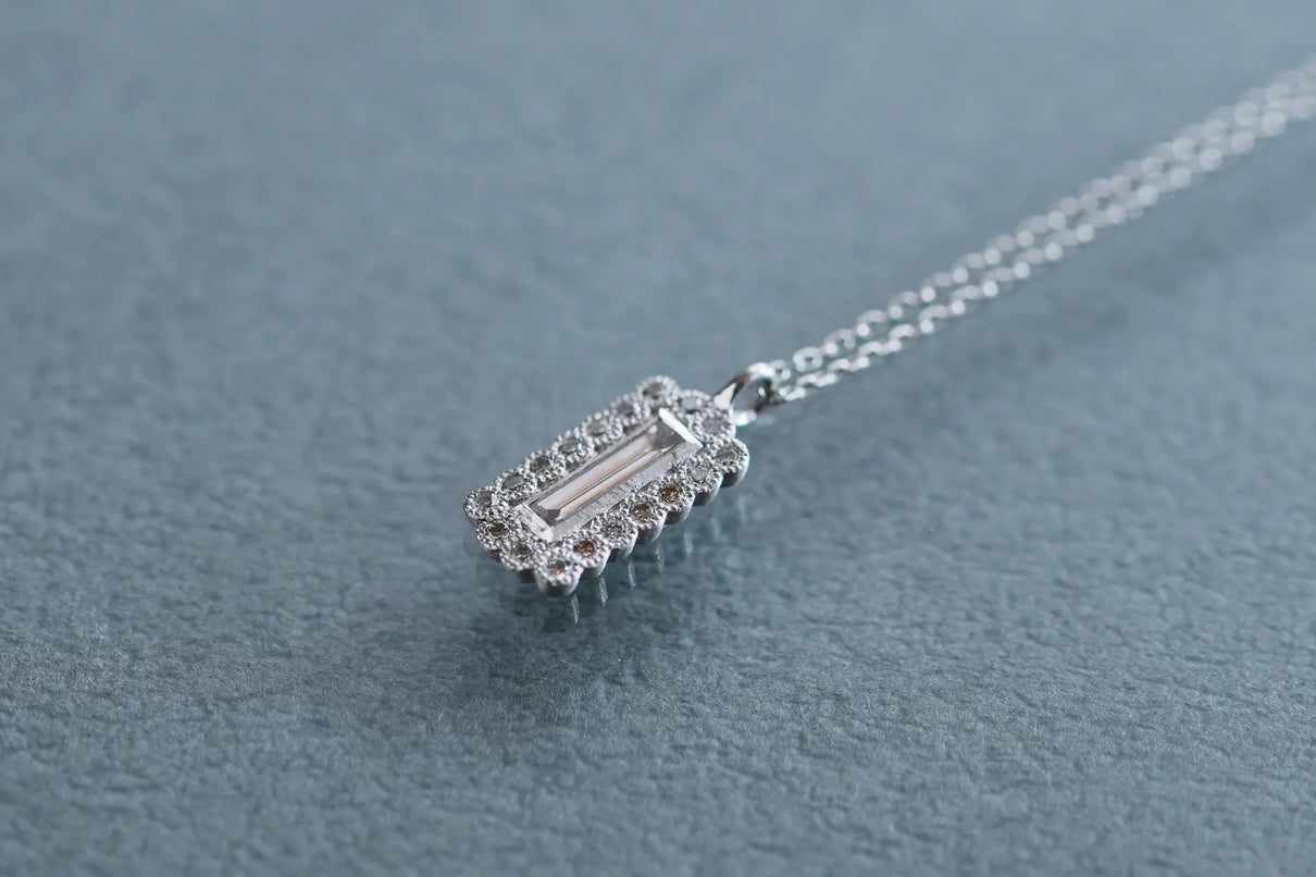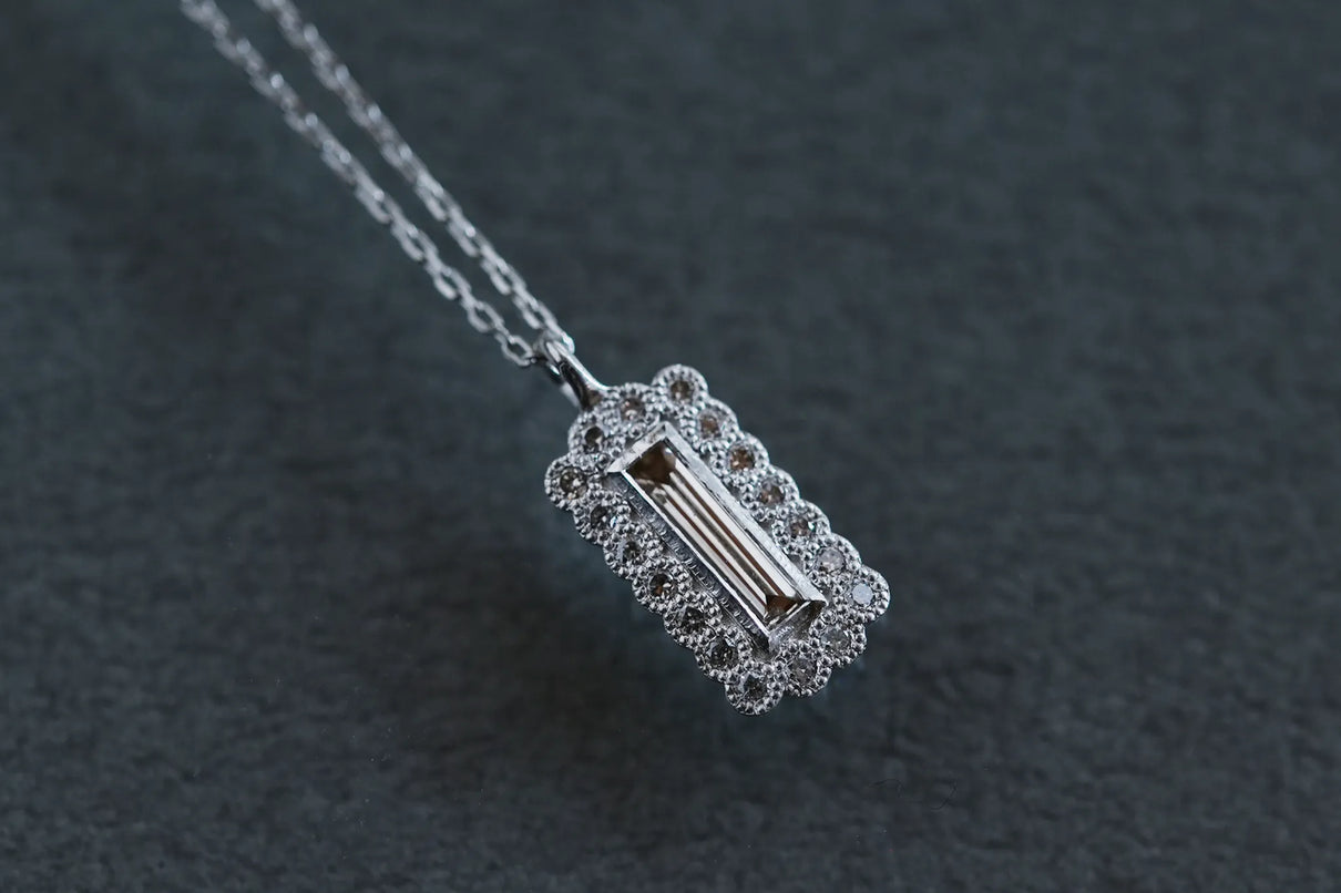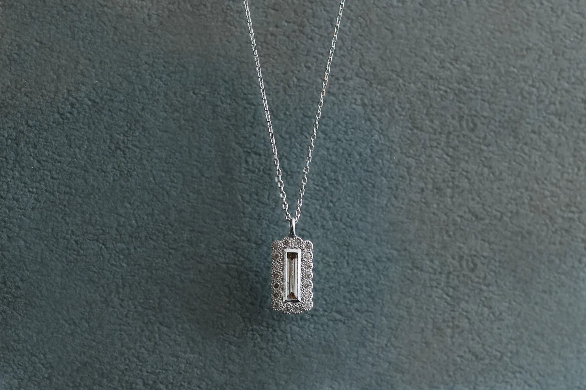 繊細なバゲットカットのダイヤモンドを中央に留めた、一点もののネックレス。ラインのように華奢なカットが施されたクリアカラーダイヤモンドを、緻密なミルグレイン留めがなされた18ピースのメレダイヤモンドで額縁のように取り巻きました。愛らしいシルエットと中央のシャープなバゲットカットの輝きの対比が、甘くなりすぎずに心地よいバランスを保ち、軽やかで品のある印象を胸元に添えます。日常使いはもちろん、特別な贈り物にもおすすめです。