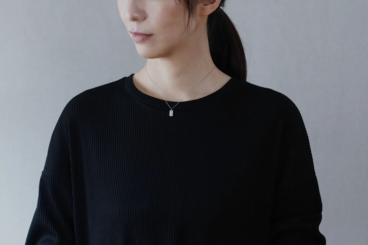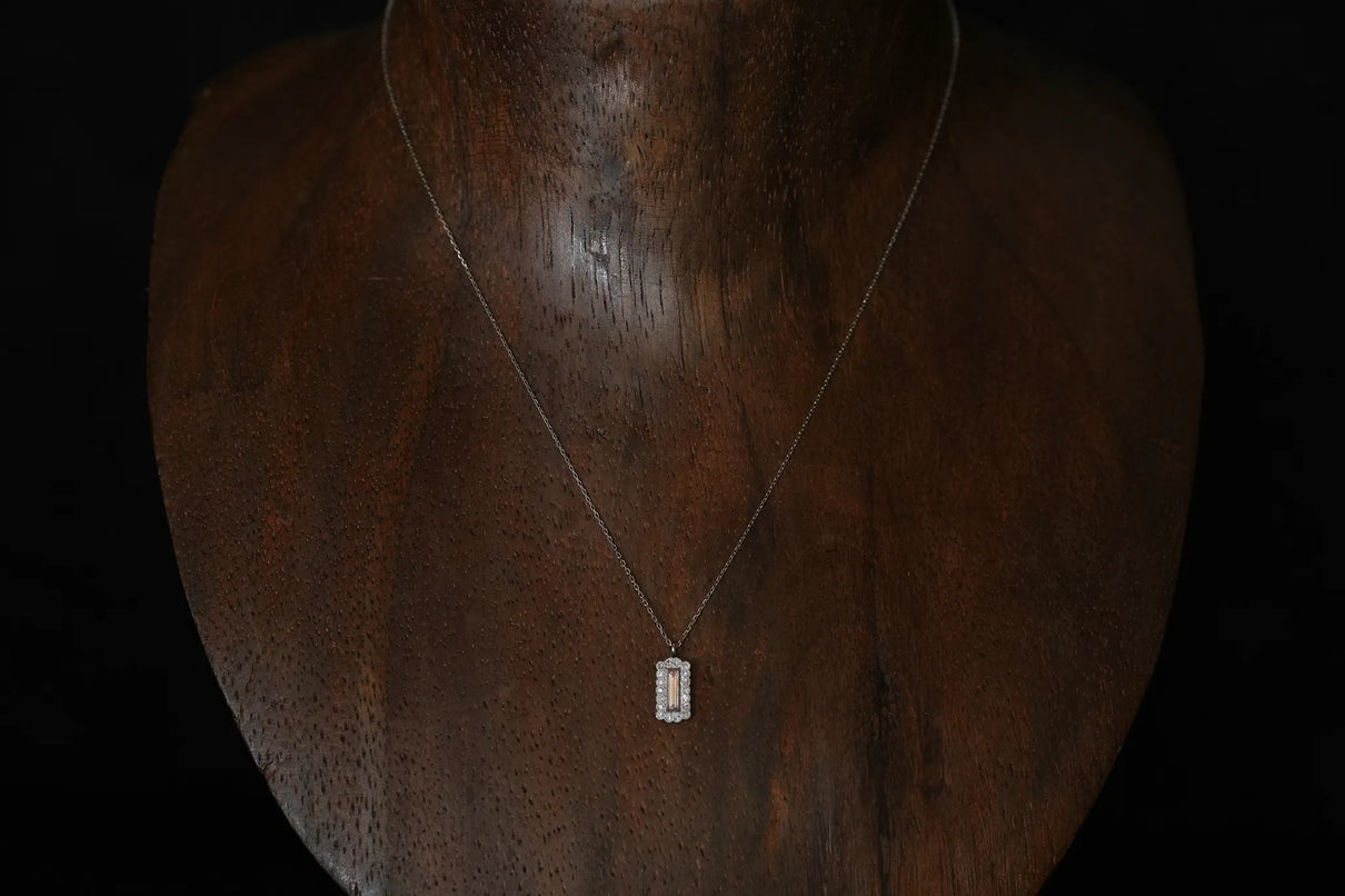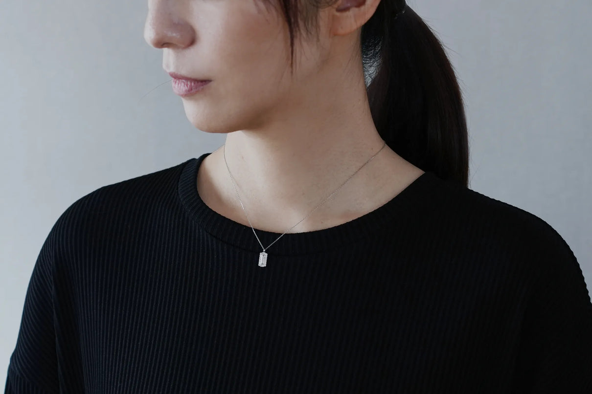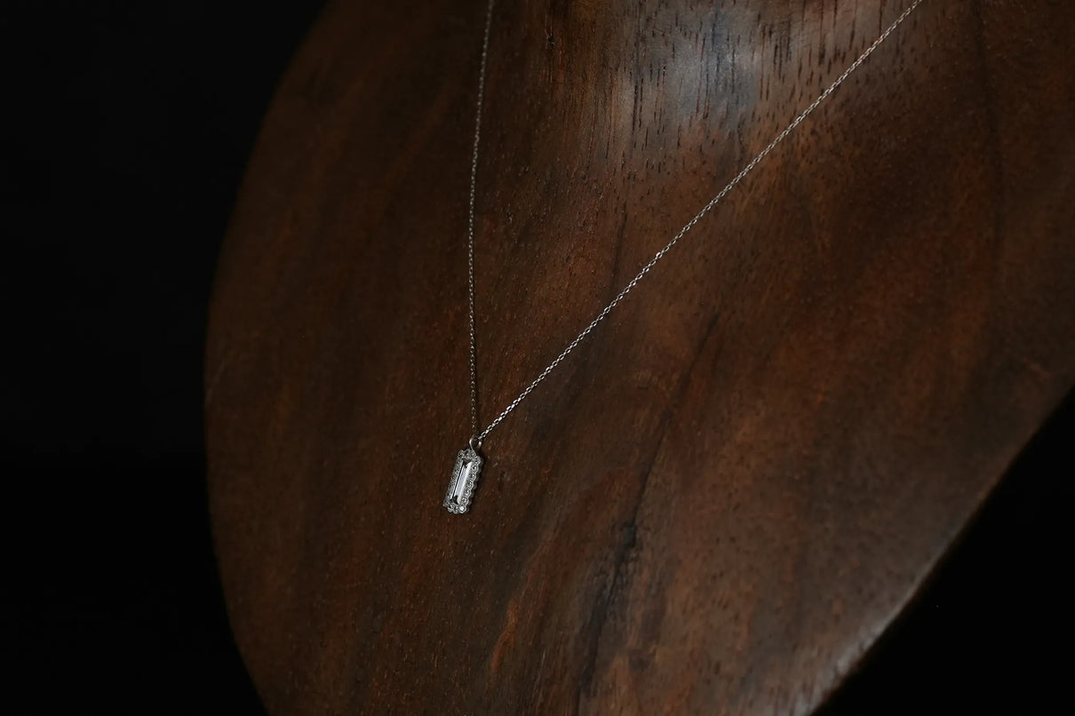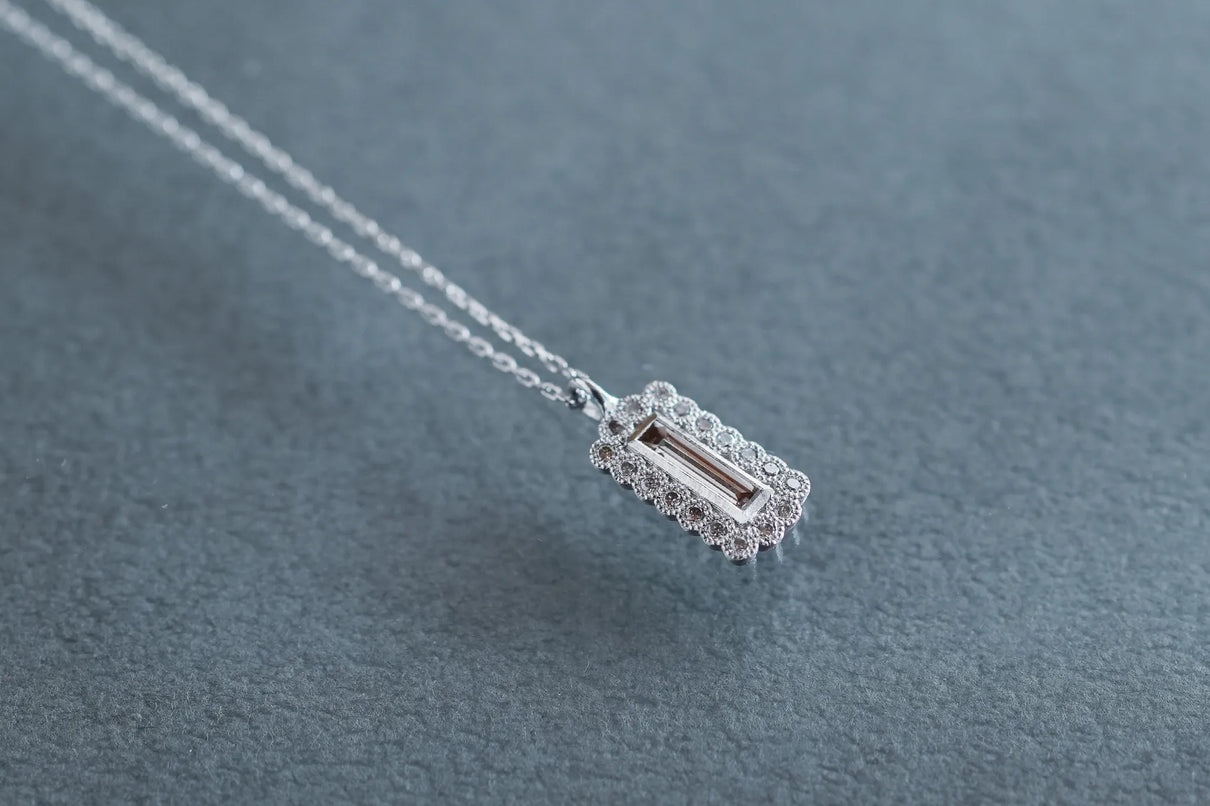 繊細なバゲットカットのダイヤモンドを中央に留めた、一点もののネックレス。ラインのように華奢なカットが施されたクリアカラーダイヤモンドを、緻密なミルグレイン留めがなされた18ピースのメレダイヤモンドで額縁のように取り巻きました。愛らしいシルエットと中央のシャープなバゲットカットの輝きの対比が、甘くなりすぎずに心地よいバランスを保ち、軽やかで品のある印象を胸元に添えます。日常使いはもちろん、特別な贈り物にもおすすめです。