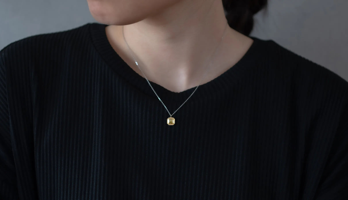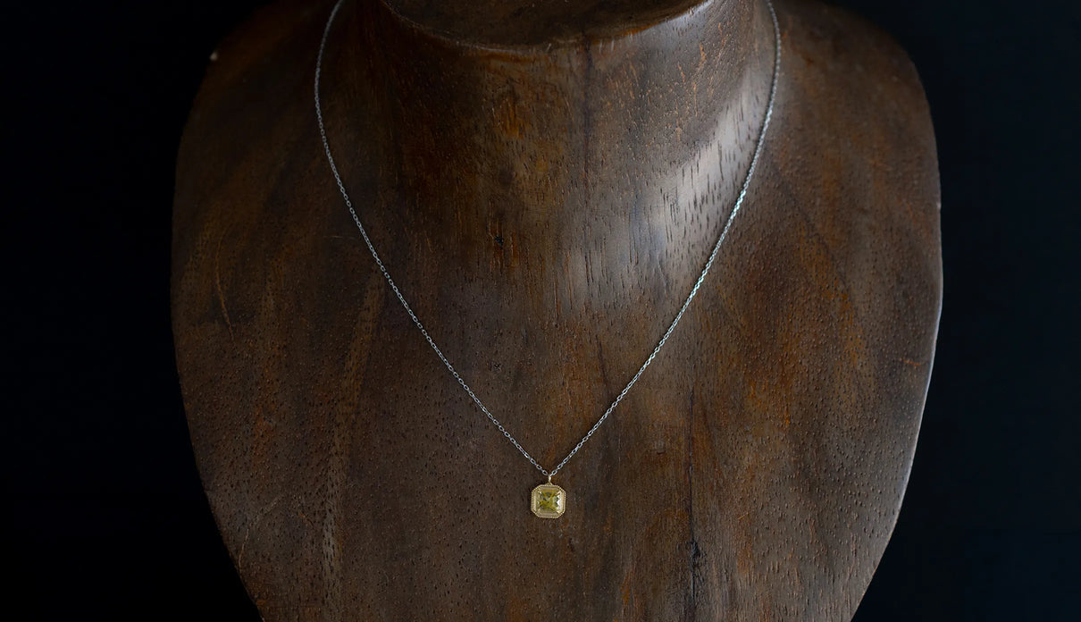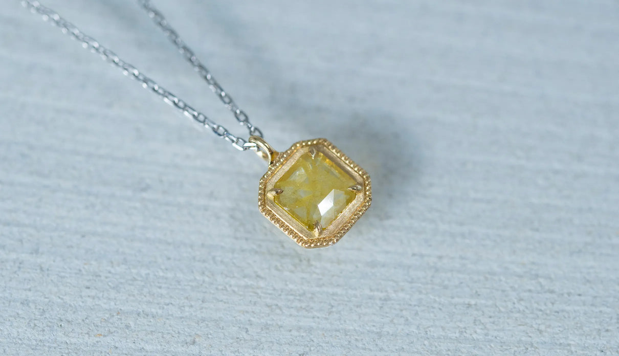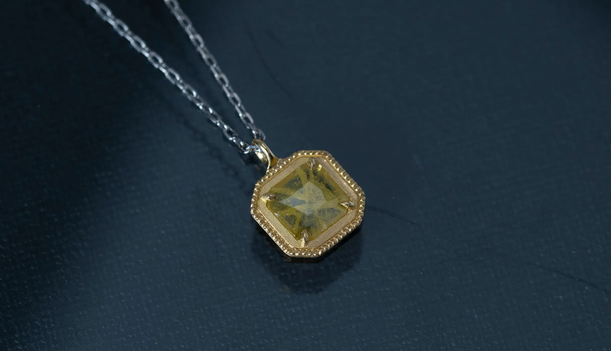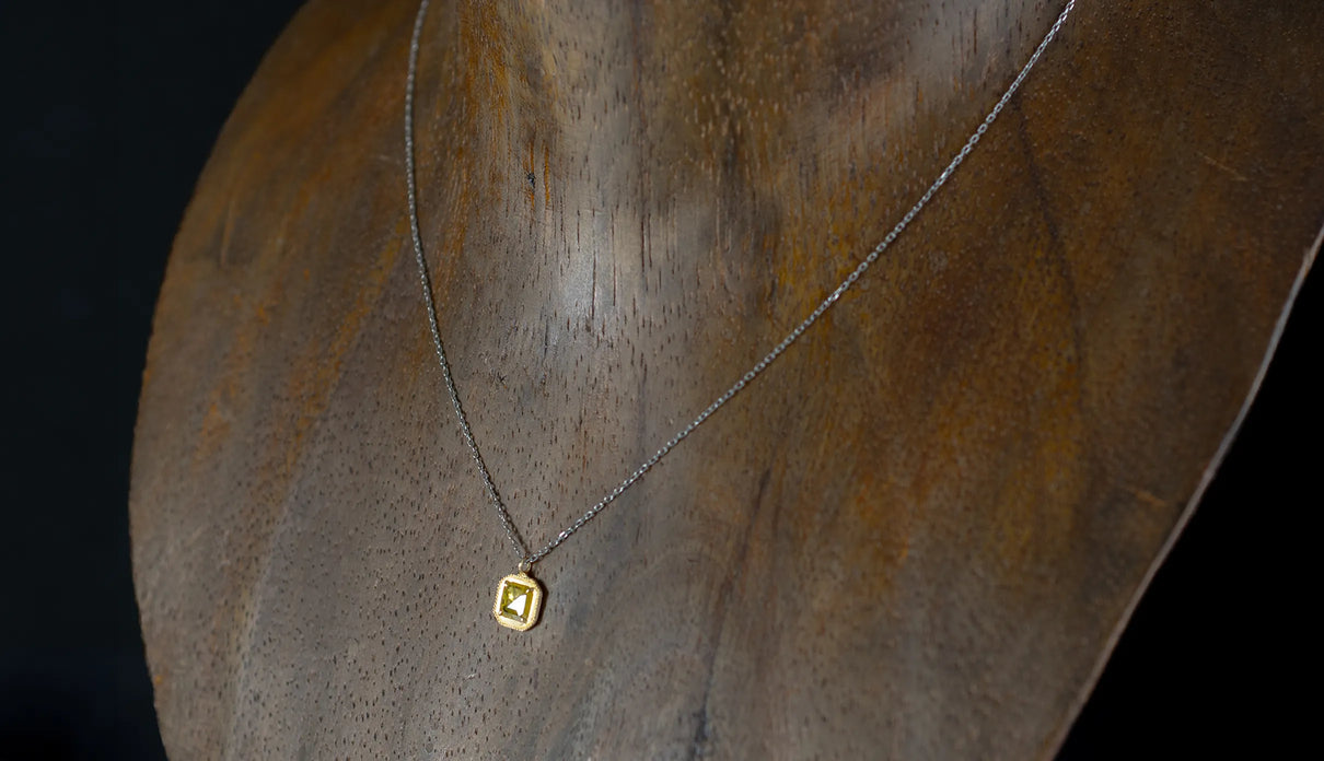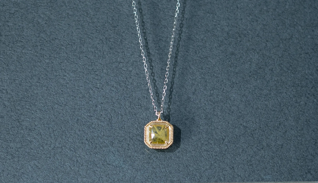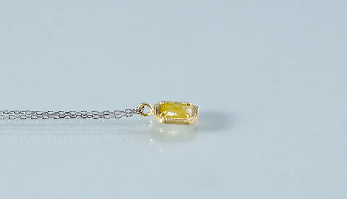 ナチュラルカラーのイエローダイヤモンドで仕立てた一点もののネックレス。鮮やかな黄色の結晶の中に放射状に網目のように広がる内包物が、唯一無二の個性を放つピースを厳選しました。光を受けるたびに現れるその絵画のような表情をお愉しみいただけます。薄く研磨されたローズカットの表面は瑞々しく潤みを帯びた輝きを秘め、胸元に上品な彩りを添えてくれます。イエローダイヤモンドを引き立てるK18イエローゴールドのフレームには、細やかなミルグレインを配しました。トップの黄色味を引き立てるように、あえて色を違えて添えたプラチナチェーンとの対比が程よいアクセントとなり、装いに華を添えてくれます。4月生まれの誕生石でもあるダイヤモンド。特別なお守りとして身に着けていただくのもおすすめです。
