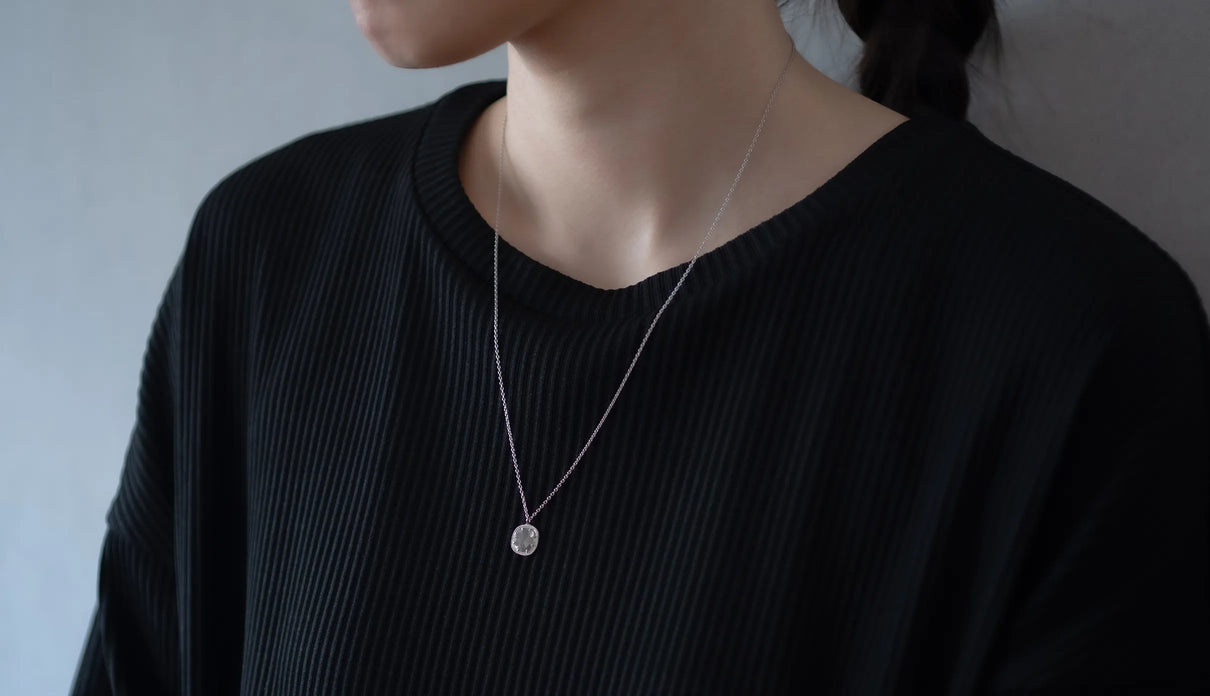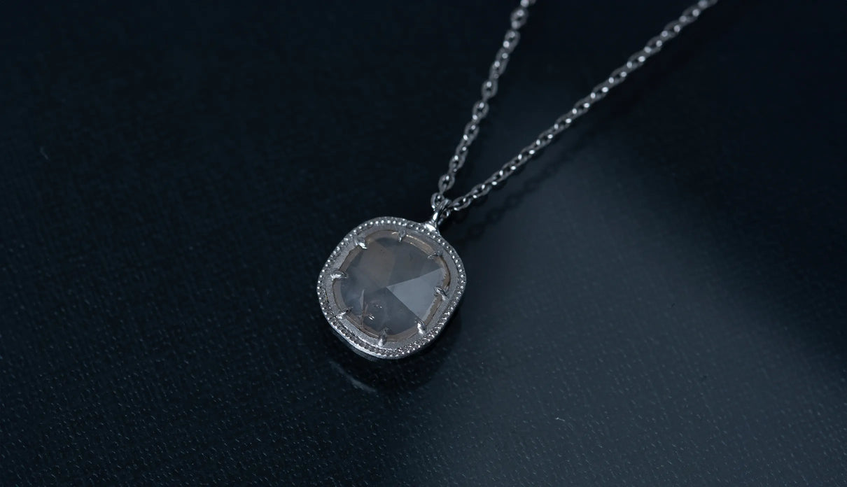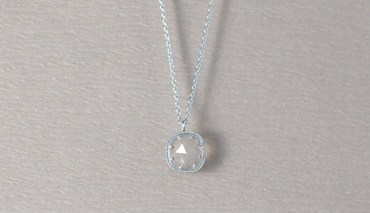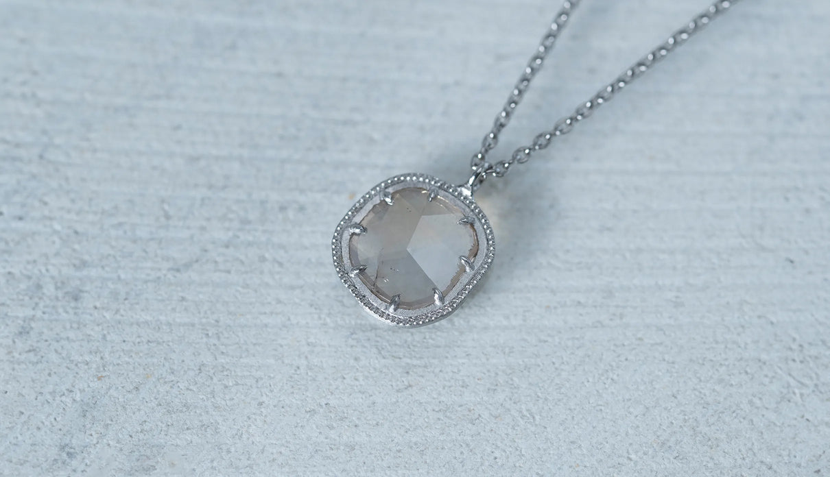 極めてクリアに近いライトグレーのダイヤモンドで仕立てた一点もののネックレス。薄く削り出されたローズカットの表面は、陽の光を浴び柔らかく煌めく湖面のように優しい輝きを湛えています。程よい大きさがあり、その淡く落ち着きのあるダイヤモンドならではの煌めきを堪能いただけるピースです。プラチナの繊細なミルグレインで取り巻き、チェーンは使い勝手の良い50cmのミドルレングスを選びました。原石感の残るナチュラルな佇まいはシーンを選ばず、日常使いにも自然に寄り添うデザインです。4月生まれの誕生石でもあるダイヤモンド。特別なお守りとして身に着けていただくのもおすすめです。