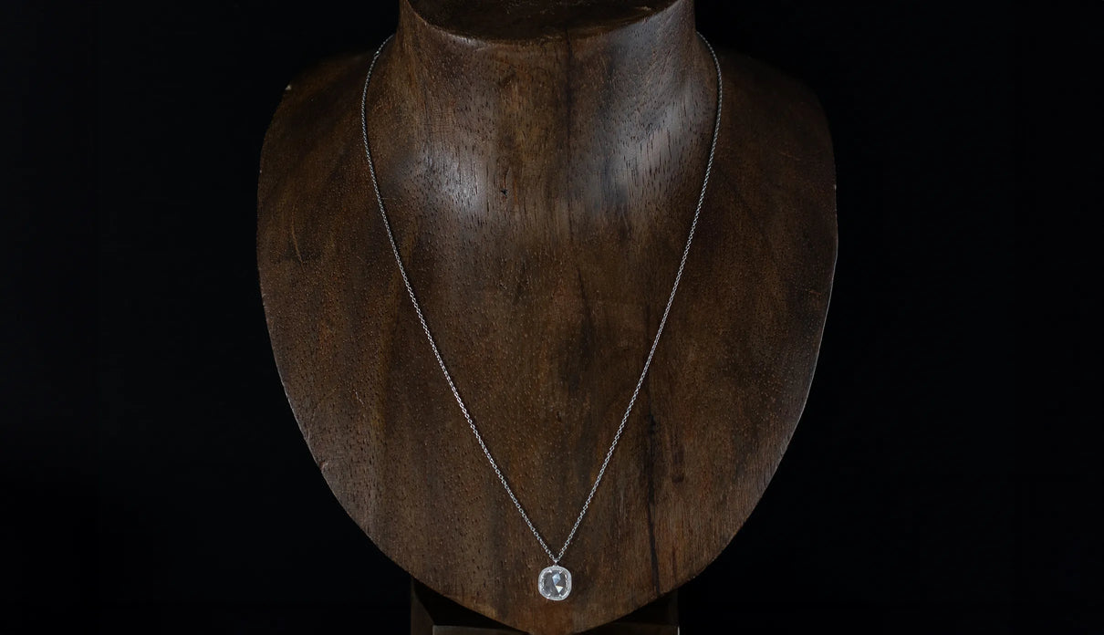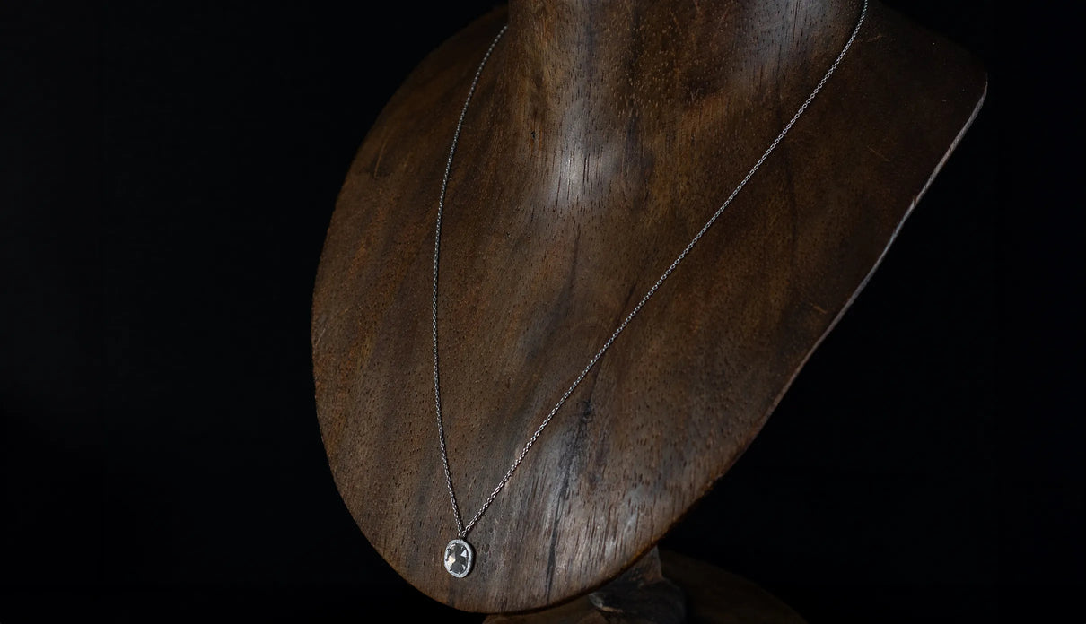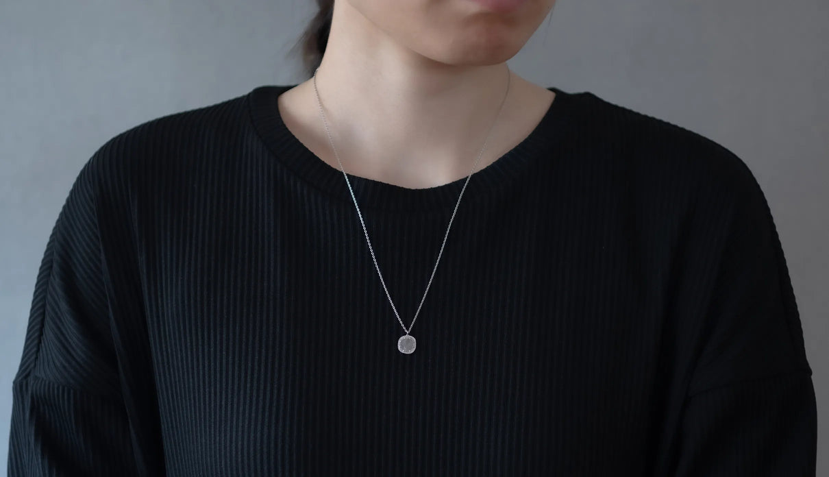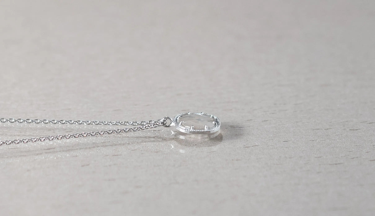 極めてクリアに近いライトグレーのダイヤモンドで仕立てた一点もののネックレス。薄く削り出されたローズカットの表面は、陽の光を浴び柔らかく煌めく湖面のように優しい輝きを湛えています。程よい大きさがあり、その淡く落ち着きのあるダイヤモンドならではの煌めきを堪能いただけるピースです。プラチナの繊細なミルグレインで取り巻き、チェーンは使い勝手の良い50cmのミドルレングスを選びました。原石感の残るナチュラルな佇まいはシーンを選ばず、日常使いにも自然に寄り添うデザインです。4月生まれの誕生石でもあるダイヤモンド。特別なお守りとして身に着けていただくのもおすすめです。