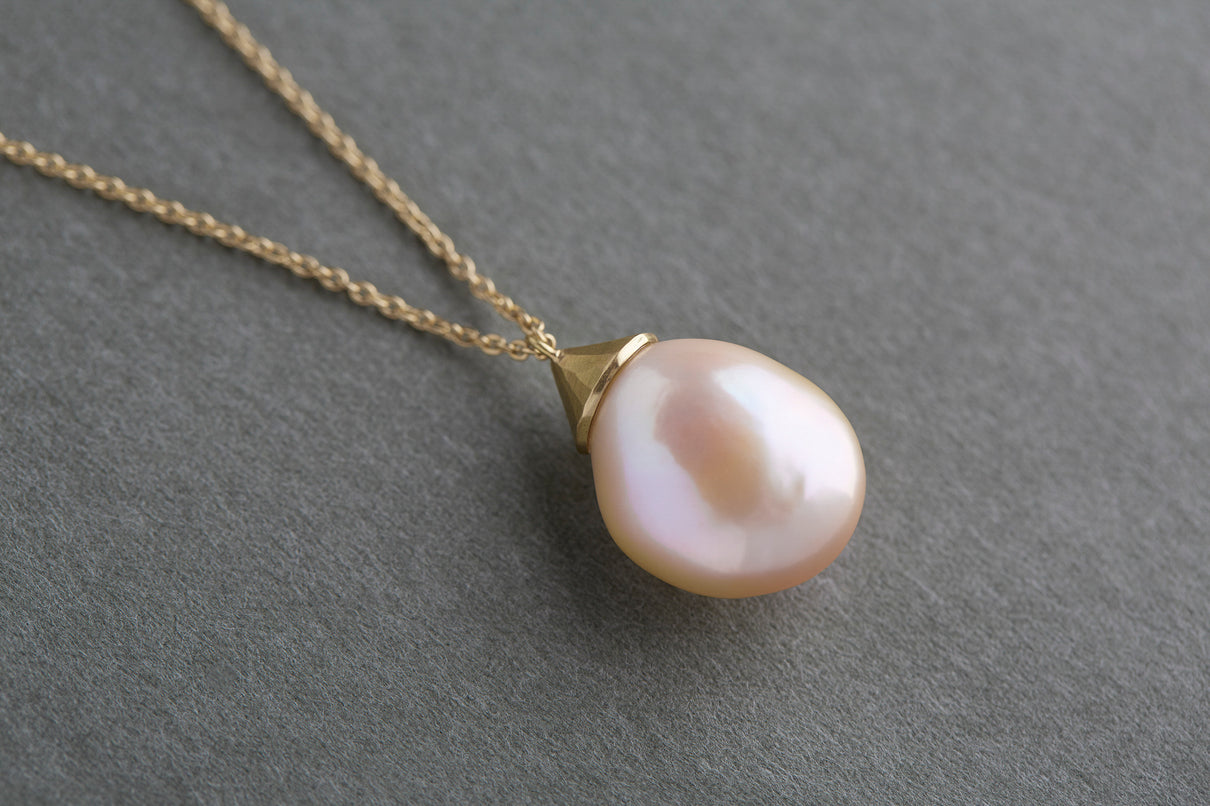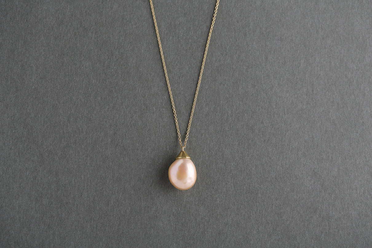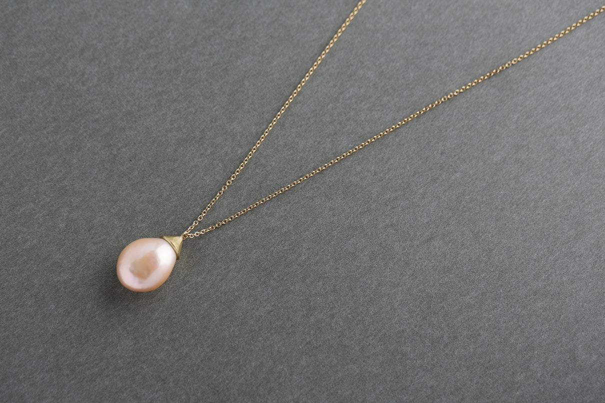 美しい照りで奥深く輝く、個性豊かで存在感のある大ぶりのパールに三角帽子をかぶせたような愛らしさのある1点もののネックレス。淡い橙色~桃色を基調としたパールはおおらかで優しい印象で、装いの主役として華やぎます。