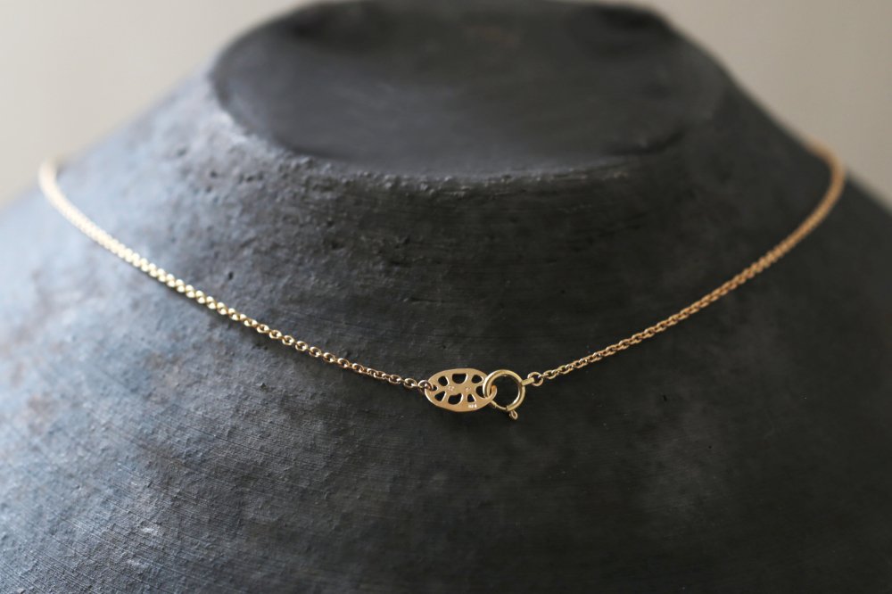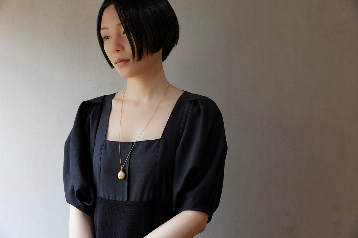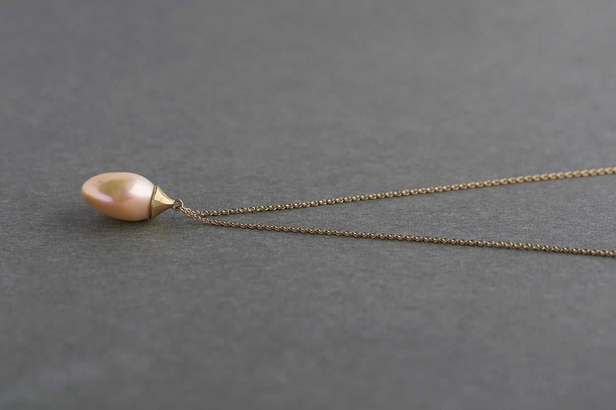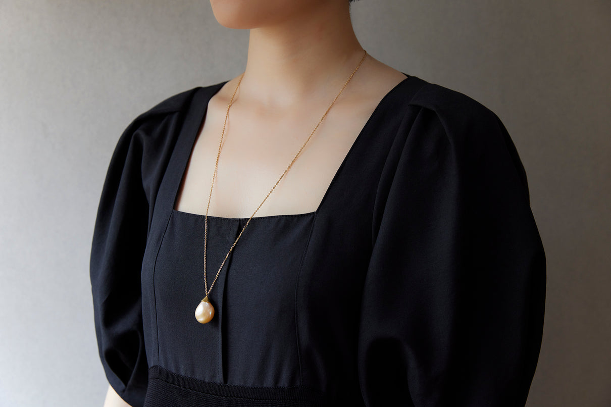 美しい照りで奥深く輝く、個性豊かで存在感のある大ぶりのパールに三角帽子をかぶせたような愛らしさのある1点もののネックレス。淡い橙色~桃色を基調としたパールはおおらかで優しい印象で、装いの主役として華やぎます。