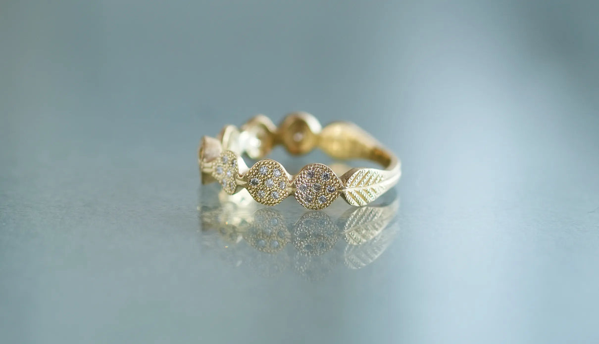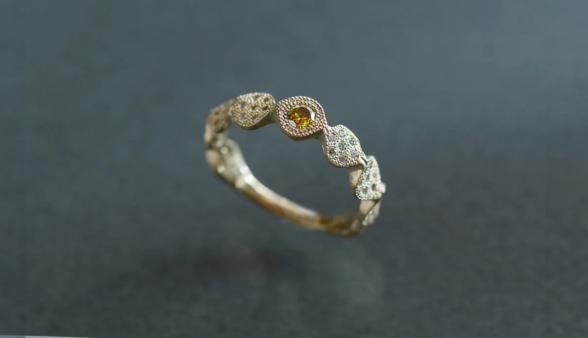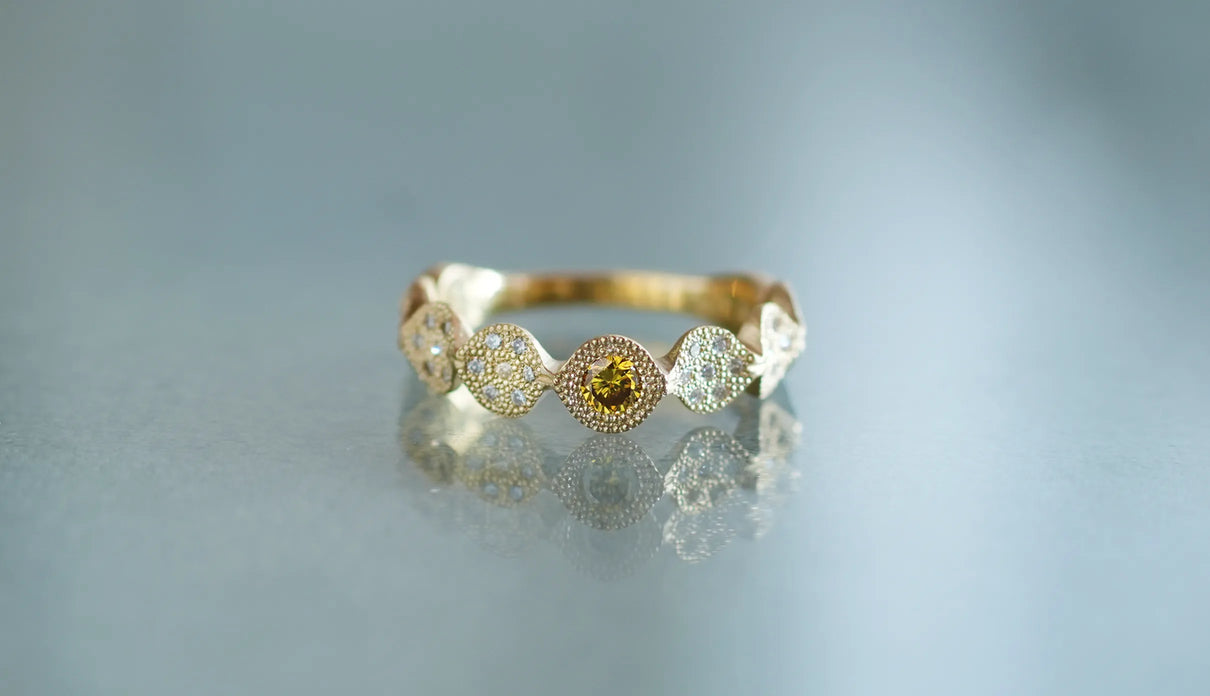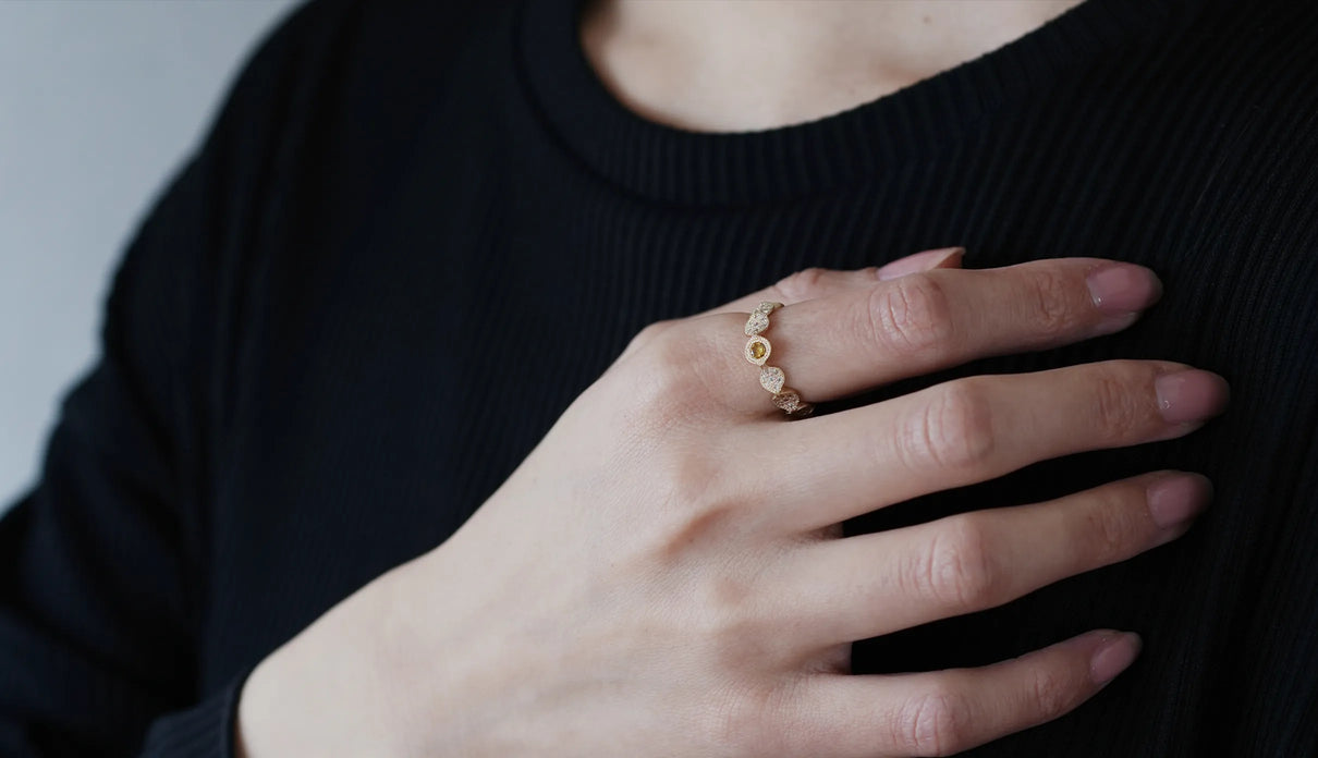 いくつも連なる葉っぱをモチーフに、1枚1枚わずかに異なる表情に遊び心を込めた " Leaf " コレクション。中央の葉には存在感のあるナチュラルカラーのイエローダイヤモンドを、そこから続く葉には極小のクリアカラーのメレダイヤモンドを配し、全体を細かな手仕事のミル打ちで贅沢に縁取った一点もののリングです。ナチュラルカラーでありながら深く色濃い彩りを呈するファンシーディープイエローのダイヤモンドがリング中央で華やかに輝きを放ちます。4月生まれの誕生石でもあるダイヤモンド。装いの主役として日常的に身に着けていただくのはもちろん、特別な贈りものにも最適なアイテムです。