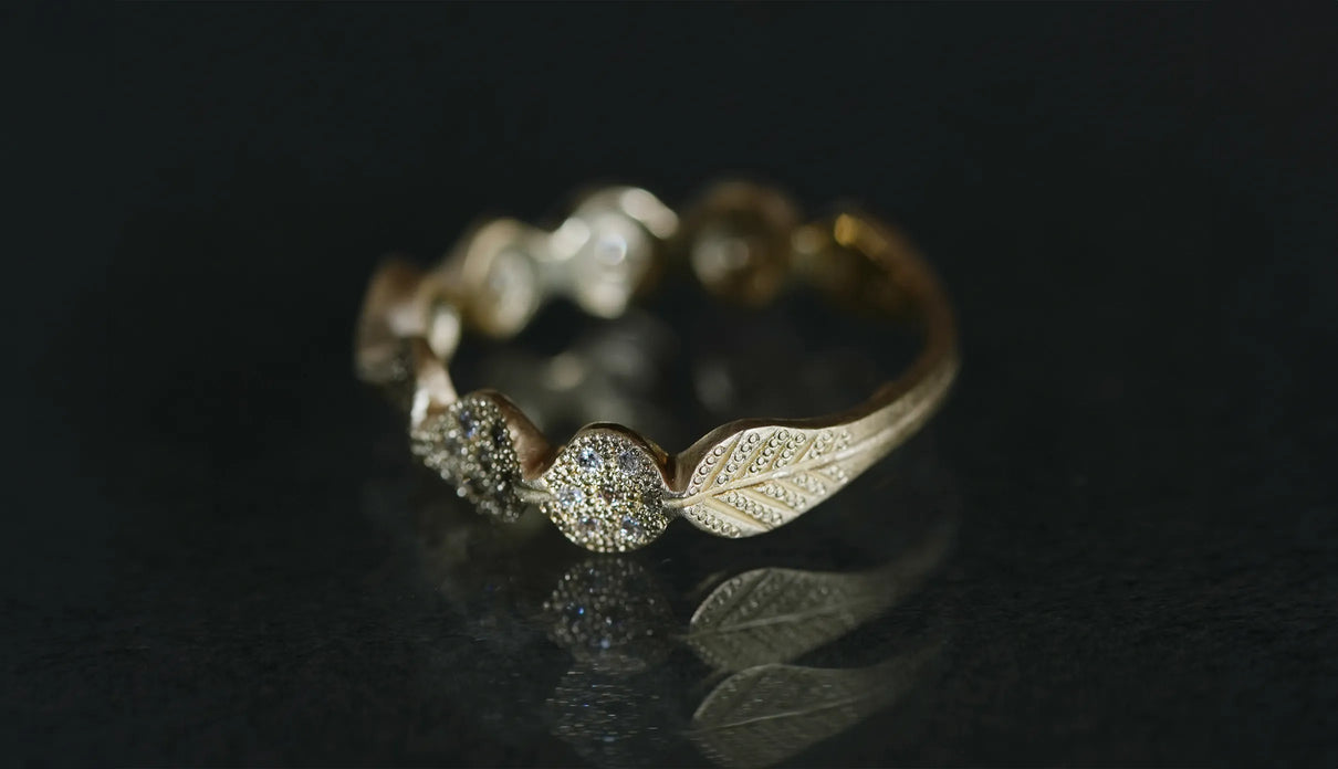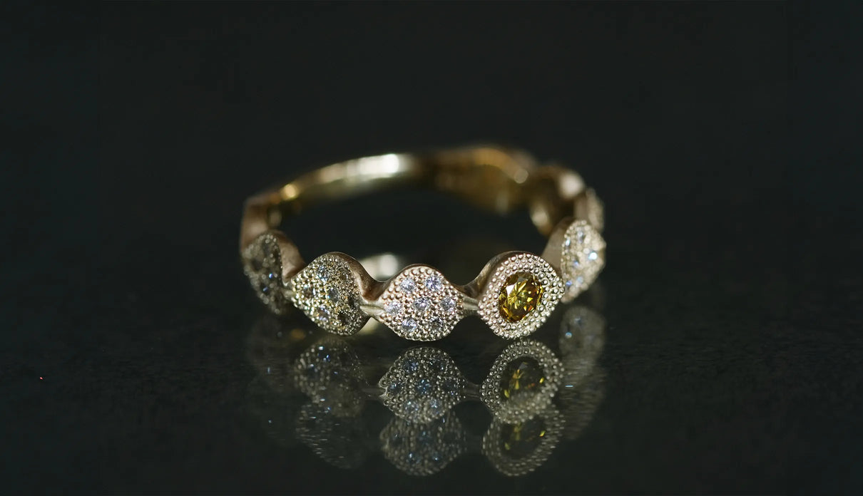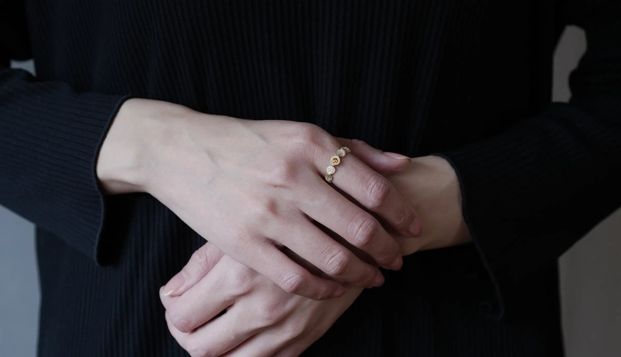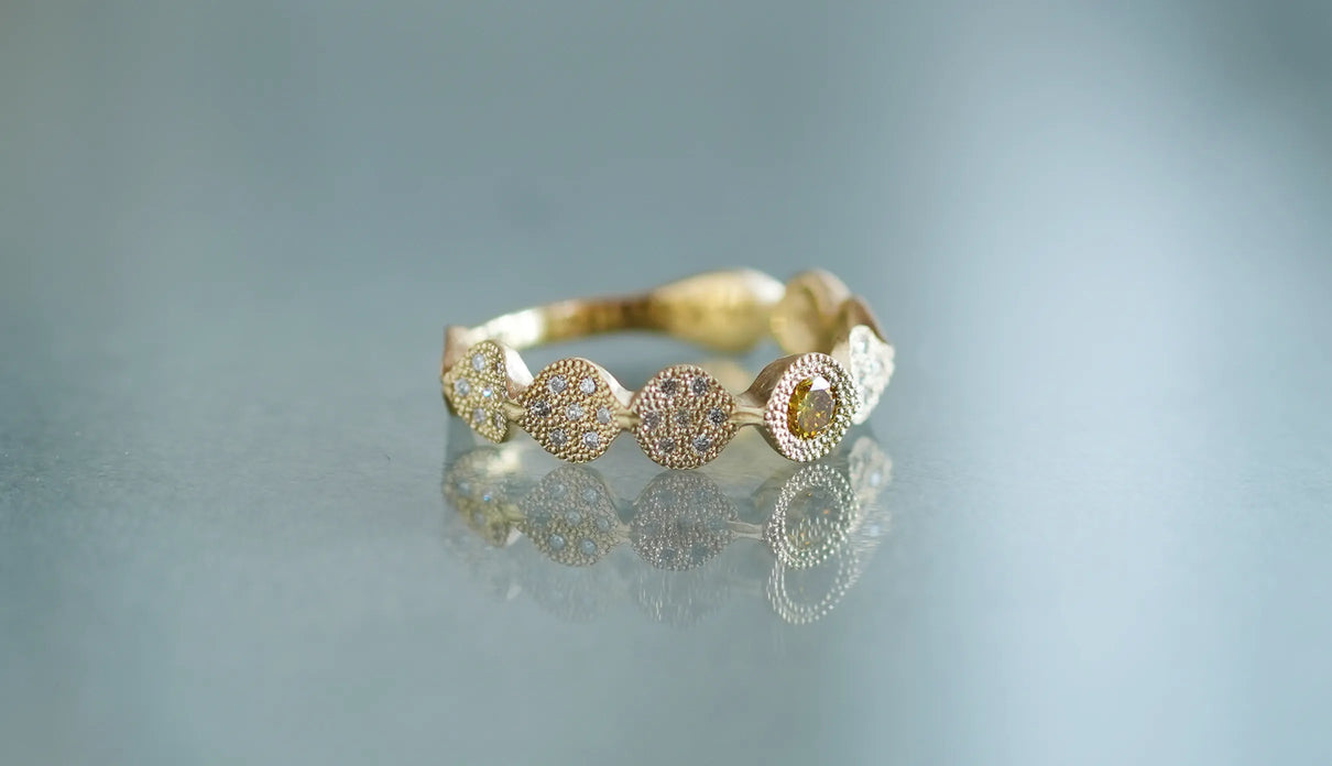 いくつも連なる葉っぱをモチーフに、1枚1枚わずかに異なる表情に遊び心を込めた " Leaf " コレクション。中央の葉には存在感のあるナチュラルカラーのイエローダイヤモンドを、そこから続く葉には極小のクリアカラーのメレダイヤモンドを配し、全体を細かな手仕事のミル打ちで贅沢に縁取った一点もののリングです。ナチュラルカラーでありながら深く色濃い彩りを呈するファンシーディープイエローのダイヤモンドがリング中央で華やかに輝きを放ちます。4月生まれの誕生石でもあるダイヤモンド。装いの主役として日常的に身に着けていただくのはもちろん、特別な贈りものにも最適なアイテムです。
