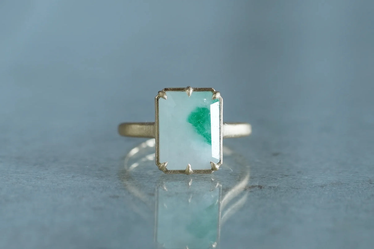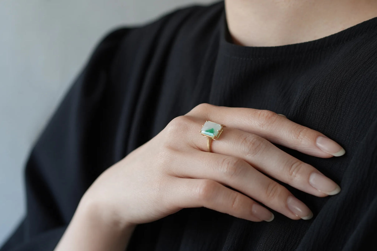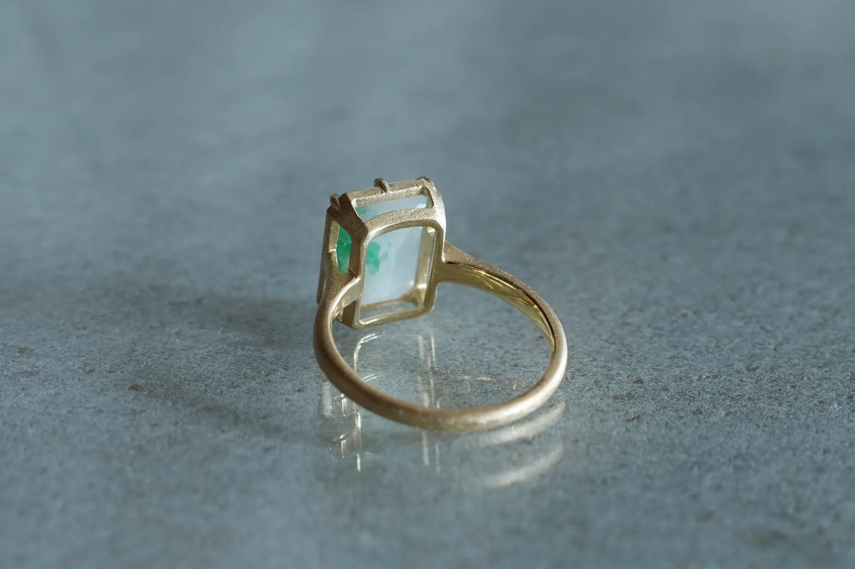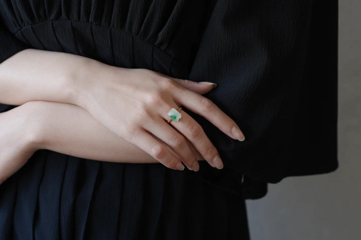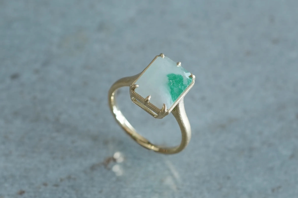 白いクォーツの中に鮮やかな緑が浮かぶ "マトリックスエメラルド"で仕立てた一点もののリング。鉱物コレクターの間でもその独特の美しさと稀少性から高く注目される石で、一般的には原石のような素朴さや荒さが強く残るものが多く、ジュエリーに仕立てられるほどの上質なピースはほんのわずかしか存在しないほど。淡く白くけむる水面に絵の具をひとしずく落としたような、静けさと有機的なリズムが共存する、まるでアートのような調和のとれた美しさを備えたピースを選りすぐりました。計算されたかのような配置でエメラルドを内包するピースを上下三つずつ配した繊細な爪で留め、なだらかに丸みを帯びたリングアームを合わせたデザイン。マットな質感を纏ったイエローゴールドが滑らかに艶めき、マトリックスエメラルドの神秘的な表情との対比が美しいバランスで寄り添い合います。日常的に身に着けていただくのはもちろん、5月の誕生石としても親しまれているエメラルドは、5月生まれの方の特別なお守りとして贈りものにも最適なアイテムです。