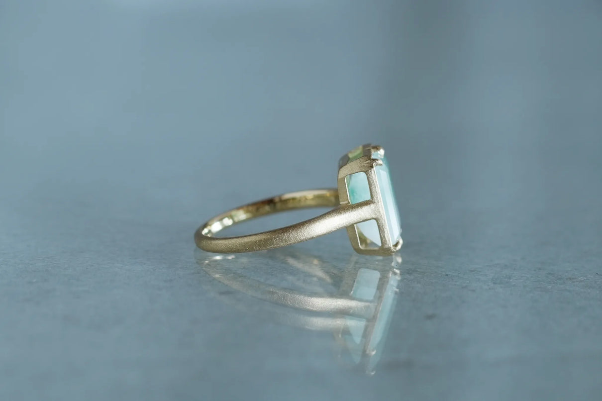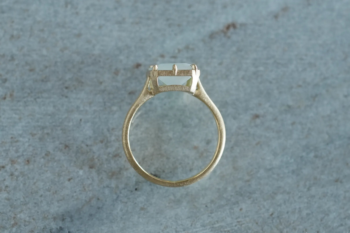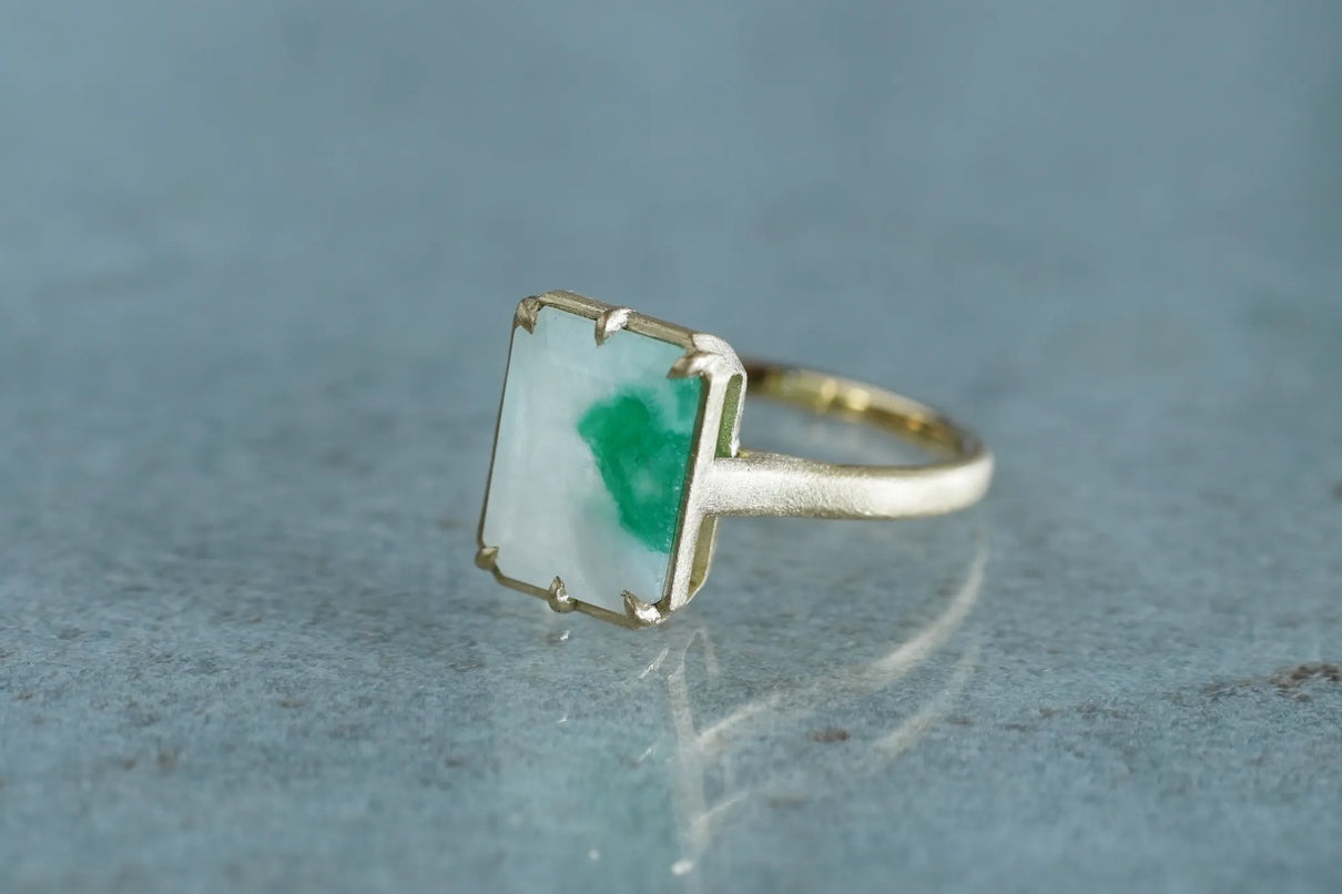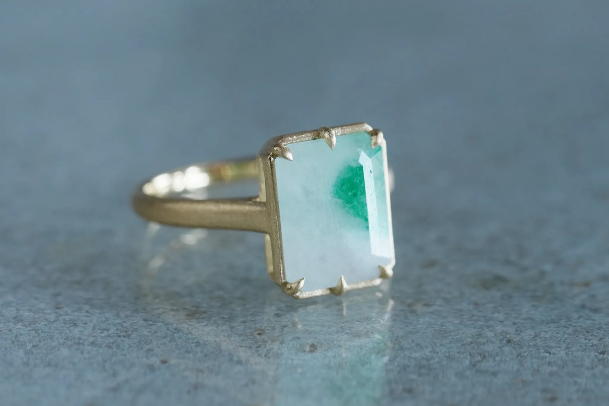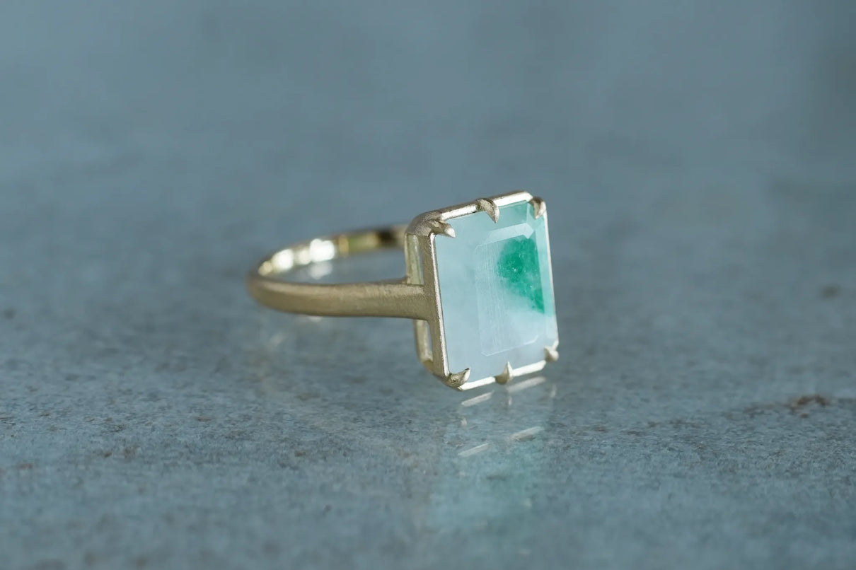 白いクォーツの中に鮮やかな緑が浮かぶ "マトリックスエメラルド"で仕立てた一点もののリング。鉱物コレクターの間でもその独特の美しさと稀少性から高く注目される石で、一般的には原石のような素朴さや荒さが強く残るものが多く、ジュエリーに仕立てられるほどの上質なピースはほんのわずかしか存在しないほど。淡く白くけむる水面に絵の具をひとしずく落としたような、静けさと有機的なリズムが共存する、まるでアートのような調和のとれた美しさを備えたピースを選りすぐりました。計算されたかのような配置でエメラルドを内包するピースを上下三つずつ配した繊細な爪で留め、なだらかに丸みを帯びたリングアームを合わせたデザイン。マットな質感を纏ったイエローゴールドが滑らかに艶めき、マトリックスエメラルドの神秘的な表情との対比が美しいバランスで寄り添い合います。日常的に身に着けていただくのはもちろん、5月の誕生石としても親しまれているエメラルドは、5月生まれの方の特別なお守りとして贈りものにも最適なアイテムです。