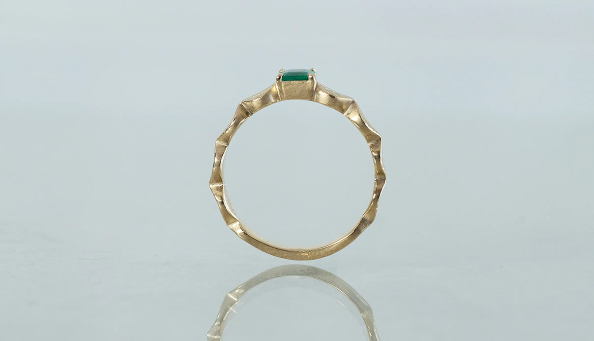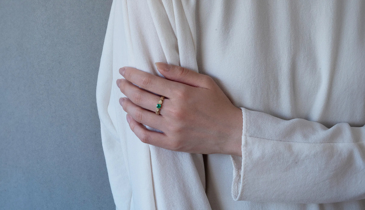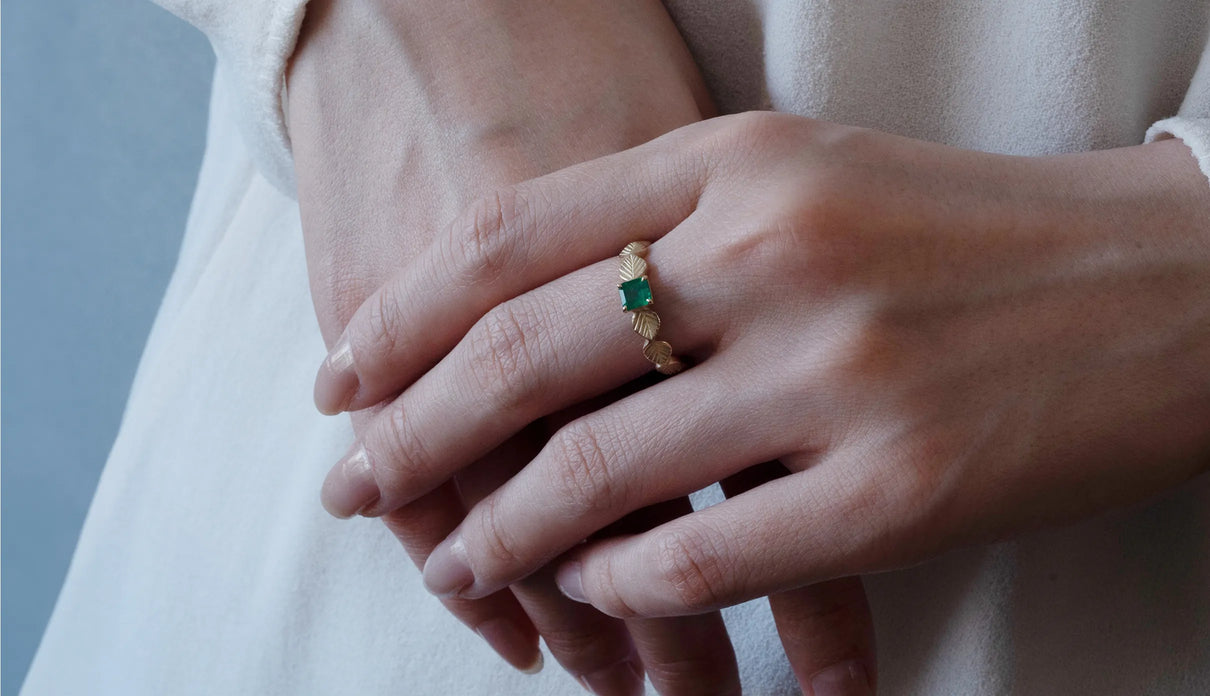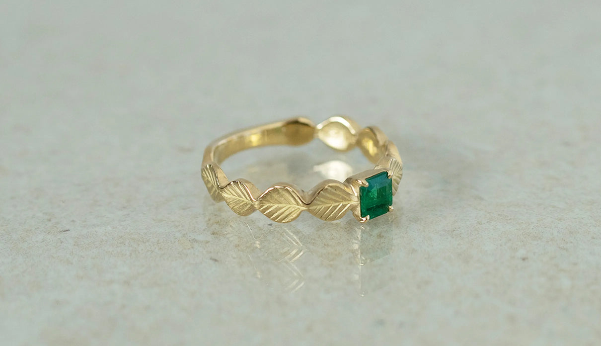 いくつも連なる葉っぱをモチーフに、1枚1枚わずかに異なる表情に遊び心を込めた"Leaf"シリーズの1点もののリング。高い透明度と鮮やかな発色を呈するエメラルドが中央で煌めき、上品な存在感を放っています。微かに内包物を秘めたピースは、趣のある表情を醸し、エメラルドの高貴な印象とはまた異なる奥ゆかしささえも感じさせます。アームの葉っぱは、幅広のLeaf タイプ。K18イエローゴールドの表面はマットに仕立てて、落ち着きのある華やかさと温かみを添えました。日常的に身に着けていただくのはもちろん、5月の誕生石としても親しまれているエメラルドは、5月生まれの方の特別なお守りとして贈りものにも最適なアイテムです。