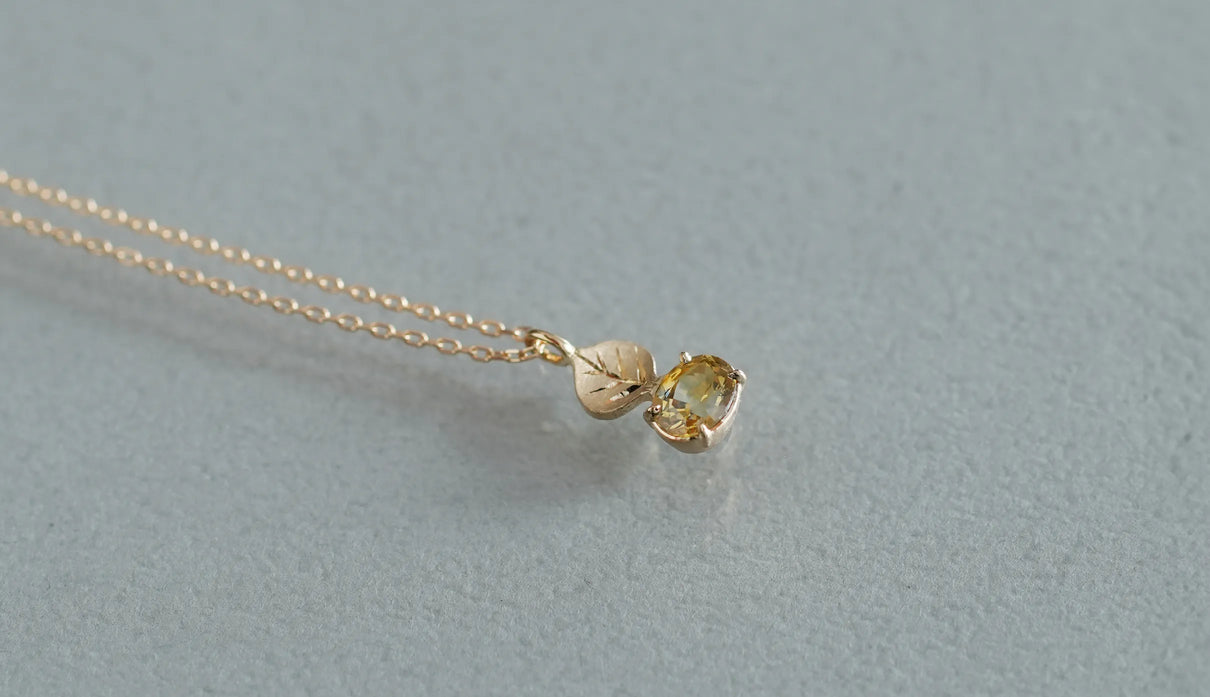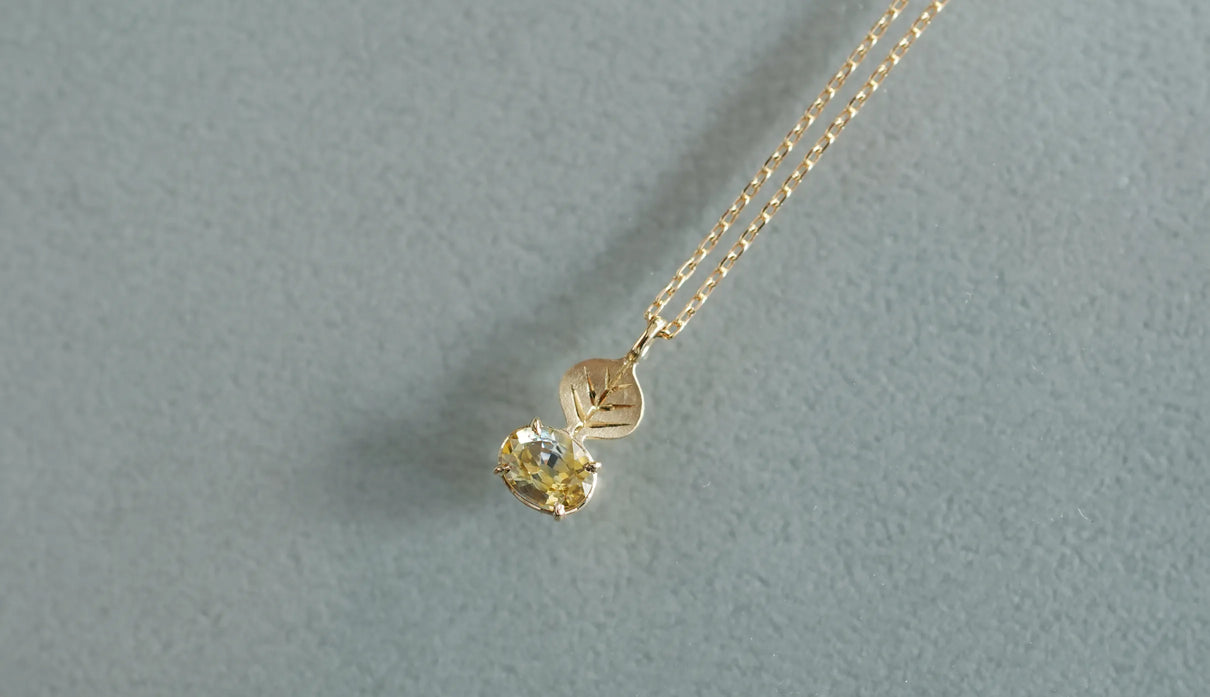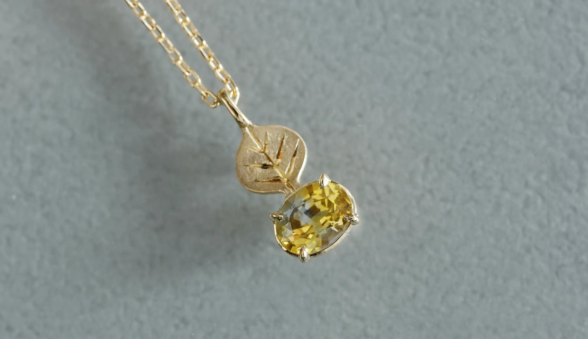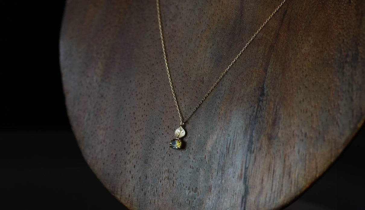 手彫りの葉脈が煌めく小さな葉っぱモチーフのイエローゴールドパーツに、バイカラーサファイアを留めた " Leaf " コレクションの一点もののネックレス。イエローベースの中に、わずかにブルーを秘めたラウンドカットのサファイア。遠目に眺めると2色が溶け合うようにグリーンのような色彩にも見えます。繊細な4本の爪で優しくサファイアをセッティングしました。小さく繊細な存在でありながら、ひと匙の個性と印象的な魅力を秘めた、日常の装いを品よく引き立てるデザインです。9月の誕生石としても親しまれているサファイアは、9月生まれの方の特別なお守りとして贈りものにも最適です。