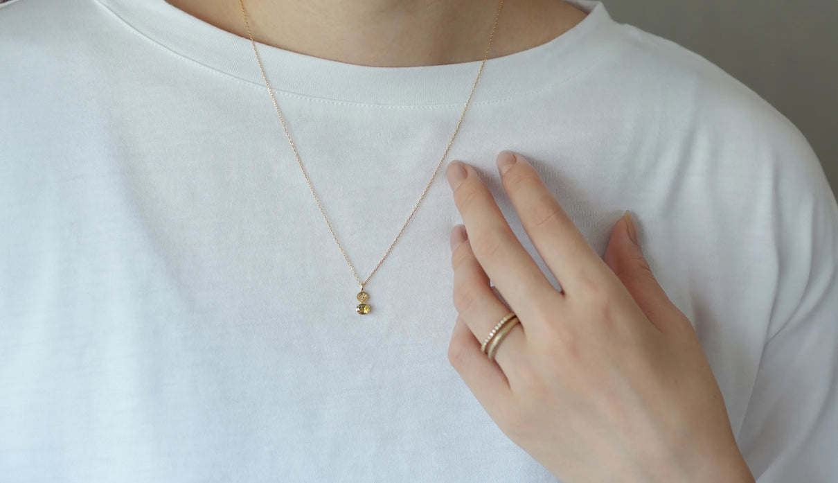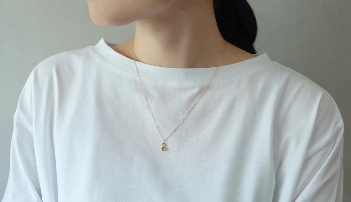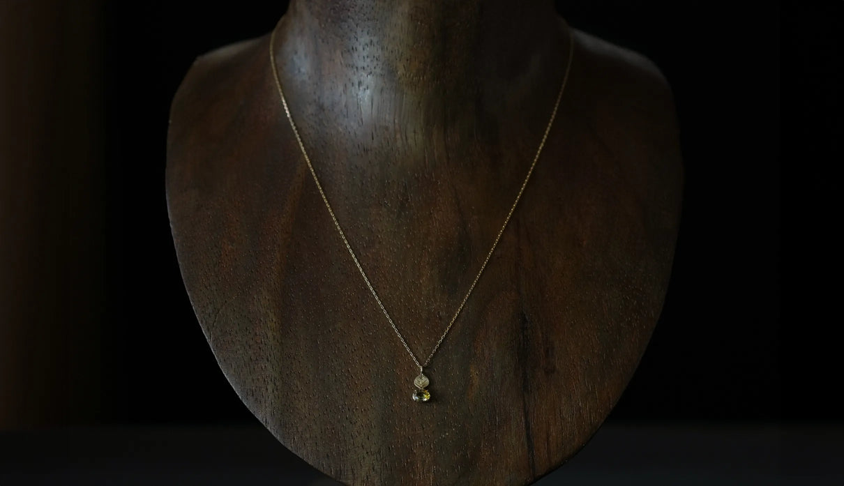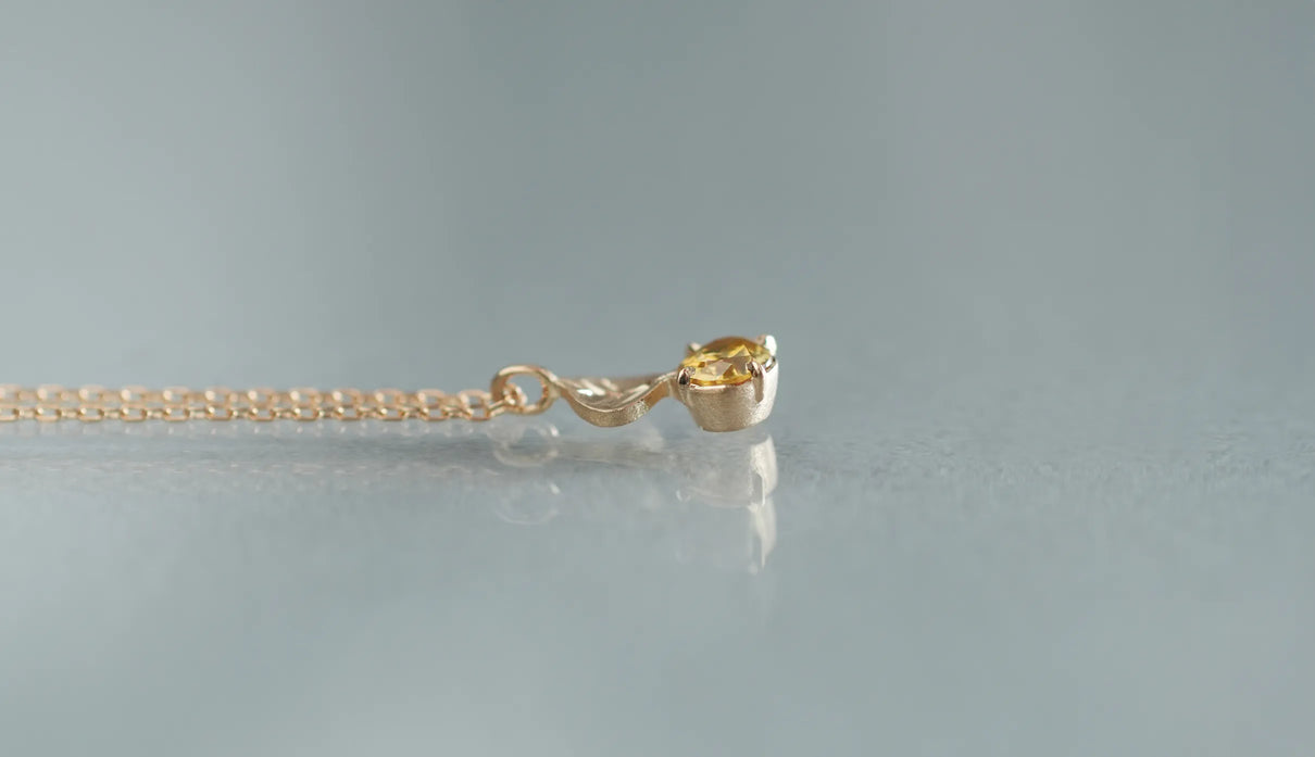 手彫りの葉脈が煌めく小さな葉っぱモチーフのイエローゴールドパーツに、バイカラーサファイアを留めた " Leaf " コレクションの一点もののネックレス。イエローベースの中に、わずかにブルーを秘めたラウンドカットのサファイア。遠目に眺めると2色が溶け合うようにグリーンのような色彩にも見えます。繊細な4本の爪で優しくサファイアをセッティングしました。小さく繊細な存在でありながら、ひと匙の個性と印象的な魅力を秘めた、日常の装いを品よく引き立てるデザインです。9月の誕生石としても親しまれているサファイアは、9月生まれの方の特別なお守りとして贈りものにも最適です。
