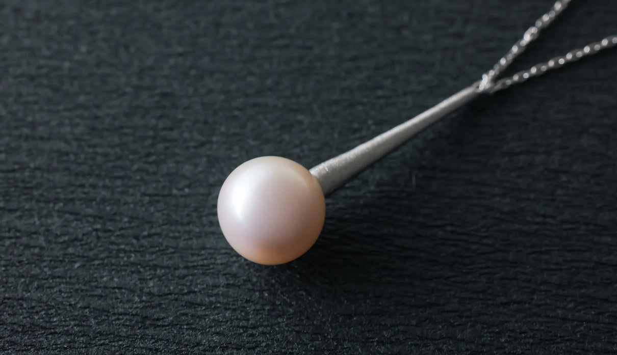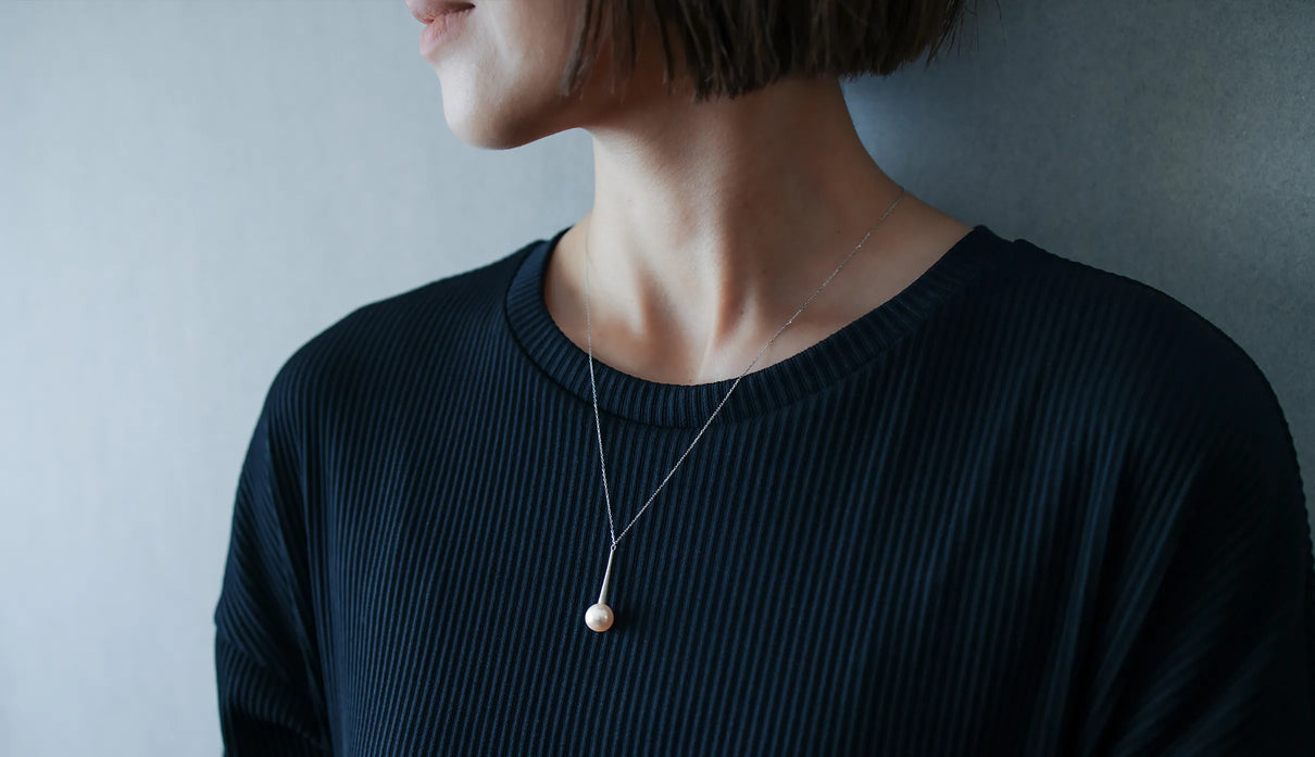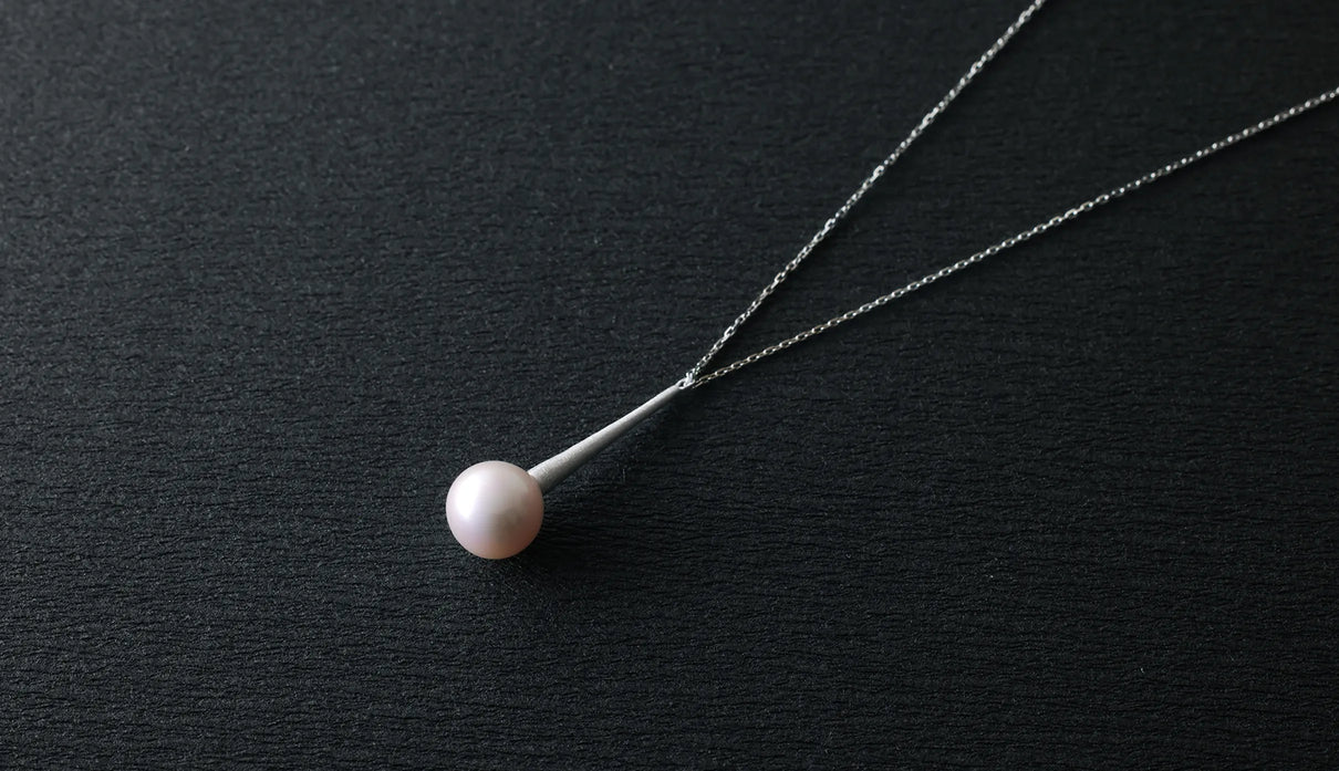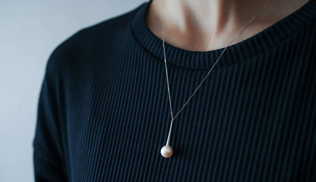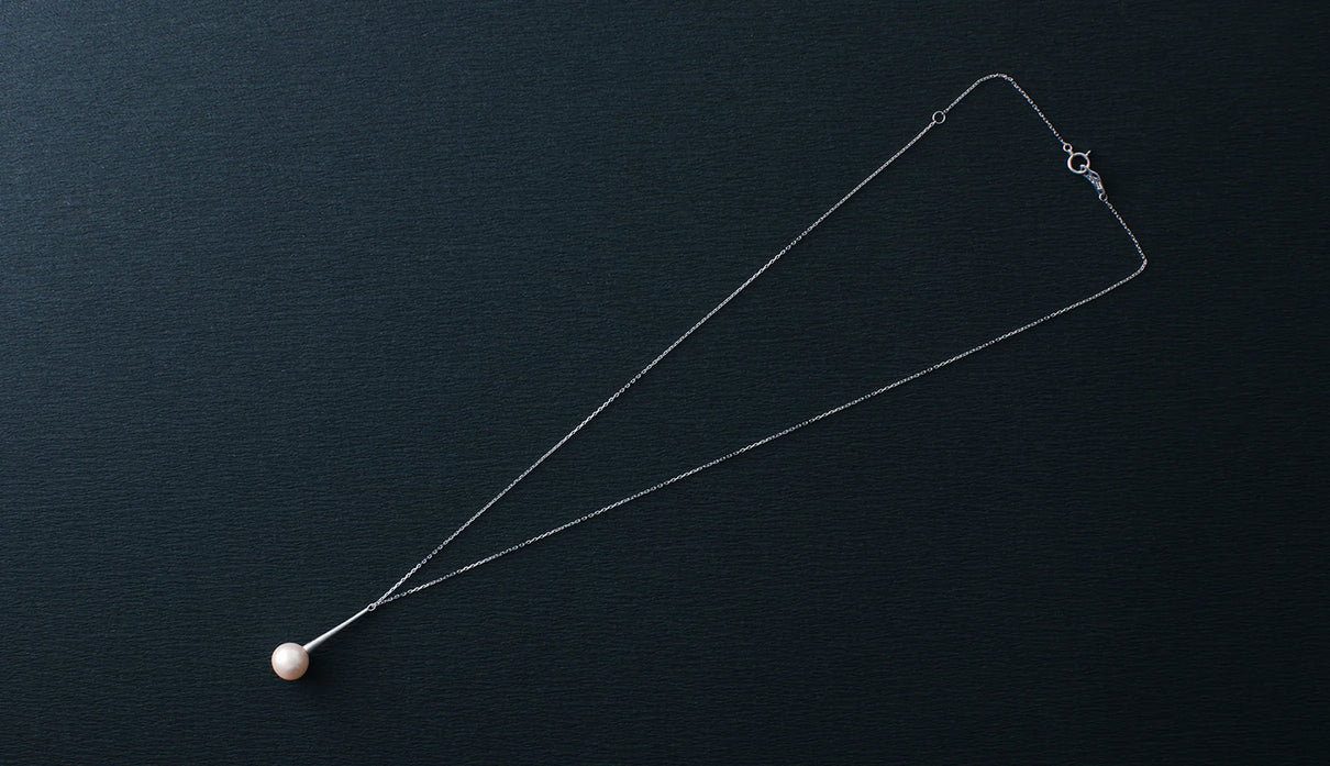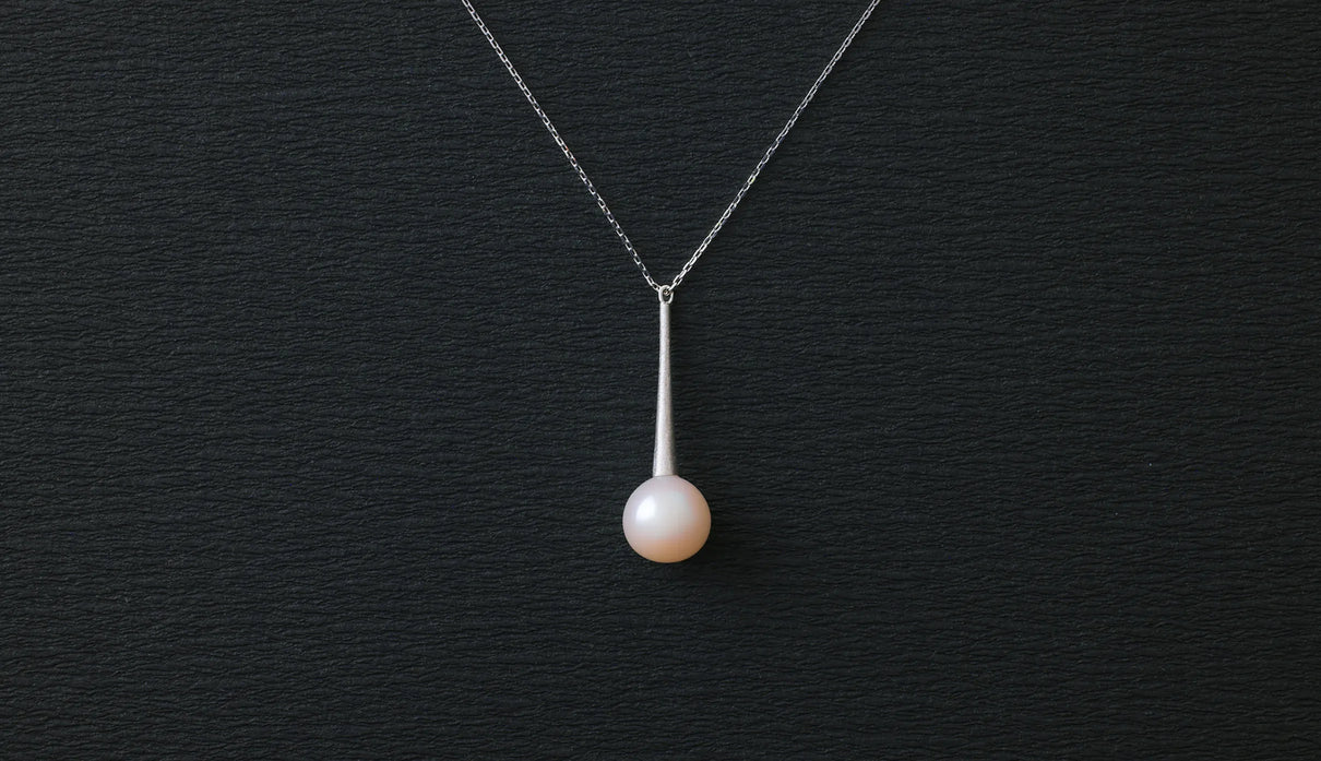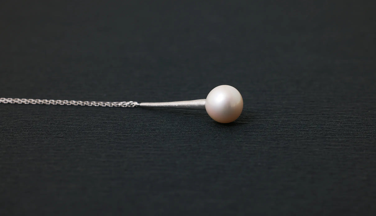 雨粒の軌跡を思わせる、縦にすっと伸びるプラチナのフォルムに、上質な艶をもつ淡水パールをあしらった一点もののネックレス。細長い円錐形のモチーフにはマットな質感を施し、しずくが落ちる一瞬を留めたような、凛とした気配を宿しています。ひと粒のパールには光が深くとどまり、白の清らかさを軸にしながらも、確かな存在感が立ち上がります。縦に伸びるシルエットが装いをすっきりと見せ、ミニマルな中にひとつの表情を添える佇まいです。シンプルな日々の装いにも、特別な日にも自然に寄り添うネックレスです。