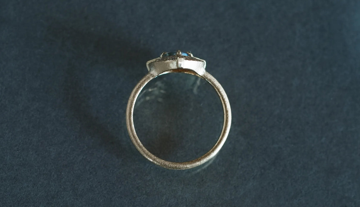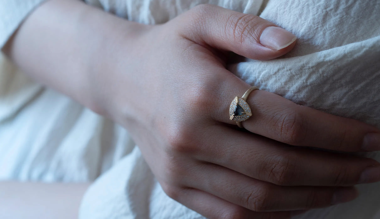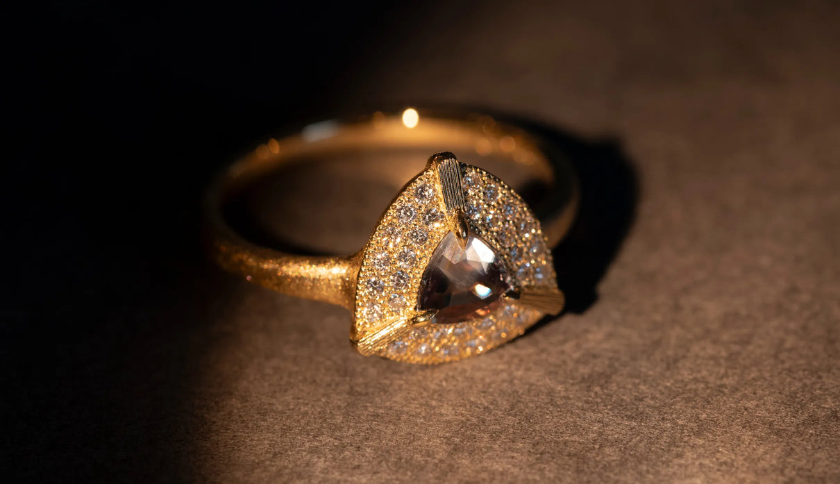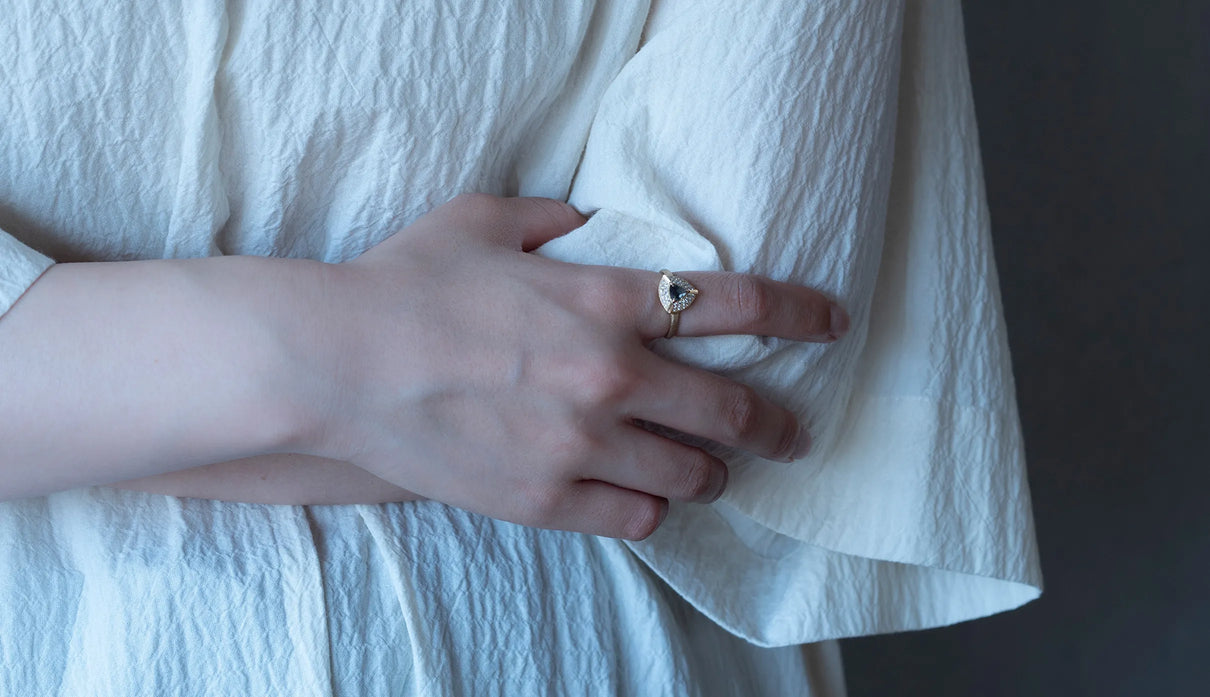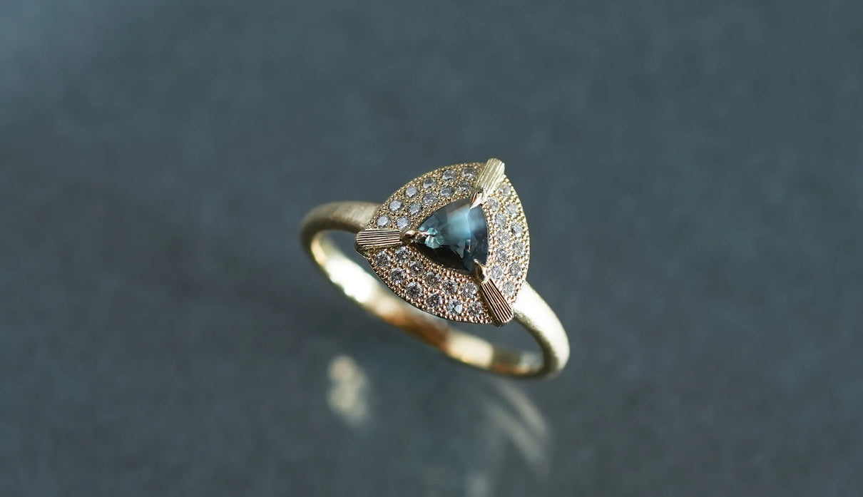 "昼は青緑、夜は赤紫" ──光源によって劇的に色を変える "シルキーアレキサンドライト" で仕立てた一点もののリング。太陽光や蛍光灯下では深い青緑色、白熱灯下では赤紫色に変化して見える希少性の高い天然石、アレキサンドライト。そのなかでも今回選んだ "シルキーアレキサンドライト" は、内部にふんわりと絹の糸を溶かし込んだような光のベールを宿す希少な宝石で、鋭さよりも、やわらかな温度を感じさせます。淡く濃淡を描く繊細な彩りを秘めた三角形のピースを引き立てるように、石のまわりをぐるりと幾多のメレダイヤモンドが取り巻き、一層の輝きを湛えるリングに仕立て上げました。また、シルキーアレキサンドライトを留める三つの爪の延長線上に伸びる、まるで閃光のような細やかな手彫りの筋模様が、リング全体のアクセントとして静かな存在感を添えています。日常的に華やぎをもたらすリングとしてはもちろん、6月の誕生石としても親しまれているアレキサンドライトは、6月生まれの方の特別なお守りとして贈りものにも最適なアイテムです。