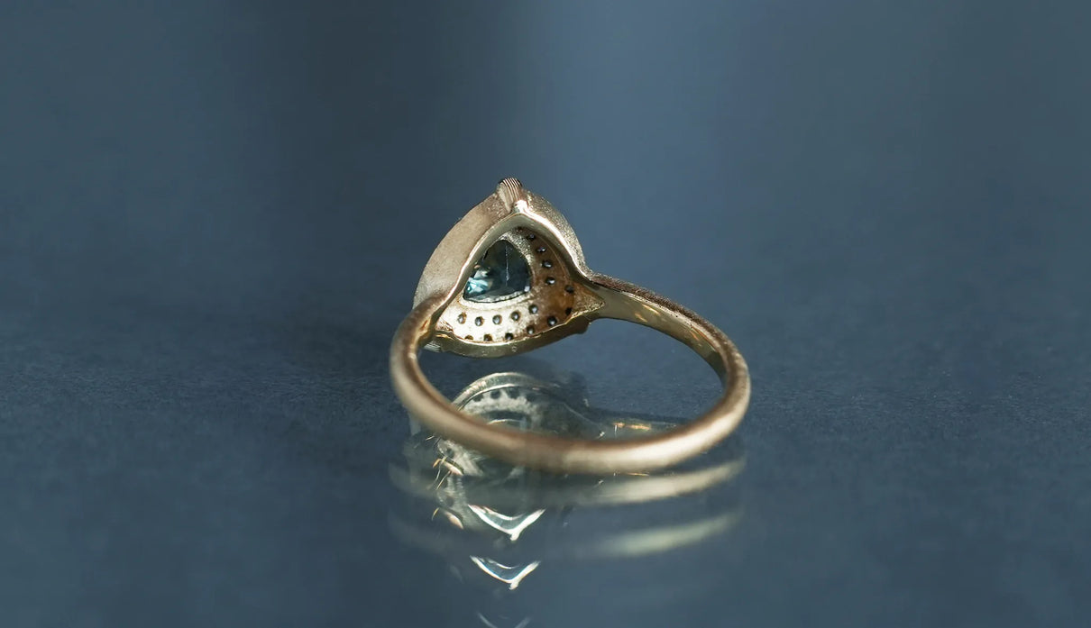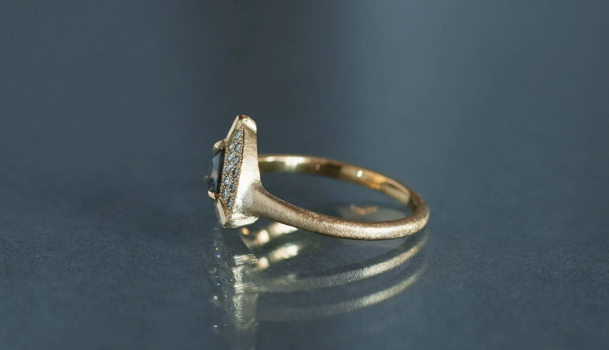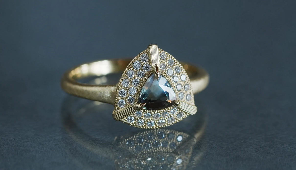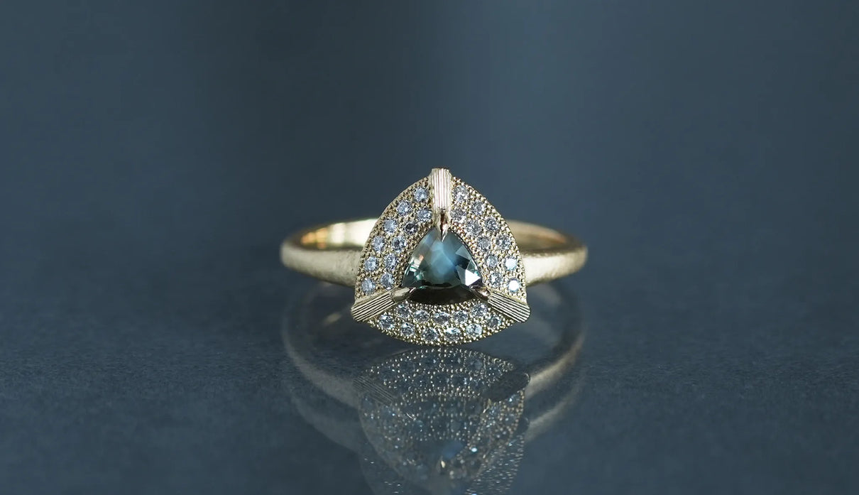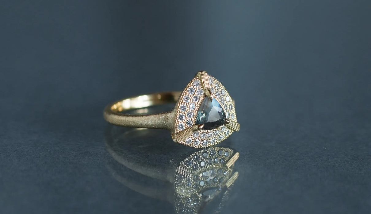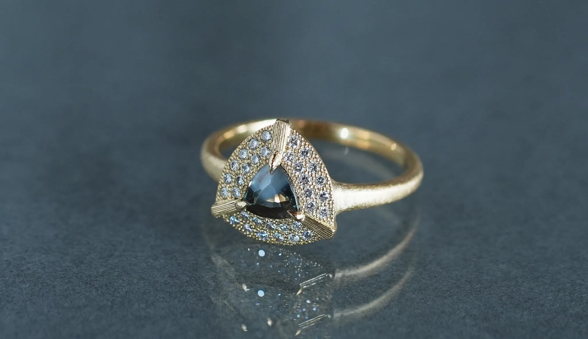 "昼は青緑、夜は赤紫" ──光源によって劇的に色を変える "シルキーアレキサンドライト" で仕立てた一点もののリング。太陽光や蛍光灯下では深い青緑色、白熱灯下では赤紫色に変化して見える希少性の高い天然石、アレキサンドライト。そのなかでも今回選んだ "シルキーアレキサンドライト" は、内部にふんわりと絹の糸を溶かし込んだような光のベールを宿す希少な宝石で、鋭さよりも、やわらかな温度を感じさせます。淡く濃淡を描く繊細な彩りを秘めた三角形のピースを引き立てるように、石のまわりをぐるりと幾多のメレダイヤモンドが取り巻き、一層の輝きを湛えるリングに仕立て上げました。また、シルキーアレキサンドライトを留める三つの爪の延長線上に伸びる、まるで閃光のような細やかな手彫りの筋模様が、リング全体のアクセントとして静かな存在感を添えています。日常的に華やぎをもたらすリングとしてはもちろん、6月の誕生石としても親しまれているアレキサンドライトは、6月生まれの方の特別なお守りとして贈りものにも最適なアイテムです。