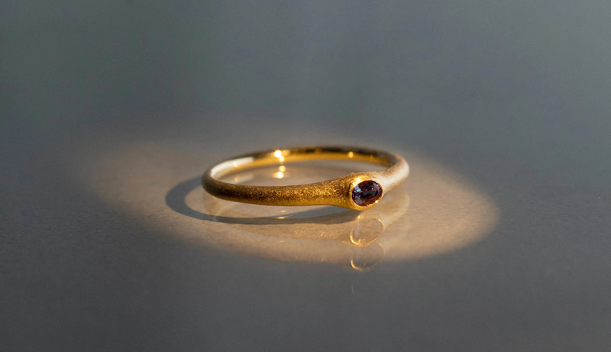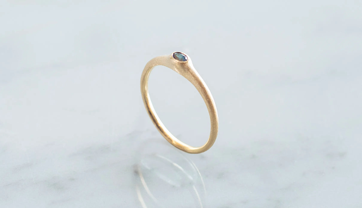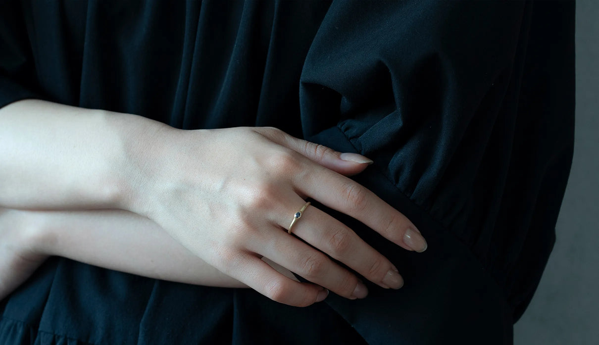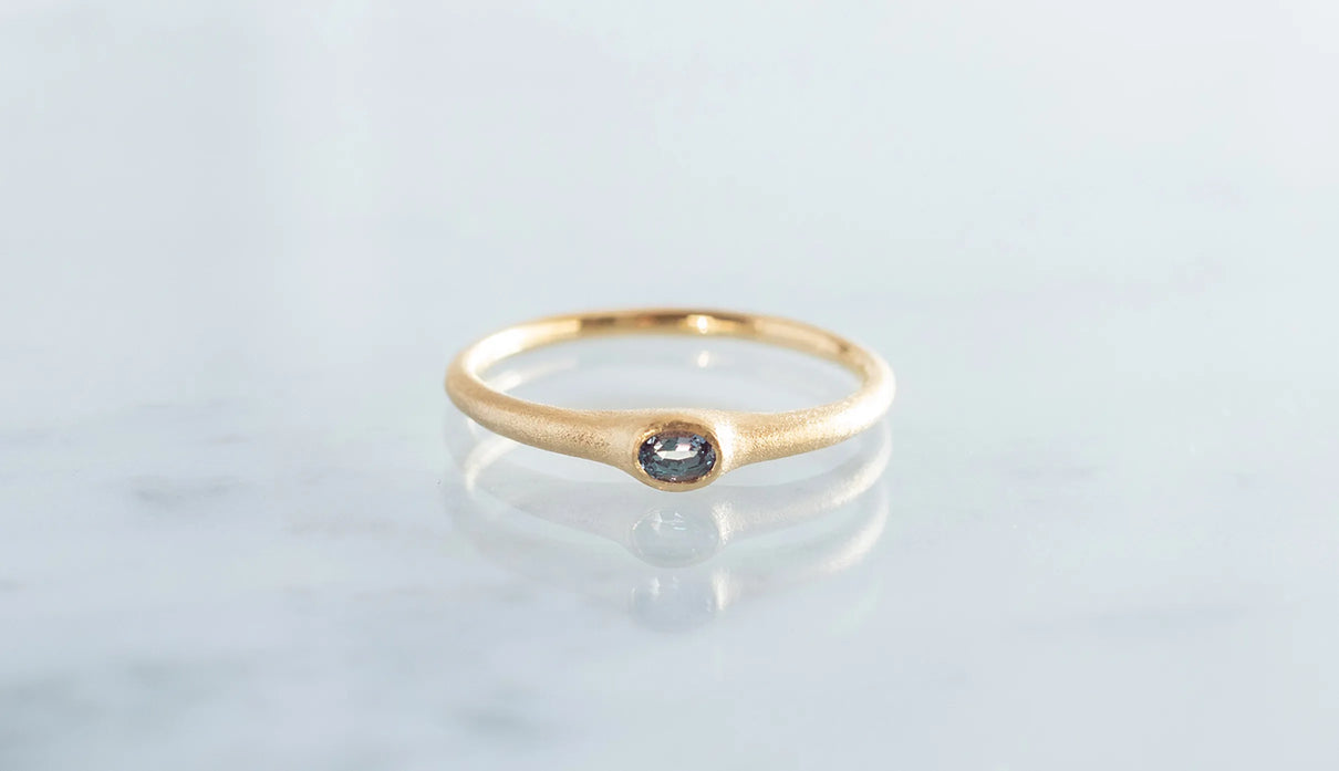 「ゆりかご」を意味する " Cradle " の名を持つリング。「昼のエメラルド・夜のルビー」と呼ばれ、太陽光や蛍光灯下では深い青緑色、白熱灯下では赤紫色に変化して見える希少性の高い天然石、アレキサンドライトをゆりかごのように優しく包み込むデザインが、穏やかな曲線を描きながら指元を飾ります。今回選んだのは、美しい照りと深く鮮やかなブルーグリーンの色彩を秘めた上質なピース。日常の光の中での発色はもちろんのこと、白熱灯の下ではしっかりとカラーチェンジを呈しています (写真8枚目) 。6月の誕生石としても親しまれているアレキサンドライト。6月生まれの方の特別なお守りとして贈りものにも最適なアイテムです。