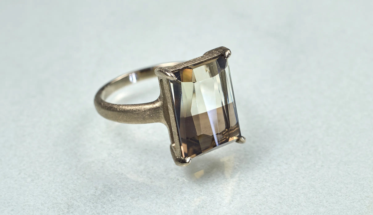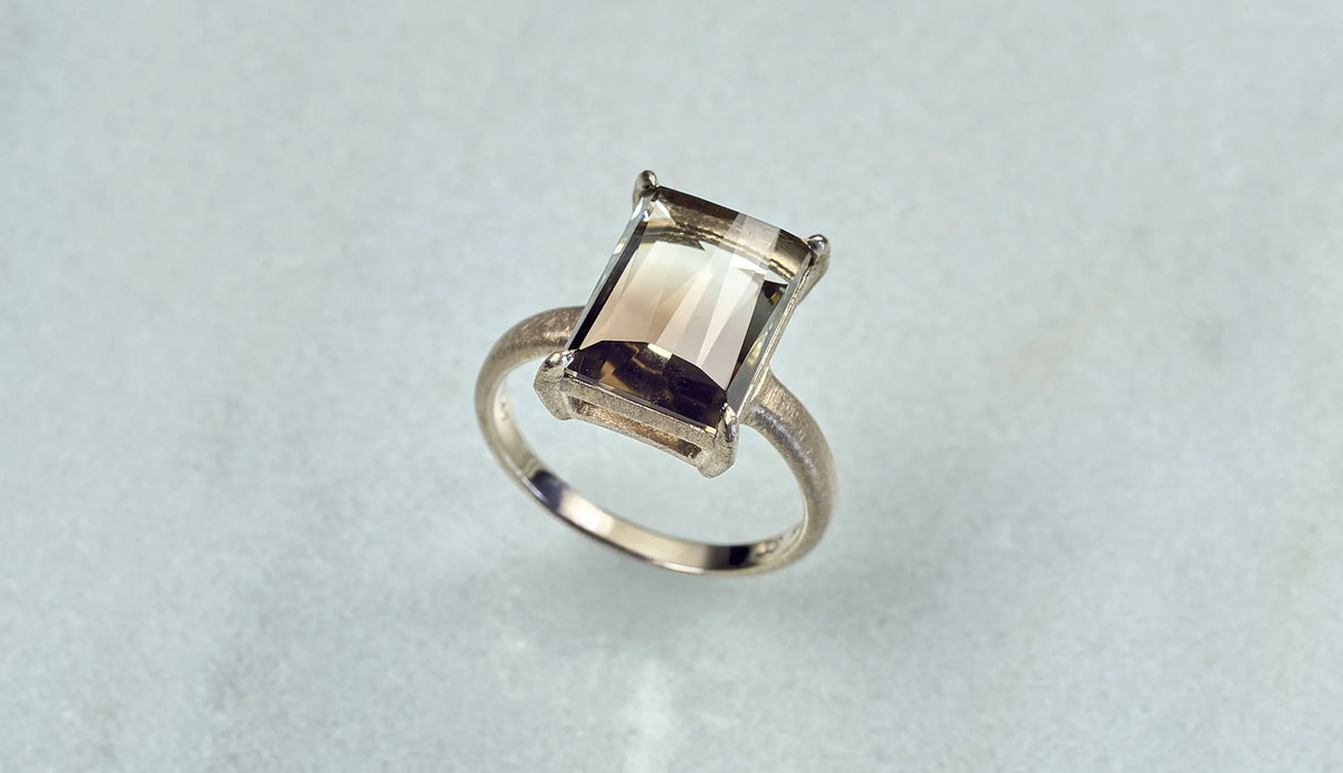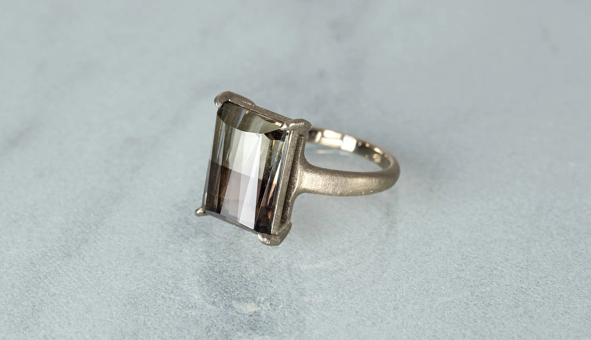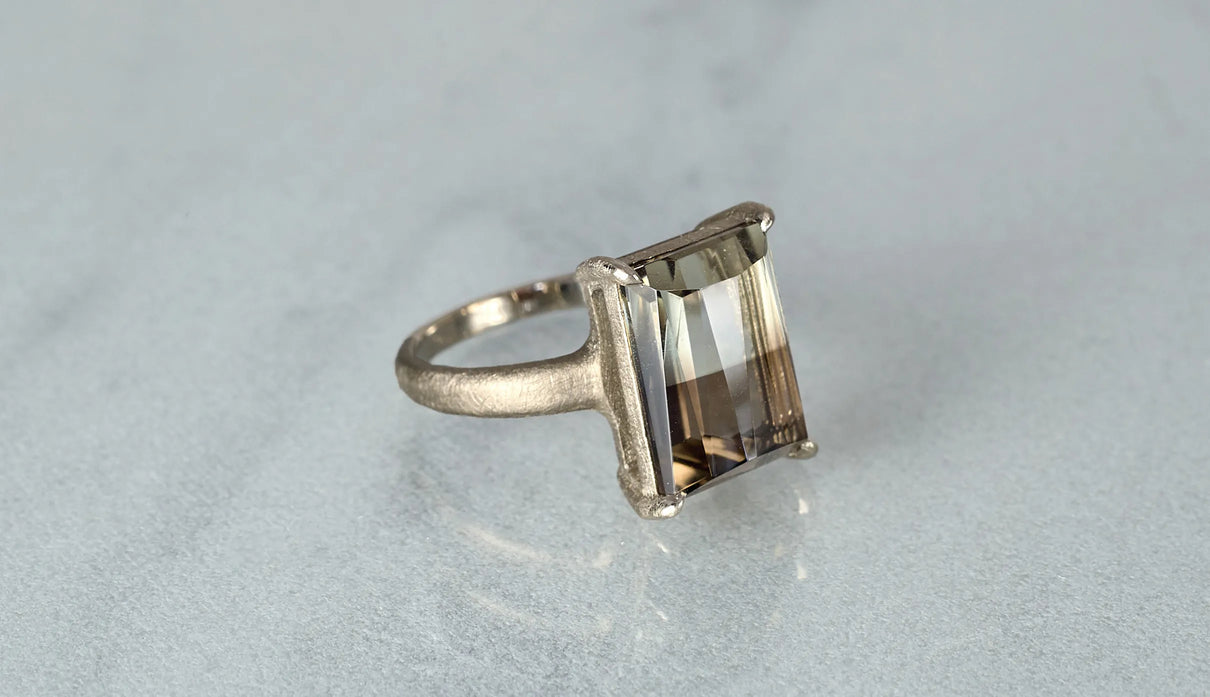 宝石研磨士・大城かん奈氏の手磨り技法による、自由で伸びやかなカッティングが施されたバイカラースモーキークォーツの一点もののリング。淡いシトリンとスモーキーカラーのバイカラーが美しく呼応する原石を、大城氏による類稀なる手磨り技術により生み出された大胆で自由なカットを施していただきました。マットに仕立てたK18ホワイトゴールドの石座から取り込む様々な方向から光を受け、クォーツの瑞々しい透明感をより一層引き立てるスクエアカット。見るほどに視線を引き込む素晴らしい仕上がりの贅沢な逸品となりました。日々の装いに静かな華やぎをもたらすリングです。