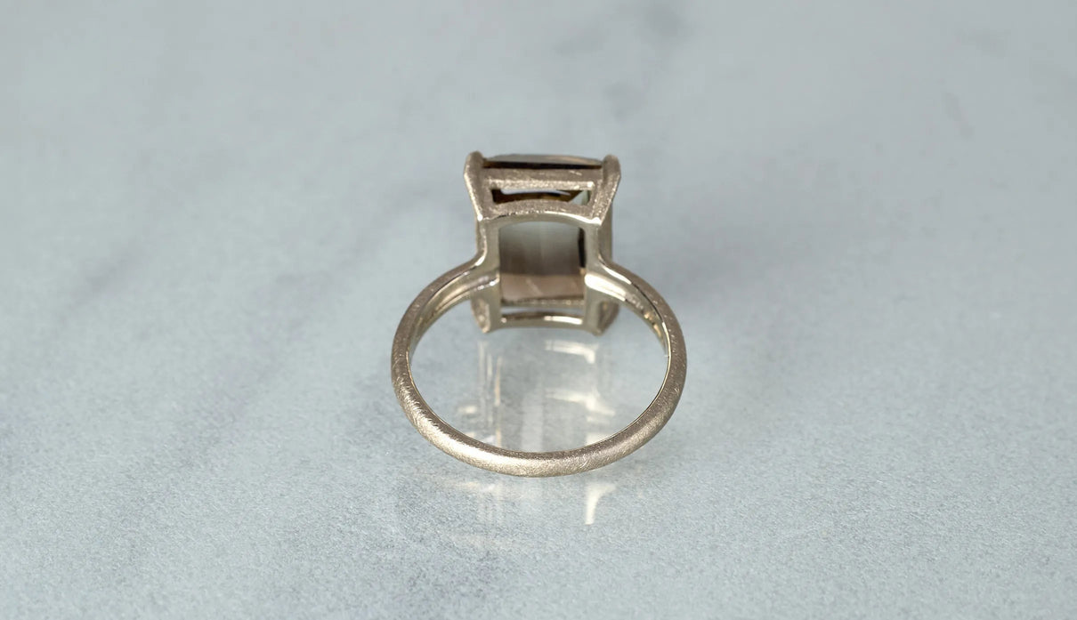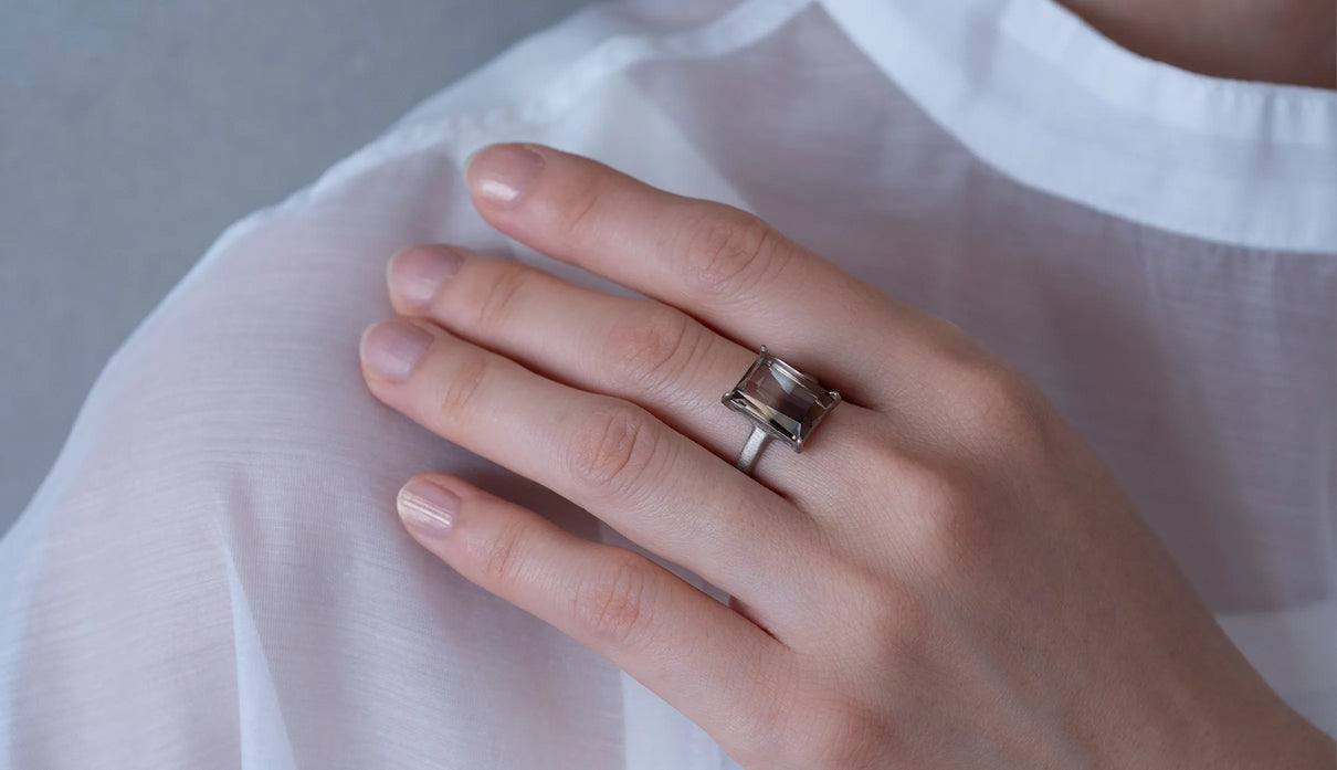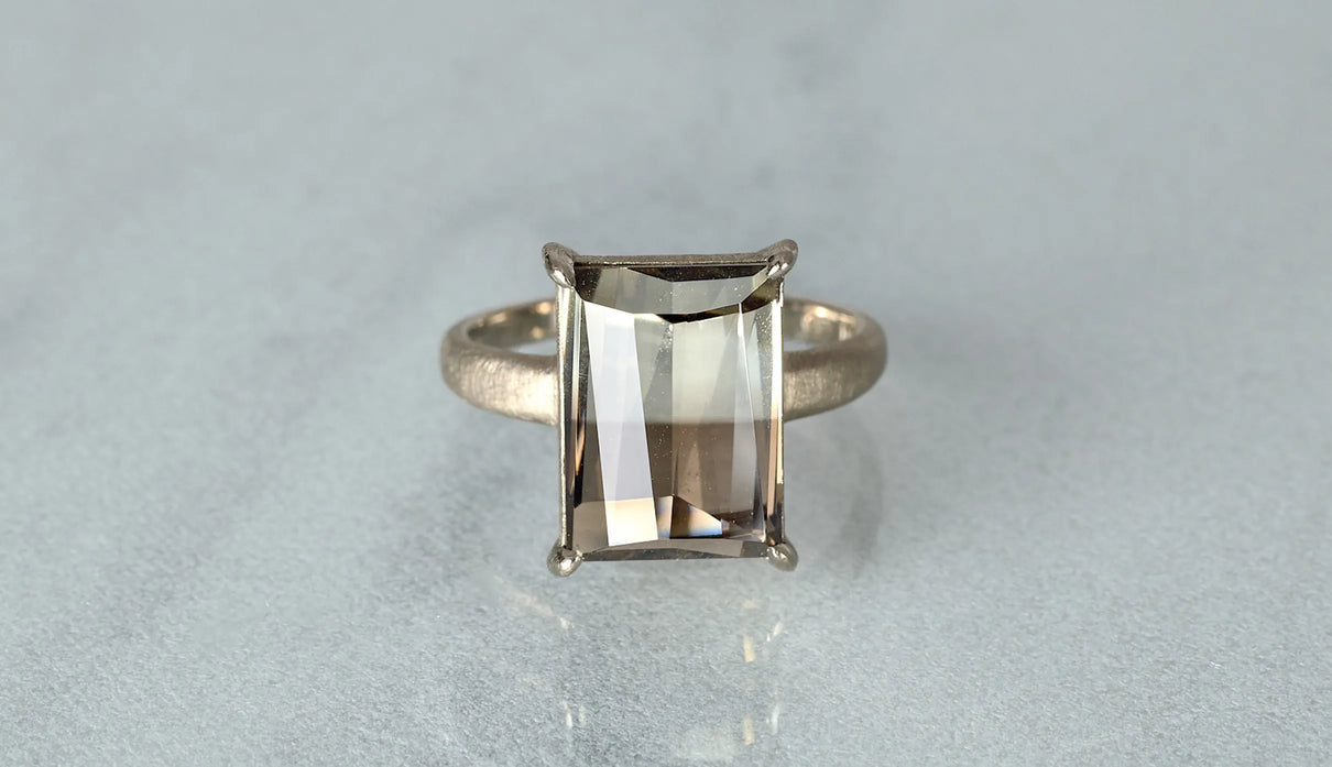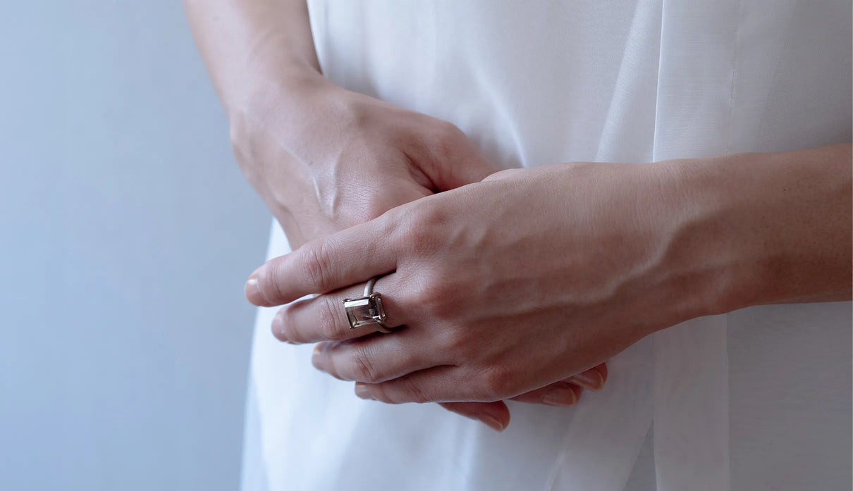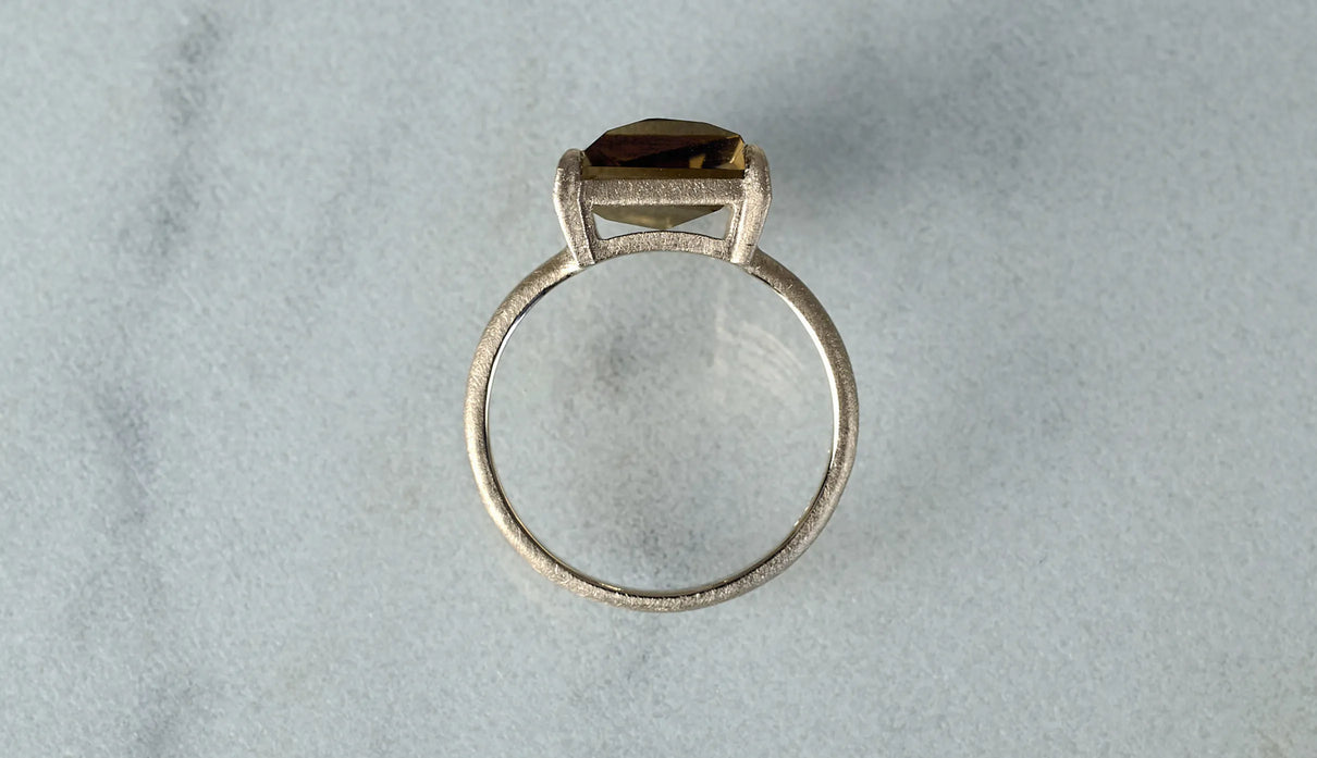 宝石研磨士・大城かん奈氏の手磨り技法による、自由で伸びやかなカッティングが施されたバイカラースモーキークォーツの一点もののリング。淡いシトリンとスモーキーカラーのバイカラーが美しく呼応する原石を、大城氏による類稀なる手磨り技術により生み出された大胆で自由なカットを施していただきました。マットに仕立てたK18ホワイトゴールドの石座から取り込む様々な方向から光を受け、クォーツの瑞々しい透明感をより一層引き立てるスクエアカット。見るほどに視線を引き込む素晴らしい仕上がりの贅沢な逸品となりました。日々の装いに静かな華やぎをもたらすリングです。