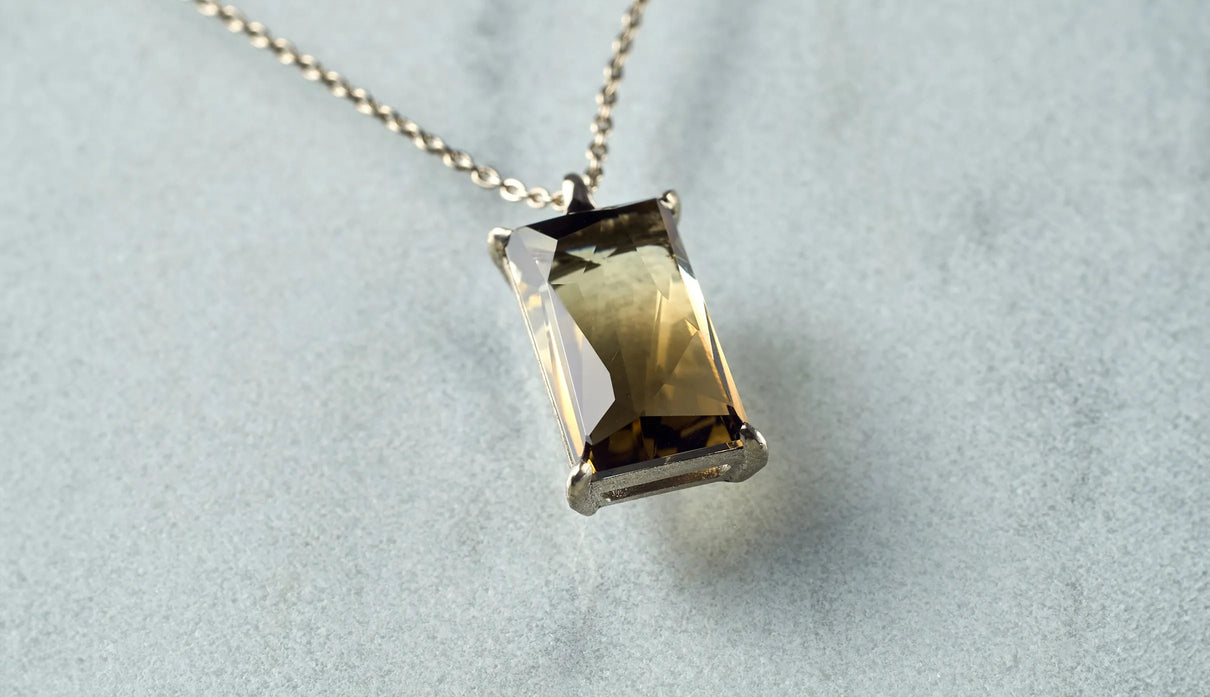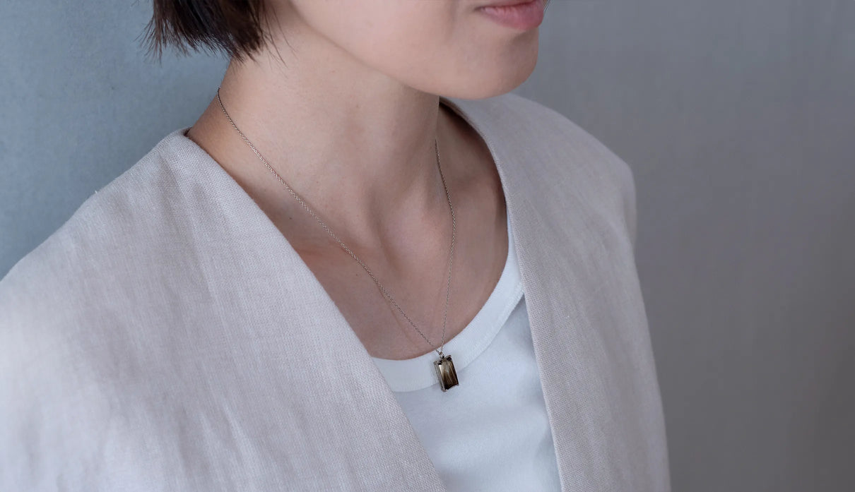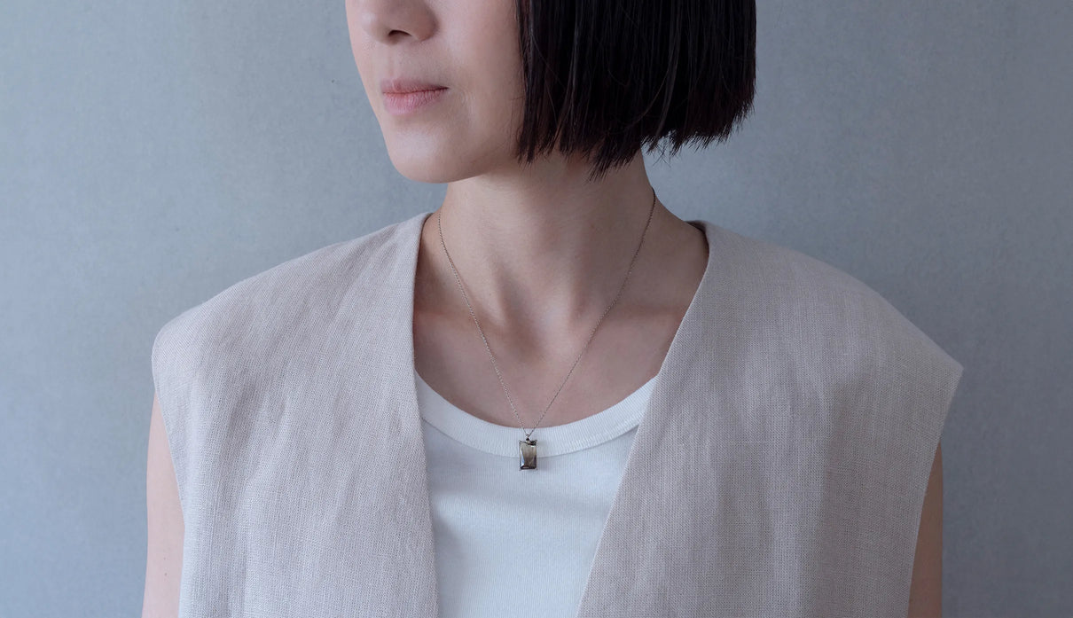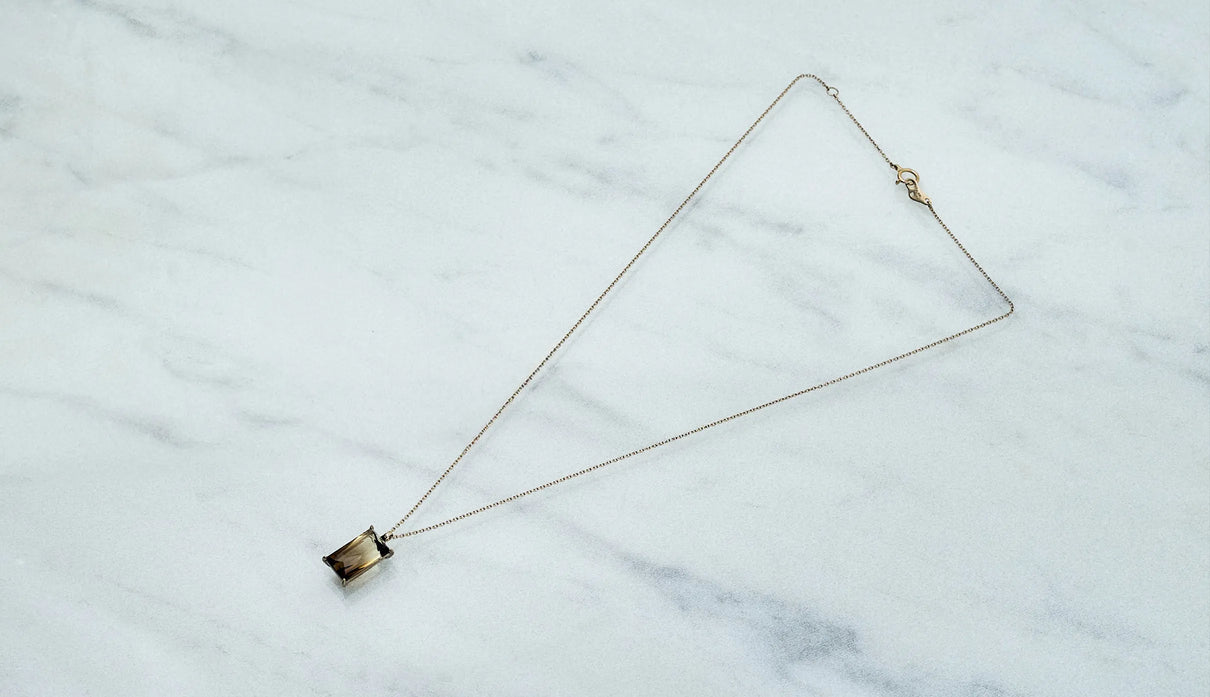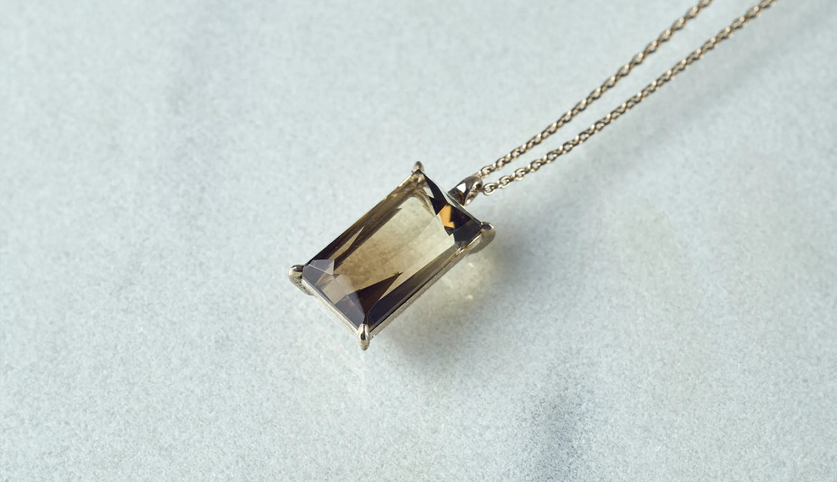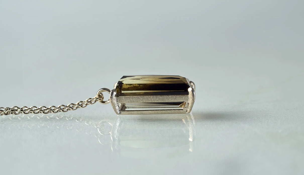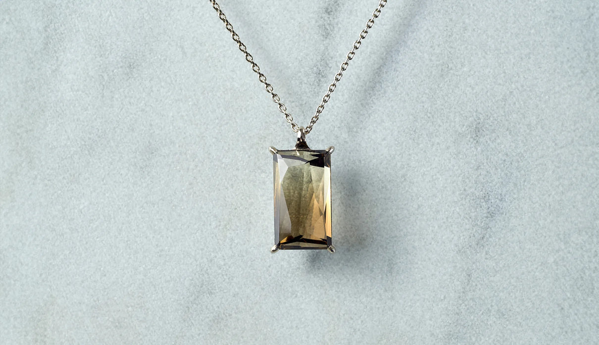 宝石研磨士・大城かん奈氏の手磨り技法による、自由で伸びやかなカッティングが施されたバイカラースモーキークォーツの一点もののネックレス。淡いシトリンとスモーキーカラーのバイカラーが美しく呼応する原石を、大城氏による類稀なる手磨り技術により生み出された大胆で自由なカットを施していただきました。マットに仕立てたK18ホワイトゴールドの石座から取り込む様々な方向から光を受け、クォーツの瑞々しい透明感をより一層引き立てるスクエアカット。見るほどに視線を引き込む素晴らしい仕上がりの贅沢な逸品となりました。日々の装いに静かな華やぎをもたらすネックレスです。