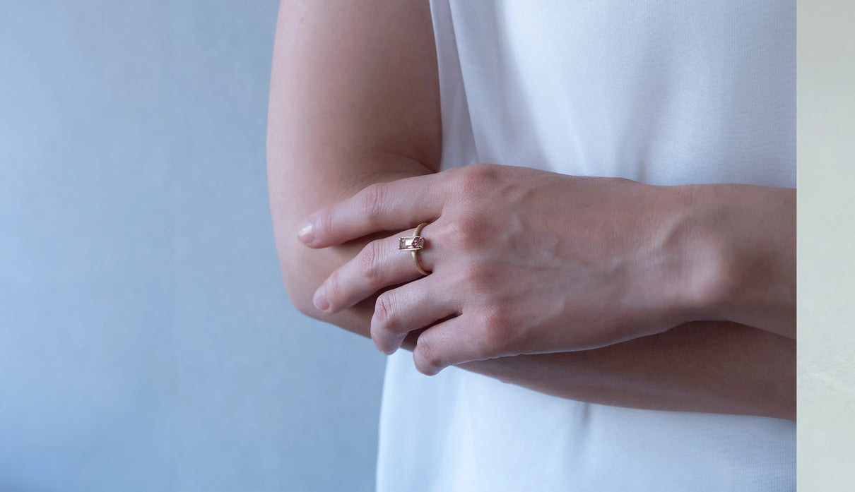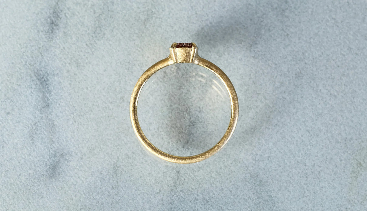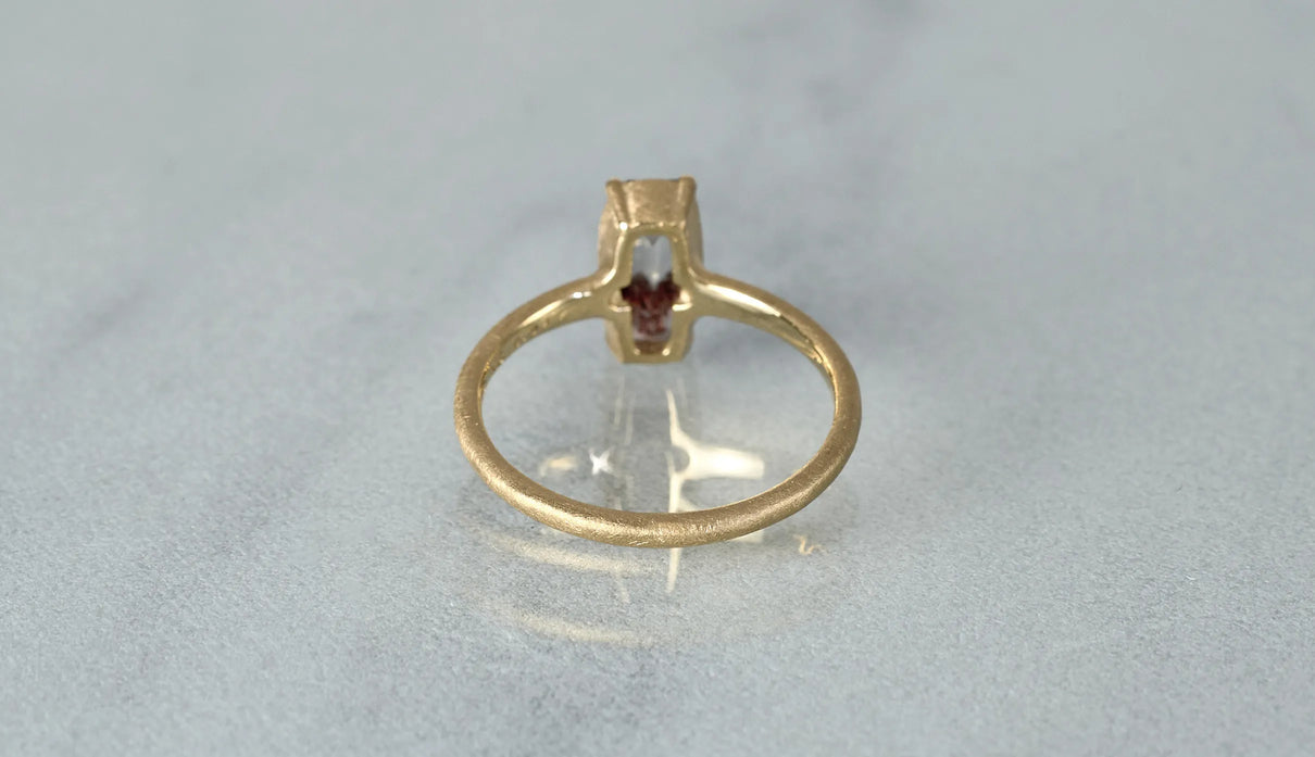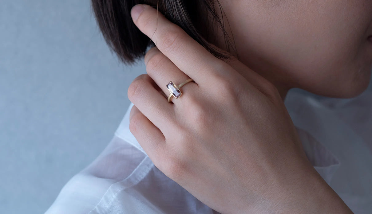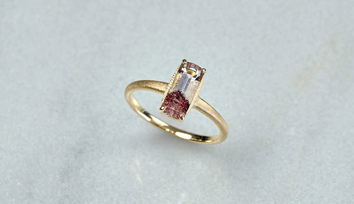 鮮烈な色彩を放つレッドファントムクォーツで仕立てた一点もののリング。結晶の中に山影を宿す、不思議な水晶"ファントムクォーツ"。なかでも、赤鉄鉱を含むことで幻影のような山並みに赤みが差したものは、"レッドファントムクォーツ"と呼ばれ、朝焼けに染まる「赤富士」を想わせるその姿から、縁起のよい宝石としても知られています。赤と無色透明のコントラストが澄みわたり、水晶の奥深くまで光を跳ね返すような結晶に秘めた、視線を吸い込むような輝きが魅力。清らかに澄み渡る水晶部分の透明度の高さと、濃淡を重ねた赤い結晶が描くきりっとそびえ立つ、峰のような内包物の姿は、類を見ないほどの美しさです。端正なスクエアカットに寄り添う石座は、わずかに膨らみを持たせた輪郭を描きます。正面から見える部分とリングアームとでK18イエローゴールドの表情を変え、密かなコントラストをつけました。指元に鮮やかな輝きをもたらすリングです。