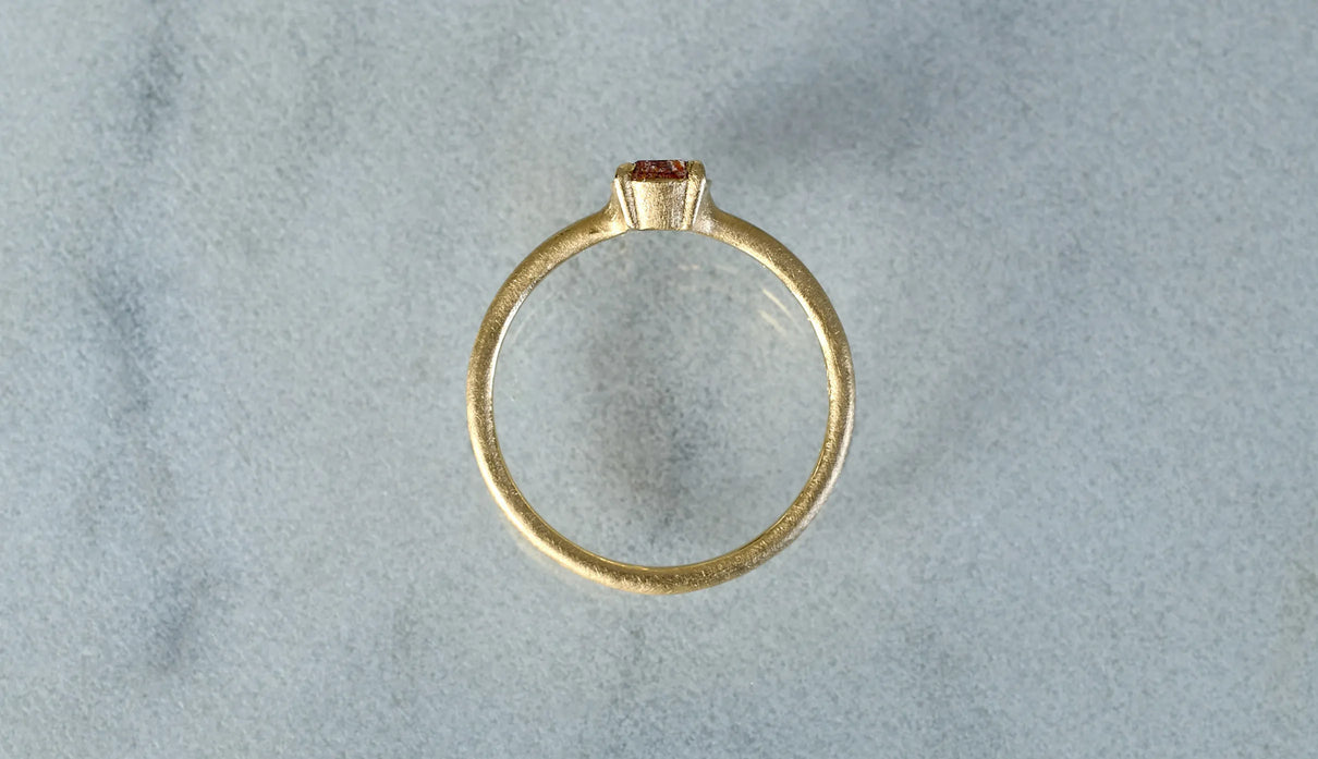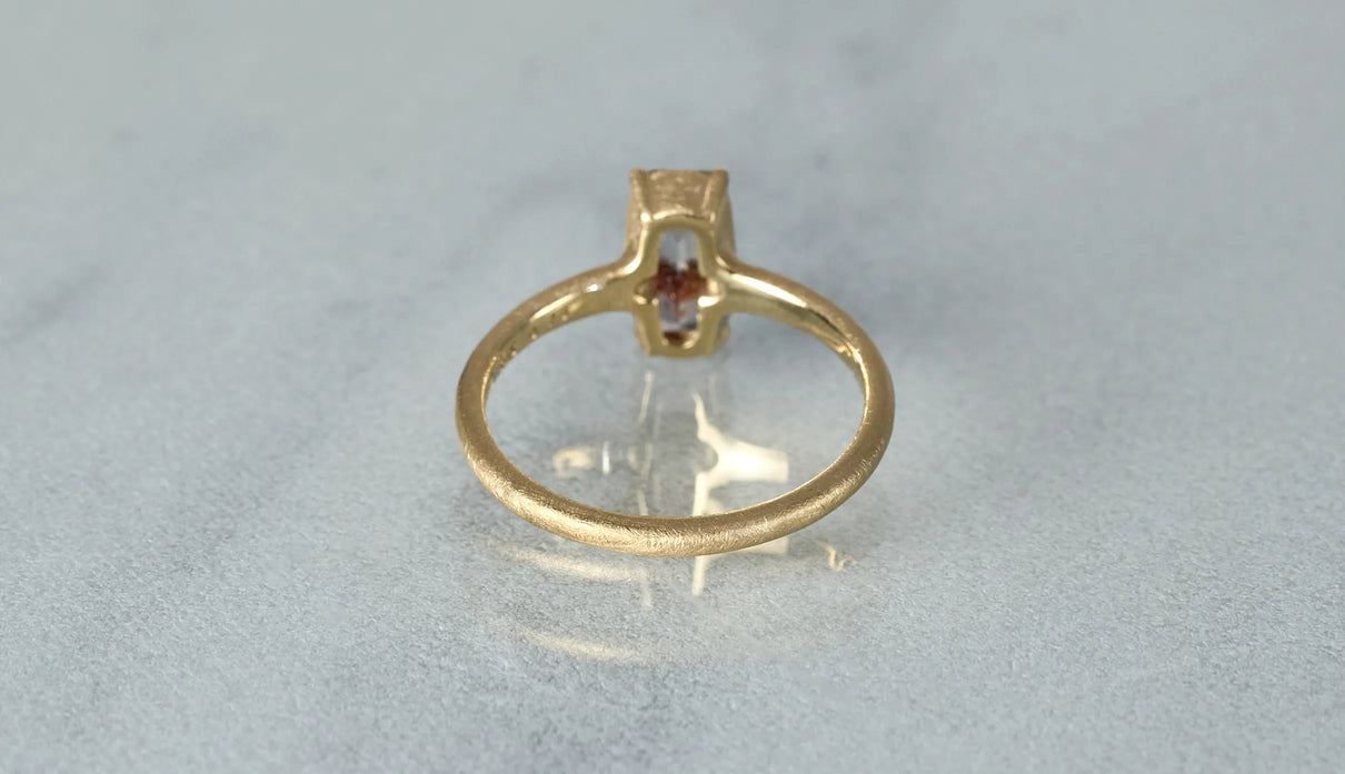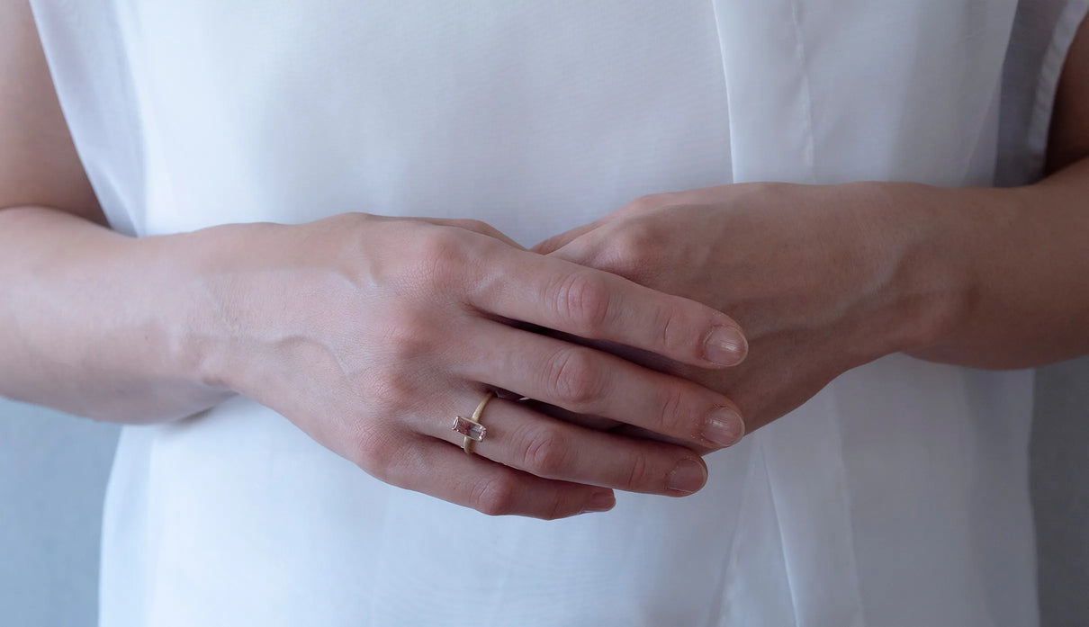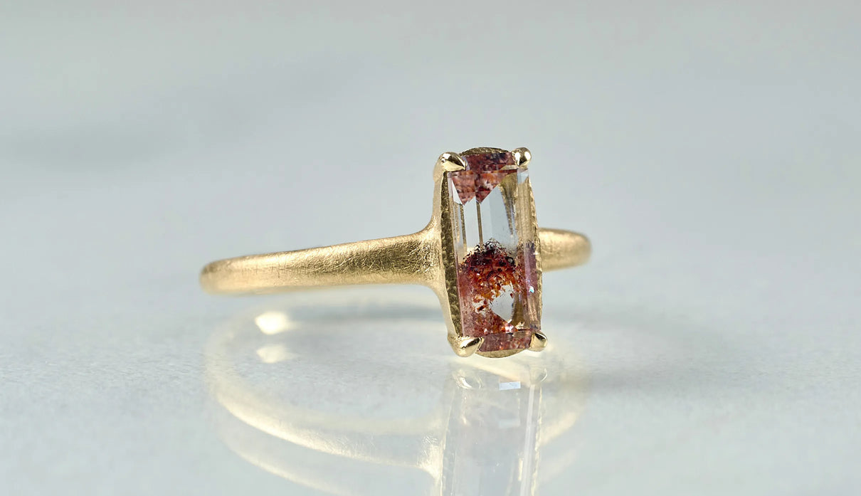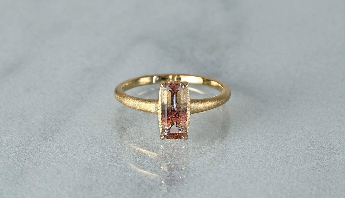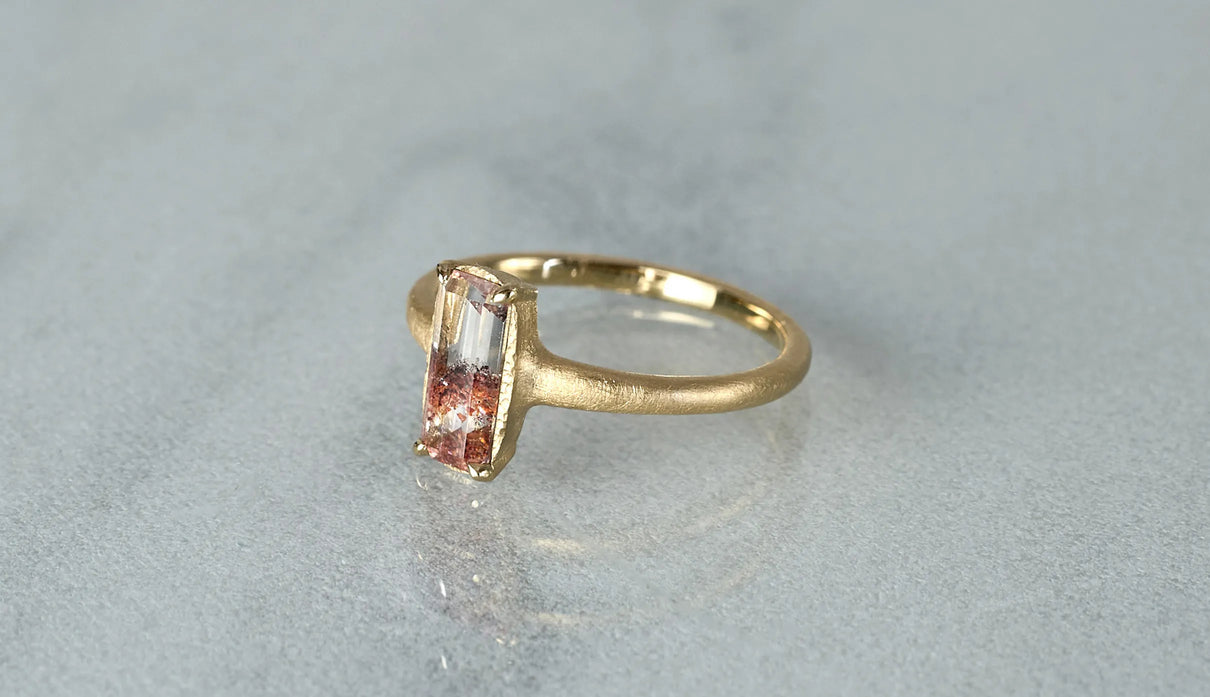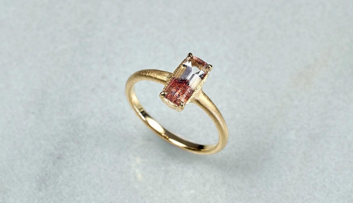 鮮烈な色彩を放つレッドファントムクォーツで仕立てた一点もののリング。結晶の中に山影を宿す、不思議な水晶"ファントムクォーツ"。なかでも、赤鉄鉱を含むことで幻影のような山並みに赤みが差したものは、"レッドファントムクォーツ"と呼ばれ、朝焼けに染まる「赤富士」を想わせるその姿から、縁起のよい宝石としても知られています。赤と無色透明のコントラストが澄みわたり、水晶の奥深くまで光を跳ね返すような結晶に秘めた、視線を吸い込むような輝きが魅力。清らかに澄み渡る水晶部分の透明度の高さと、濃淡を重ねた赤い結晶が描くきりっとそびえ立つ、峰のような内包物の姿は、類を見ないほどの美しさです。端正なスクエアカットに寄り添う石座は、わずかに膨らみを持たせた輪郭を描きます。正面から見える部分とリングアームとでK18イエローゴールドの表情を変え、密かなコントラストをつけました。指元に鮮やかな輝きをもたらすリングです。
