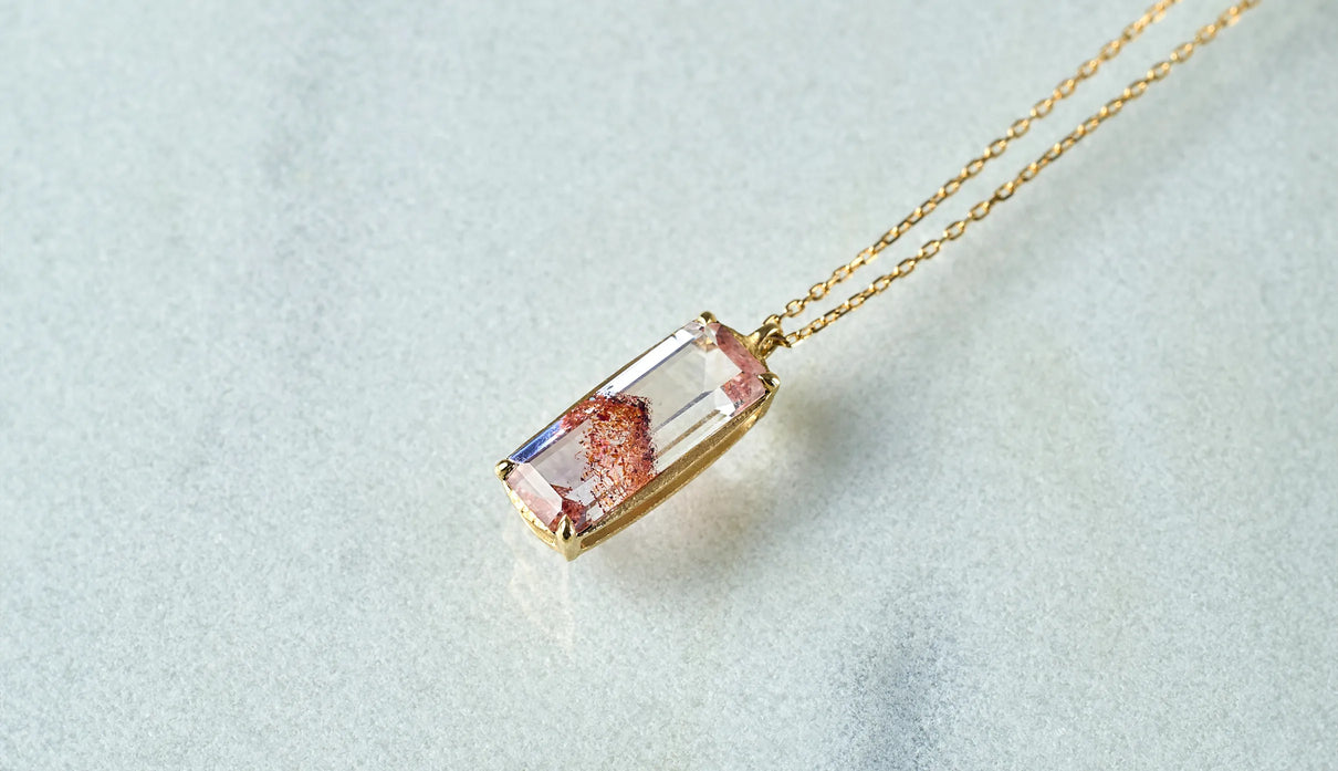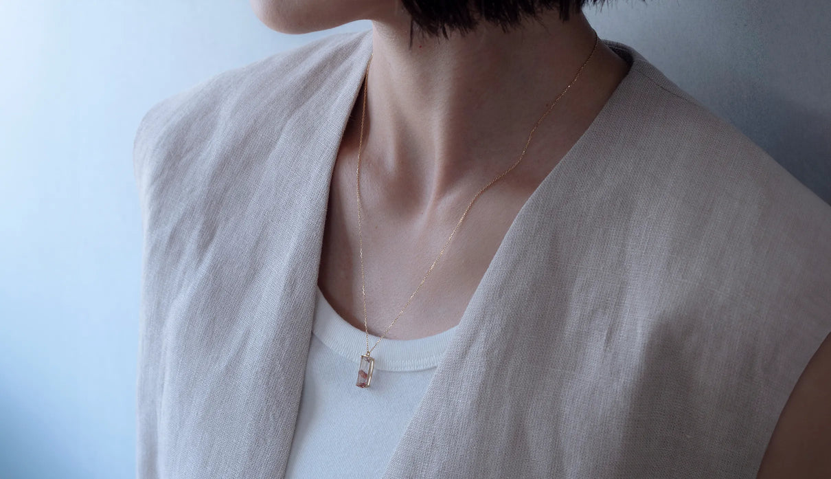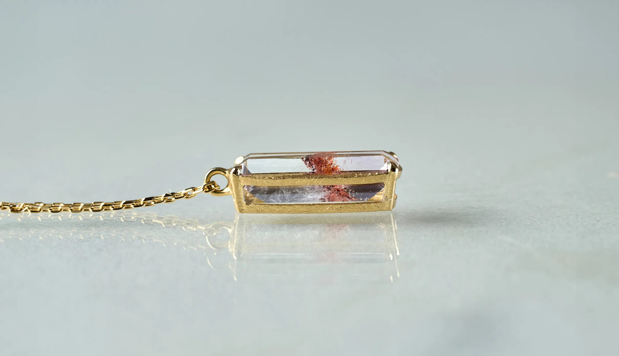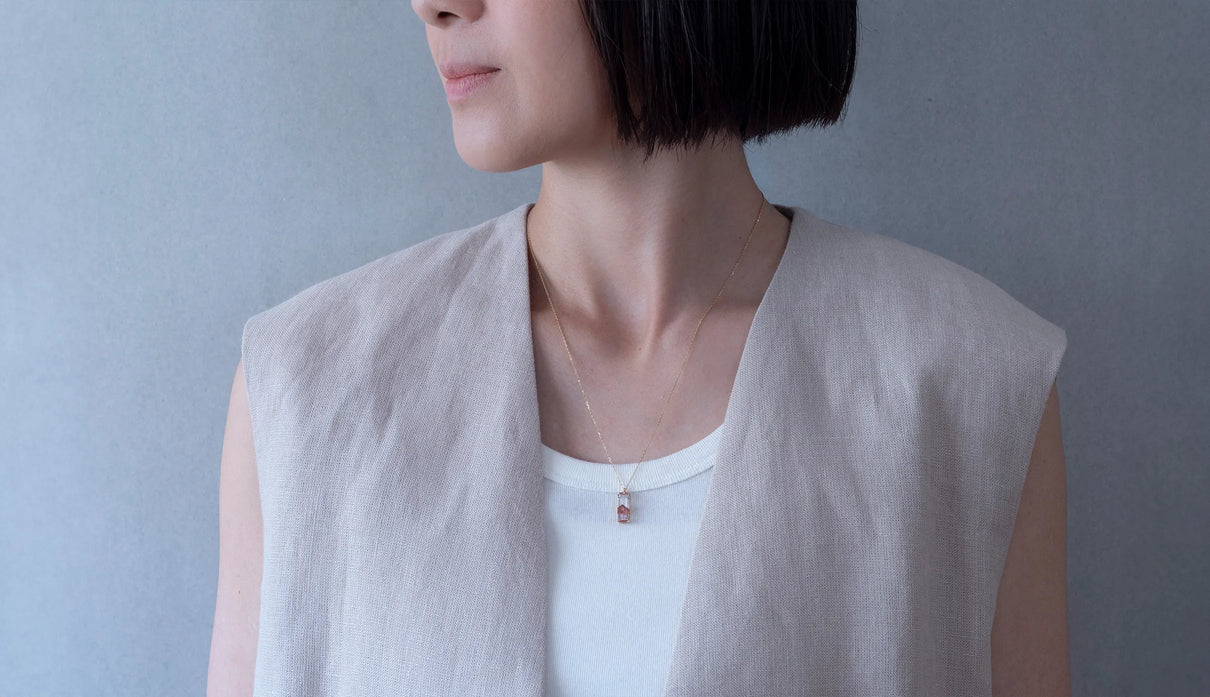 鮮烈な色彩を放つレッドファントムクォーツで仕立てた一点もののネックレス。結晶の中に山影を宿す、不思議な水晶"ファントムクォーツ"。なかでも、赤鉄鉱を含むことで幻影のような山並みに赤みが差したものは、"レッドファントムクォーツ"と呼ばれ、朝焼けに染まる「赤富士」を想わせるその姿から、縁起のよい宝石としても知られています。赤と無色透明のコントラストが澄みわたり、水晶の奥深くまで光を跳ね返すような結晶に秘めた、視線を吸い込むような輝きが魅力。清らかに澄み渡る水晶部分の透明度の高さと、濃淡を重ねた赤い結晶が描くきりっとそびえ立つ、峰のような内包物の姿は、類を見ないほどの美しさです。端正なスクエアカットに寄り添う石座は、わずかに膨らみを持たせた輪郭を描きます。正面から見える部分とサイドとでK18イエローゴールドの表情を変え、密かなコントラストをつけました。胸元に鮮やかな輝きをもたらす、約50cmのミドルレングスのネックレスです。