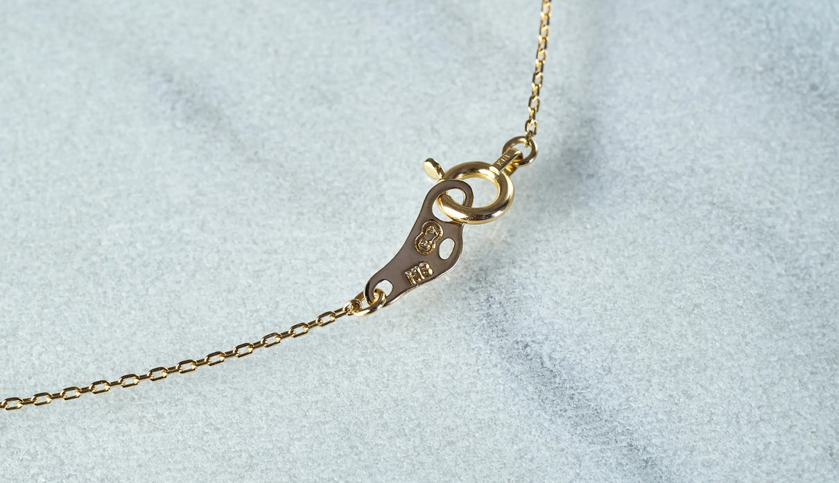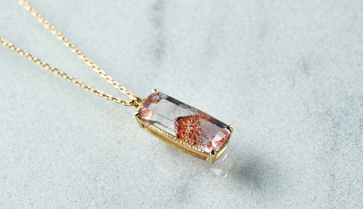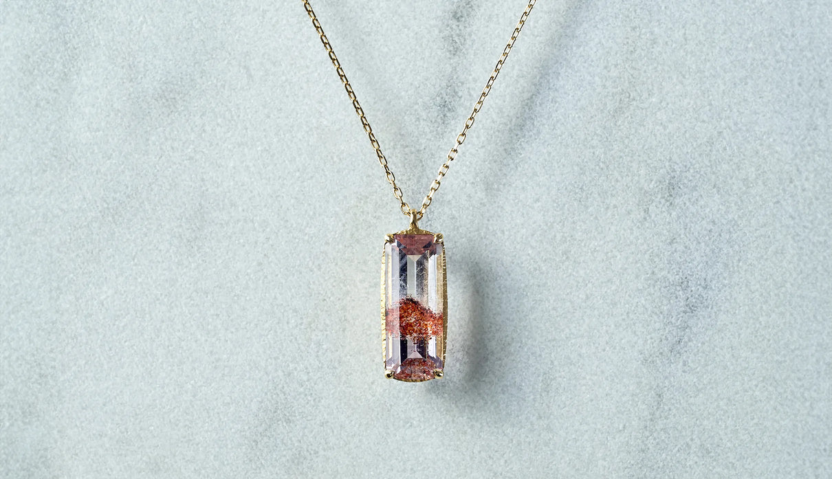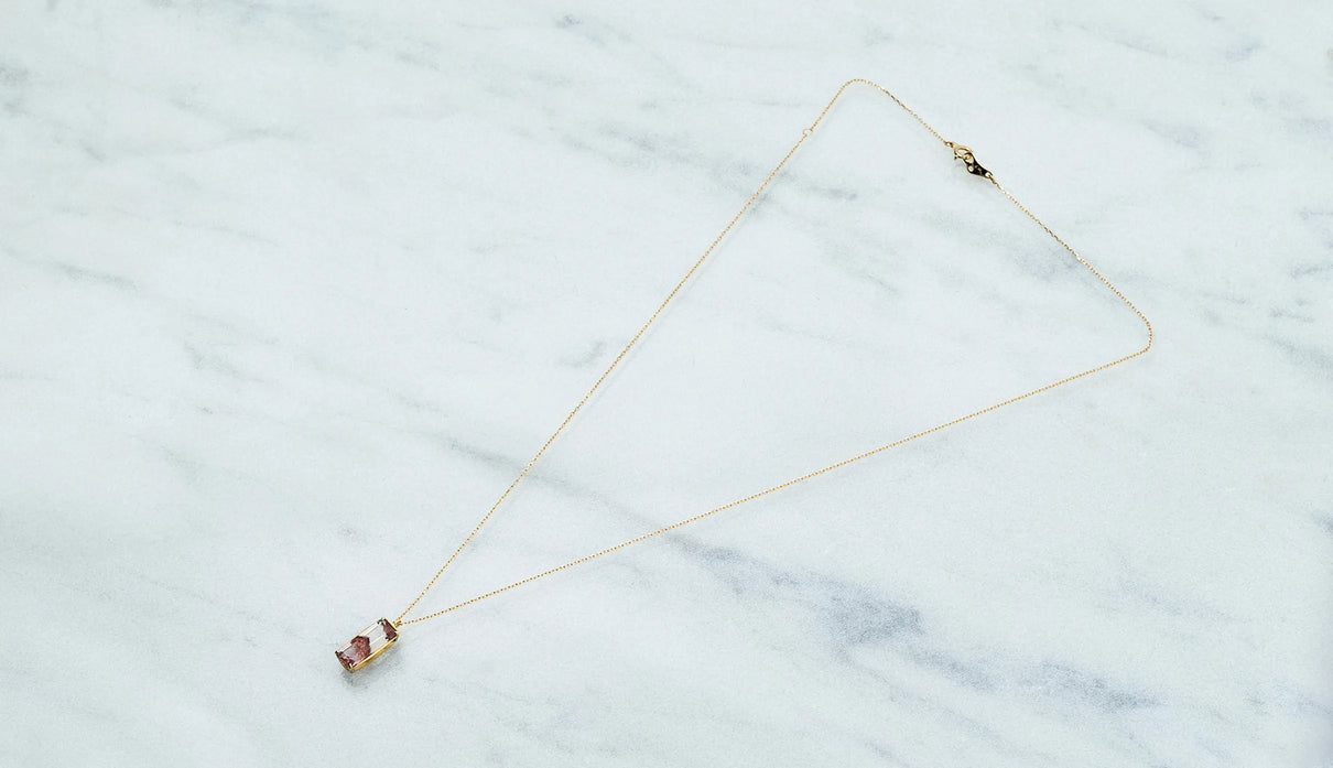 鮮烈な色彩を放つレッドファントムクォーツで仕立てた一点もののネックレス。結晶の中に山影を宿す、不思議な水晶"ファントムクォーツ"。なかでも、赤鉄鉱を含むことで幻影のような山並みに赤みが差したものは、"レッドファントムクォーツ"と呼ばれ、朝焼けに染まる「赤富士」を想わせるその姿から、縁起のよい宝石としても知られています。赤と無色透明のコントラストが澄みわたり、水晶の奥深くまで光を跳ね返すような結晶に秘めた、視線を吸い込むような輝きが魅力。清らかに澄み渡る水晶部分の透明度の高さと、濃淡を重ねた赤い結晶が描くきりっとそびえ立つ、峰のような内包物の姿は、類を見ないほどの美しさです。端正なスクエアカットに寄り添う石座は、わずかに膨らみを持たせた輪郭を描きます。正面から見える部分とサイドとでK18イエローゴールドの表情を変え、密かなコントラストをつけました。胸元に鮮やかな輝きをもたらす、約50cmのミドルレングスのネックレスです。