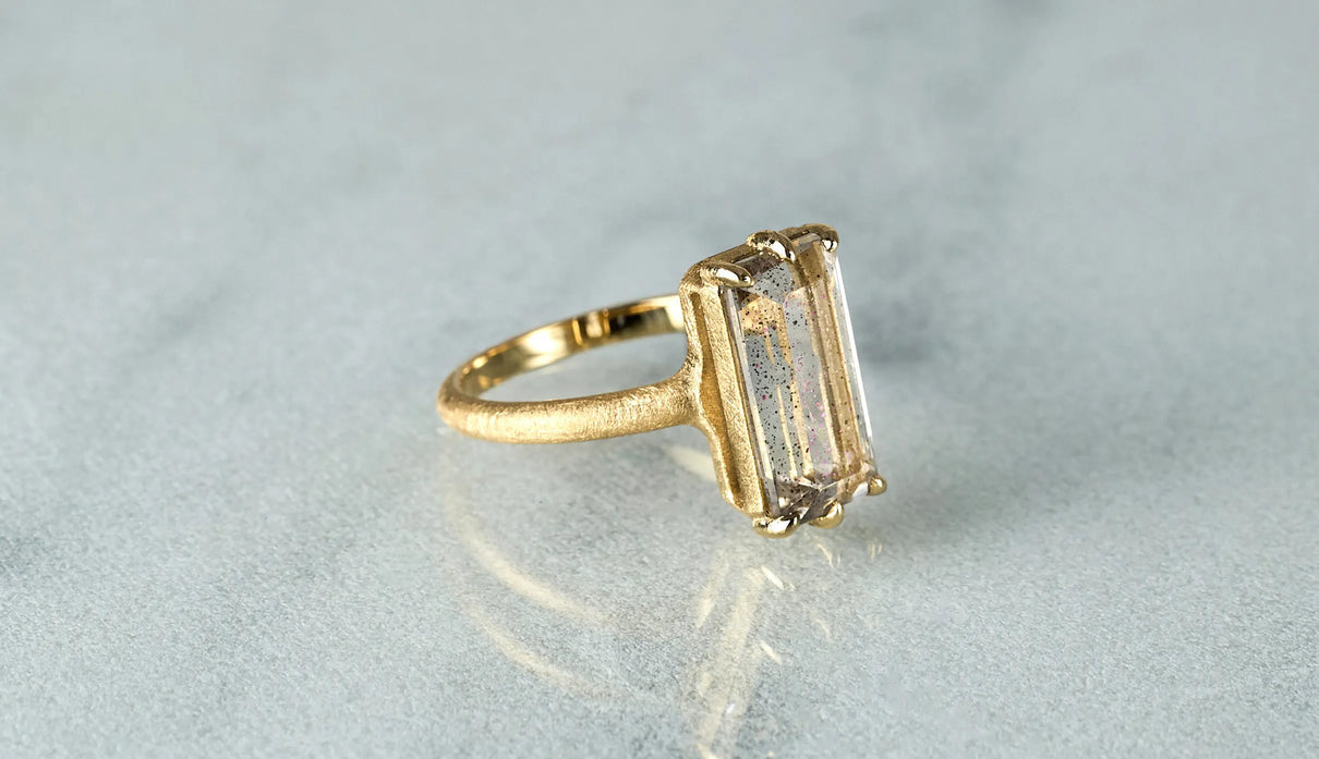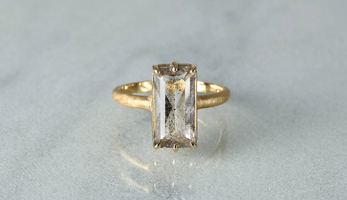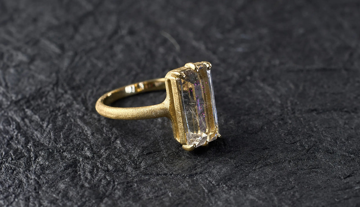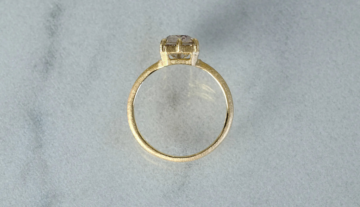 ピンク色に瞬く粒子を内包したピンクファイヤークォーツを留めた一点もののリング。透明度が高く僅かに色づくクォーツの中に、密度高く内包された微細なインクルージョンが、光を受けるたびに鮮やかなピンク色の瞬きを全面に見せます。それはまるで澄んだ夜空に燦然と広がる銀河のよう。石の個性的な表情と瑞々しい透明感を楽しめるようフレームから伸びる6本の爪でシンプルに留め、マットに仕立てたストレートラインのアームが寄り添うリング。日常の装いにシックで上品な華を添えます。