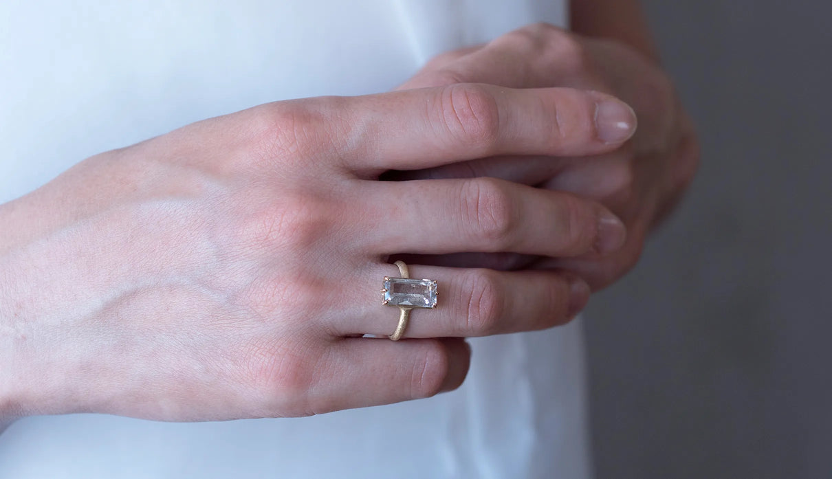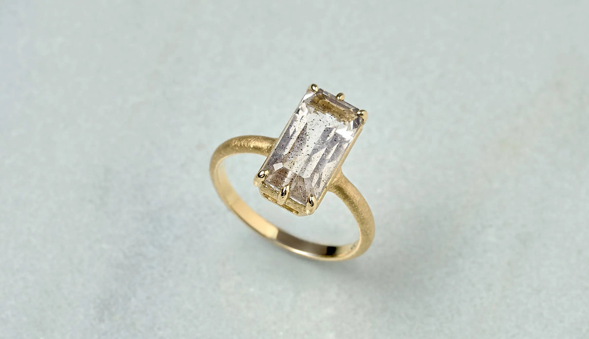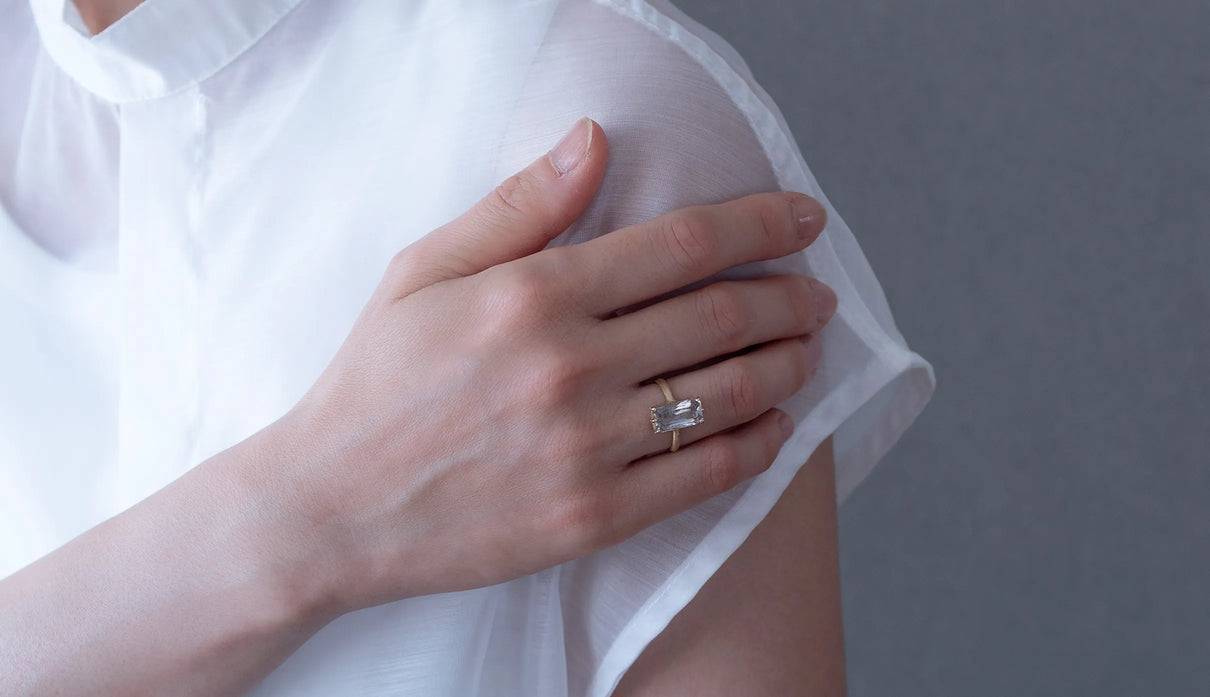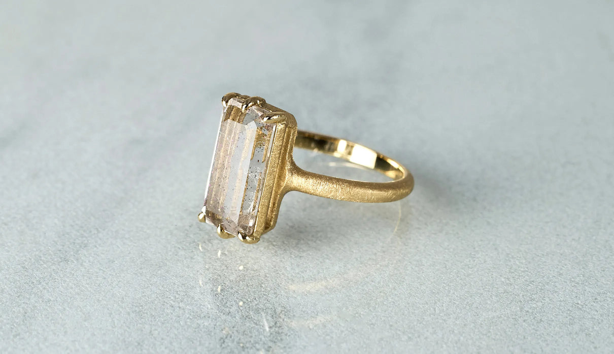 ピンク色に瞬く粒子を内包したピンクファイヤークォーツを留めた一点もののリング。透明度が高く僅かに色づくクォーツの中に、密度高く内包された微細なインクルージョンが、光を受けるたびに鮮やかなピンク色の瞬きを全面に見せます。それはまるで澄んだ夜空に燦然と広がる銀河のよう。石の個性的な表情と瑞々しい透明感を楽しめるようフレームから伸びる6本の爪でシンプルに留め、マットに仕立てたストレートラインのアームが寄り添うリング。日常の装いにシックで上品な華を添えます。