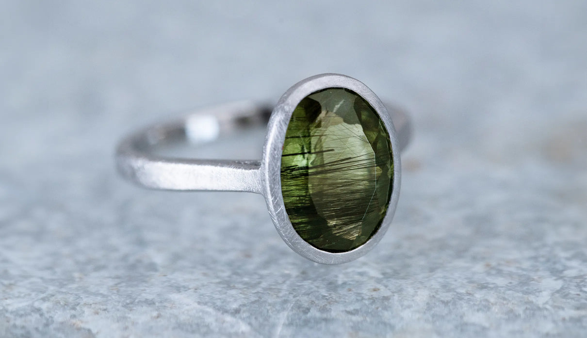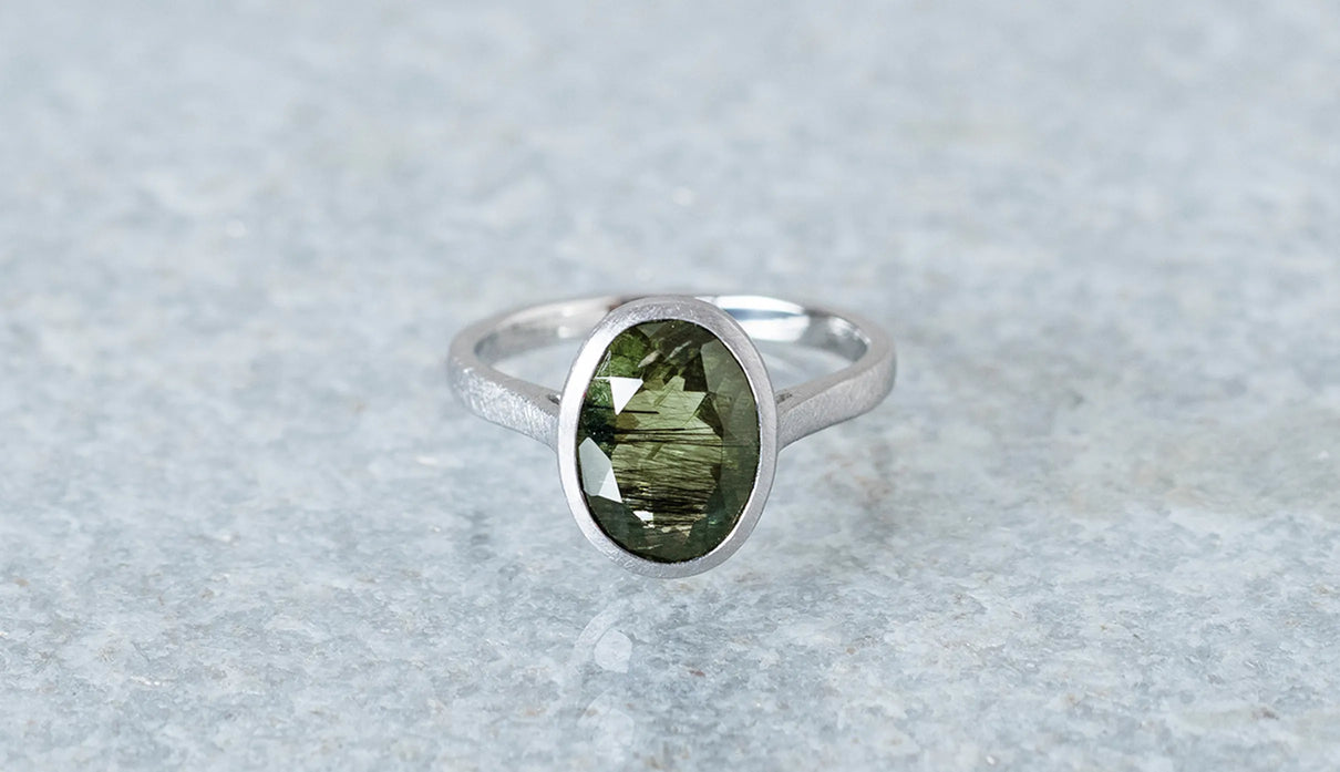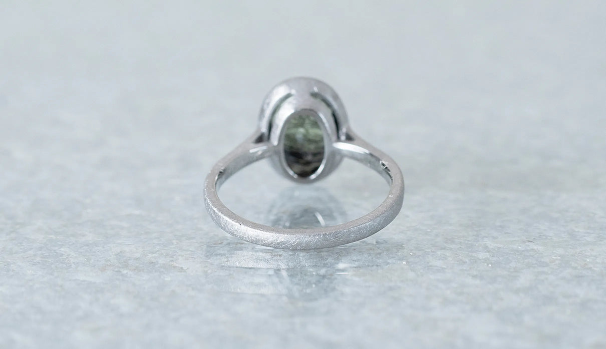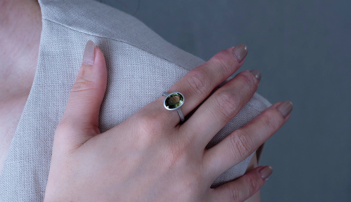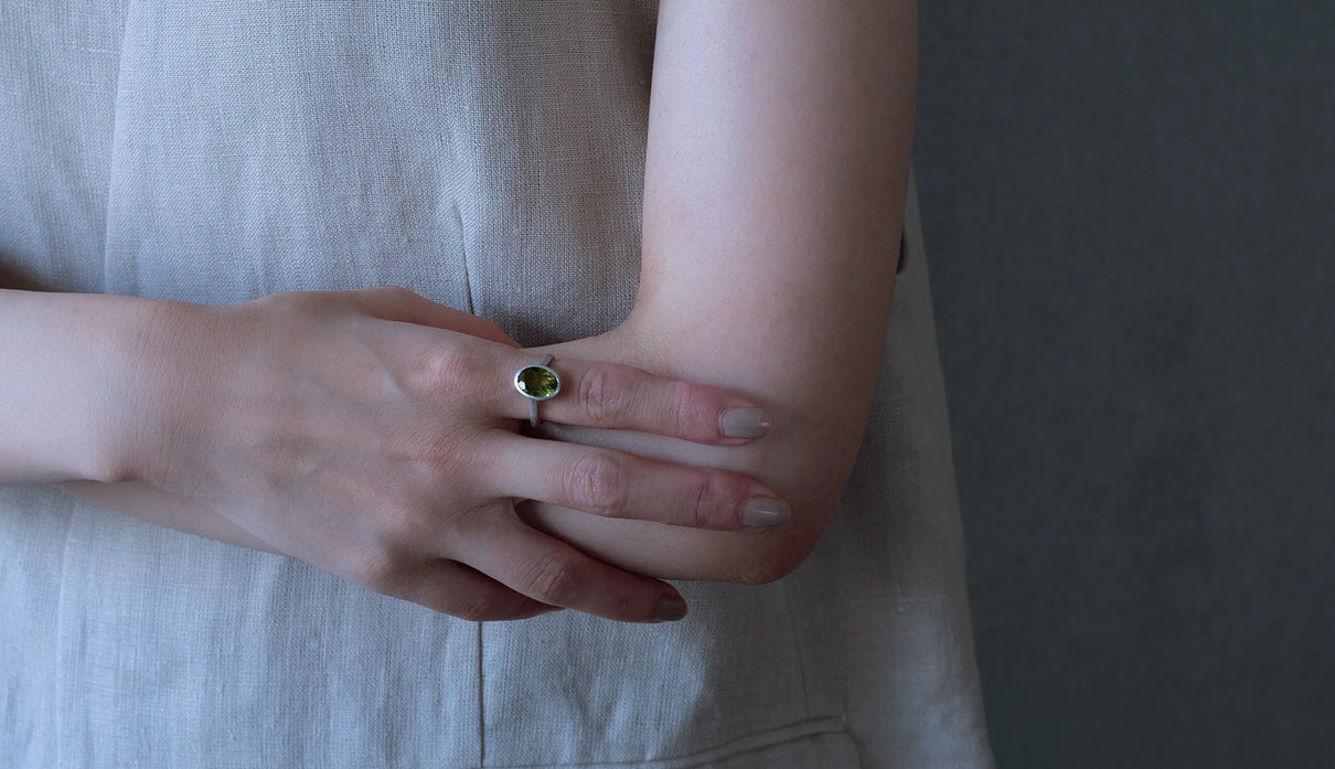 黒色の針状内包物を結晶に閉じ込めた、ルドヴィジャイトペリドットの一点ものリング。この特別なペリドットは、世界で唯一、パキスタン・スワート渓谷でのみ産出される、たいへん希少な宝石です。さらに原石が小さく、採取量もごくわずかとされています。一般的に知られる爽やかなライトグリーンのペリドットとは異なり、深みのあるオリーブグリーンの色調と、横方向に伸びる様々な太さの黒いインクルージョンが静かな個性を際立たせる、オーバルカットのピース。その特別な石を、マットな質感のプラチナの石座で包み込み、落ち着いた華やぎをた湛えるリングに仕立てています。日常の装いにそっと寄り添いながらも、確かな存在感を放つ一点。8月の誕生石としても親しまれるペリドットは、8月生まれの方への贈りものにもおすすめです。