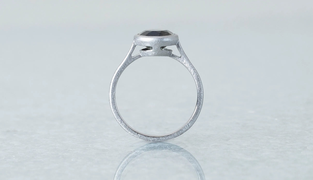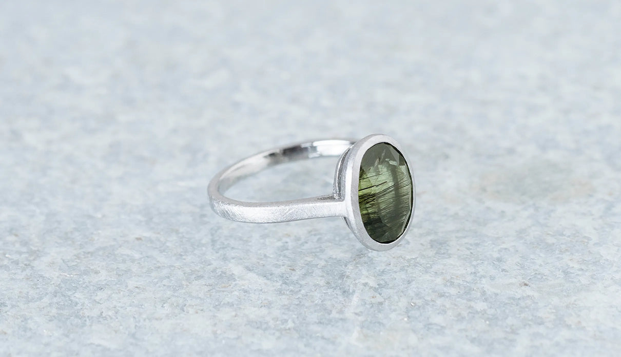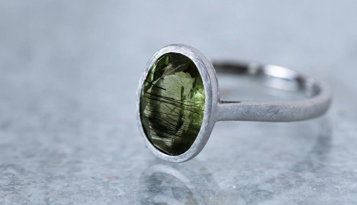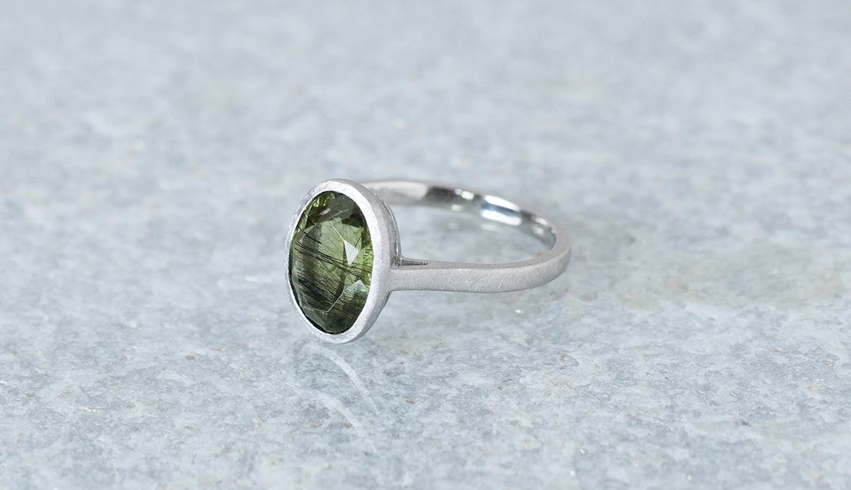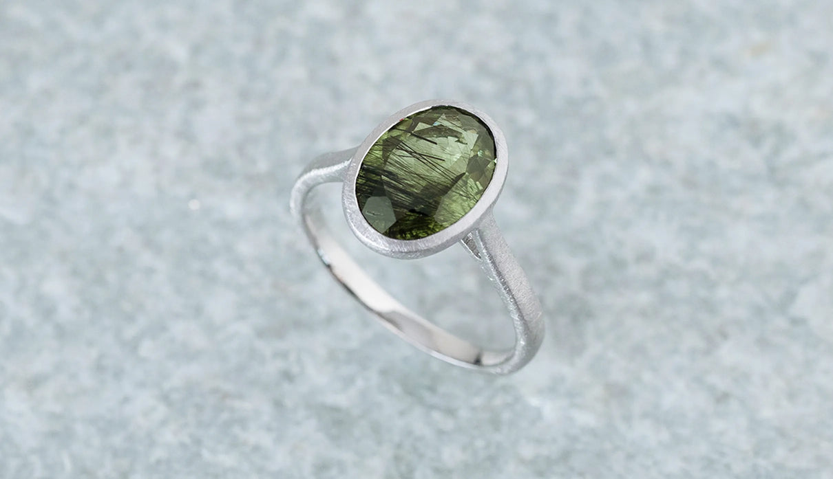 黒色の針状内包物を結晶に閉じ込めた、ルドヴィジャイトペリドットの一点ものリング。この特別なペリドットは、世界で唯一、パキスタン・スワート渓谷でのみ産出される、たいへん希少な宝石です。さらに原石が小さく、採取量もごくわずかとされています。一般的に知られる爽やかなライトグリーンのペリドットとは異なり、深みのあるオリーブグリーンの色調と、横方向に伸びる様々な太さの黒いインクルージョンが静かな個性を際立たせる、オーバルカットのピース。その特別な石を、マットな質感のプラチナの石座で包み込み、落ち着いた華やぎをた湛えるリングに仕立てています。日常の装いにそっと寄り添いながらも、確かな存在感を放つ一点。8月の誕生石としても親しまれるペリドットは、8月生まれの方への贈りものにもおすすめです。