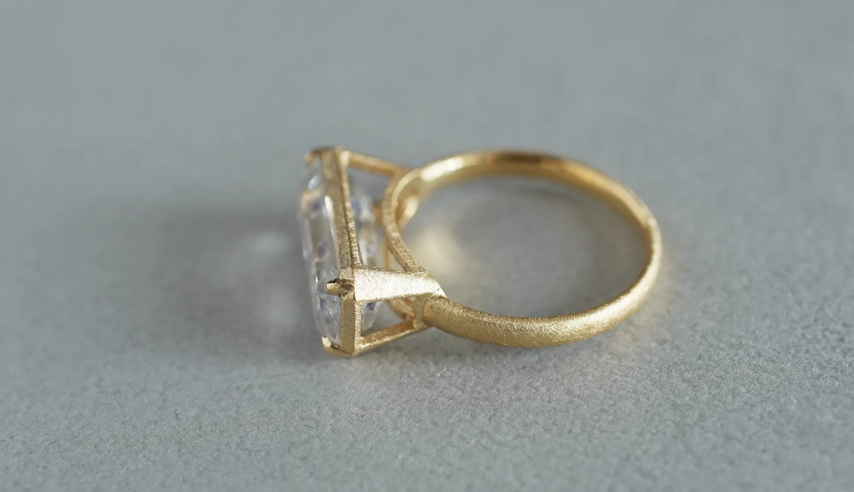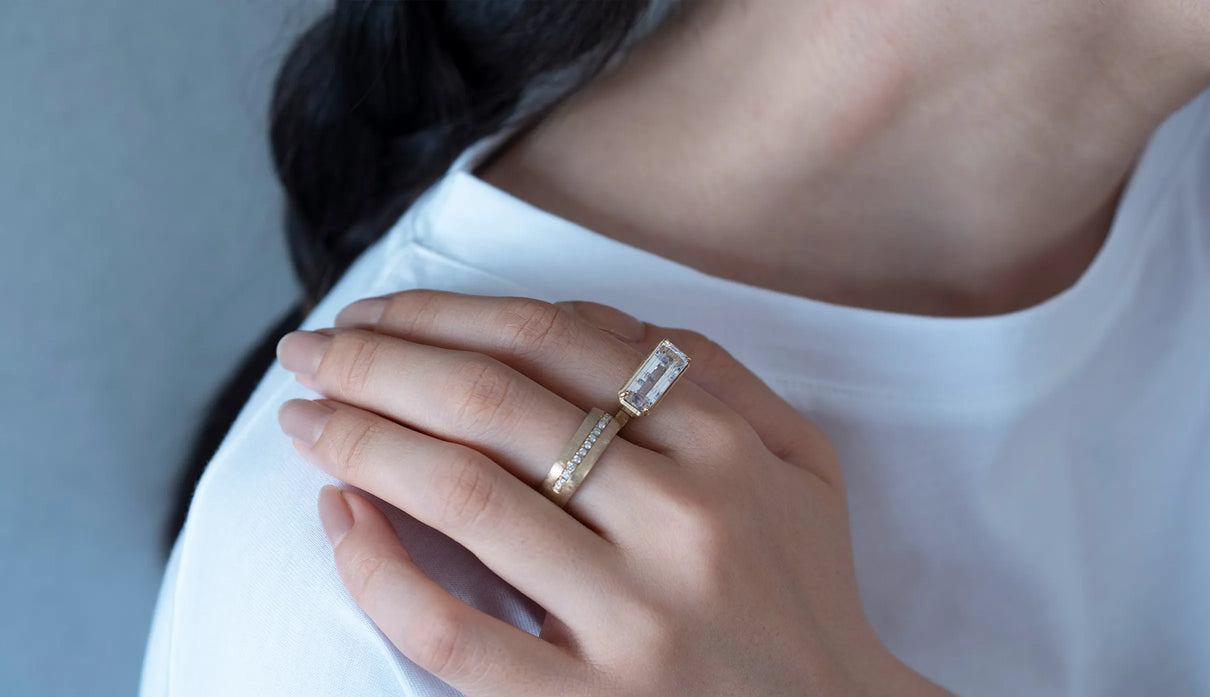 フローライトを内包した、希少な "フローライトインクォーツ" で仕立てた一点もののリング。フローライトは紫外線や熱に反応して柔らかな光を放つことから、「蛍石(ほたるいし)」とも呼ばれてきました。硬度が低いため標本として親しまれることが多い鉱石ですが、その結晶が水晶の中に閉じ込められたインクォーツは一転して希少性を増し、産地は世界でもわずか二か所、現在では採掘も困難とされています。今回のリングに用いたのは、高い透明度を誇る横長のバゲットカットの水晶。その中で、りんどう色のフローライトが重力から解き放たれたようにふんわりと漂います。石座はマットに仕立て、前後左右から光をたっぷりと取り込み、瑞々しい輝きを引き出しました。日常の装いにほどよい華やかさと上品さを添えてくれる、特別なリングです。